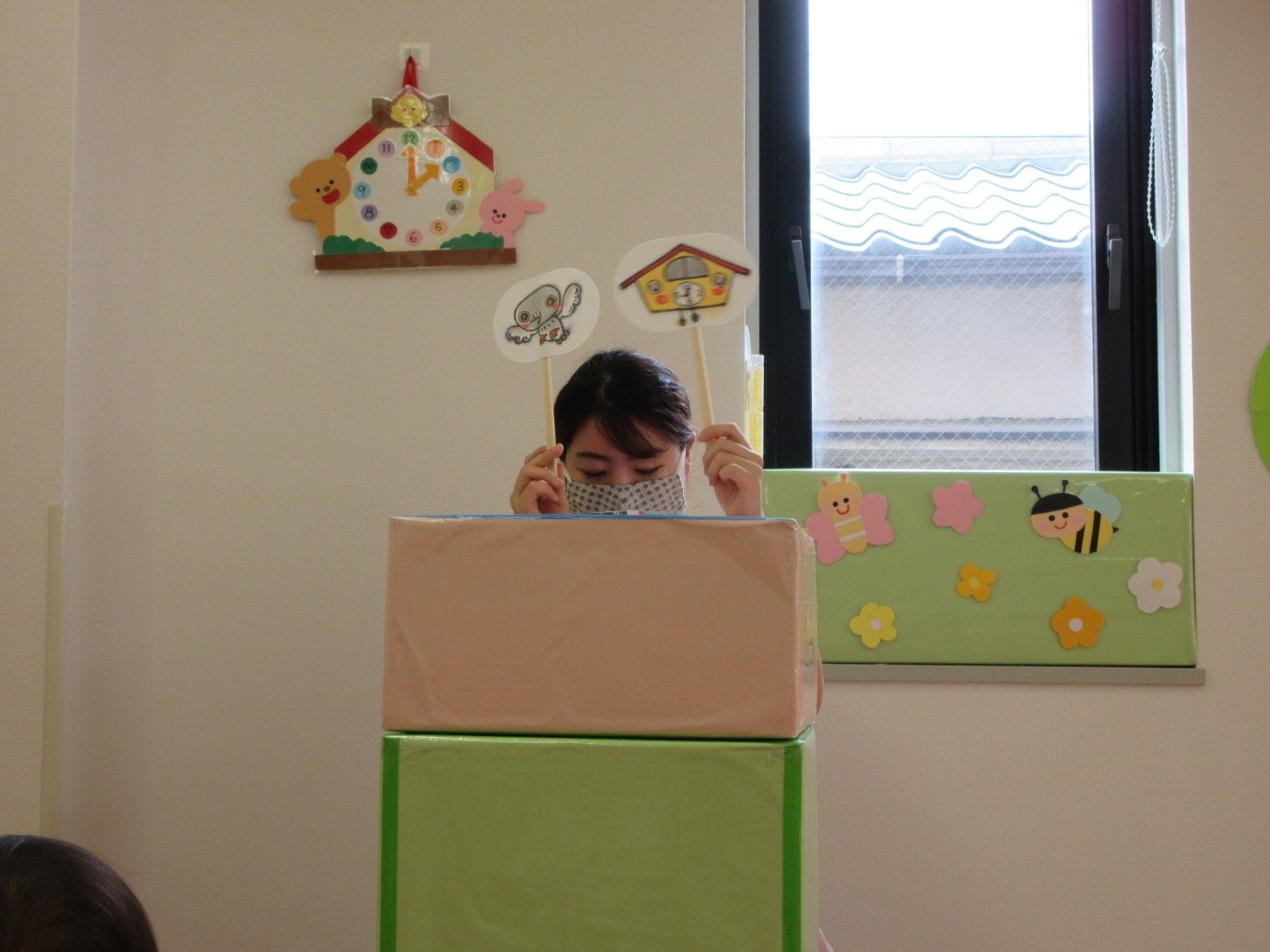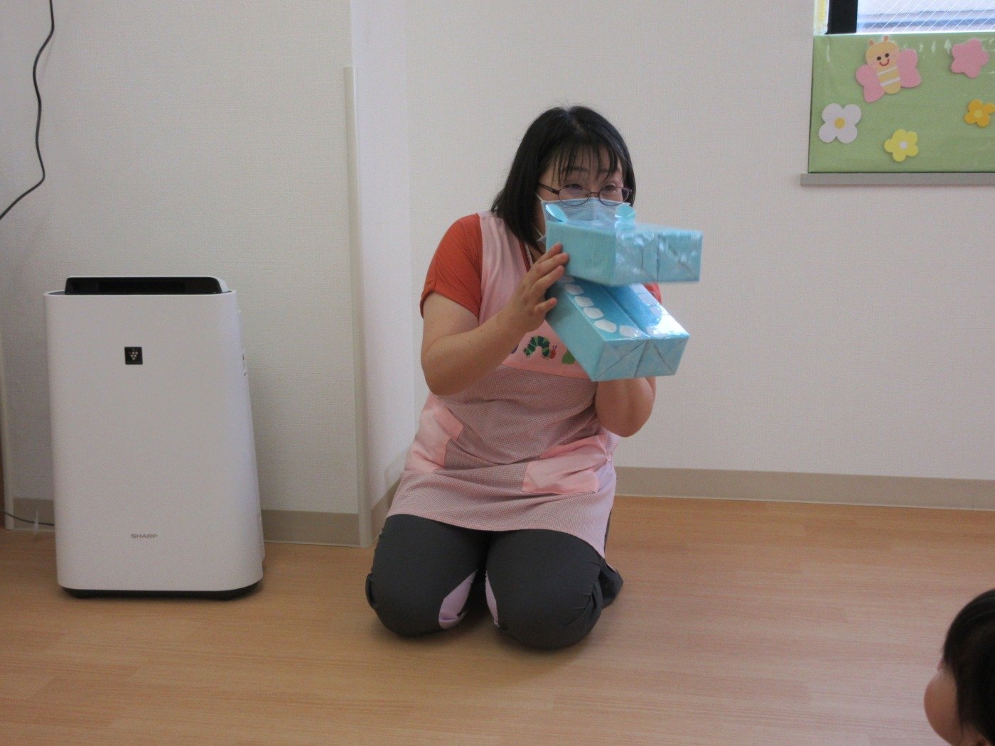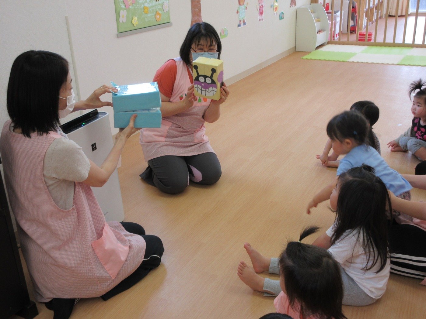 先生からは、パネルシアター「おべんとうばこ」のプレゼント♪いろいろな食べ物のオンパレードにおめめキラキラの子どもたちでした。