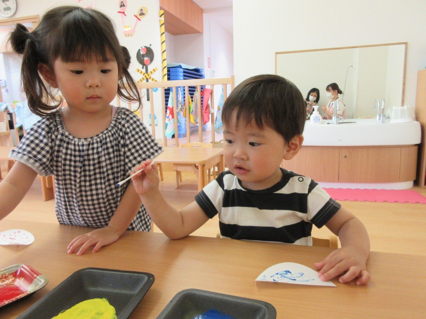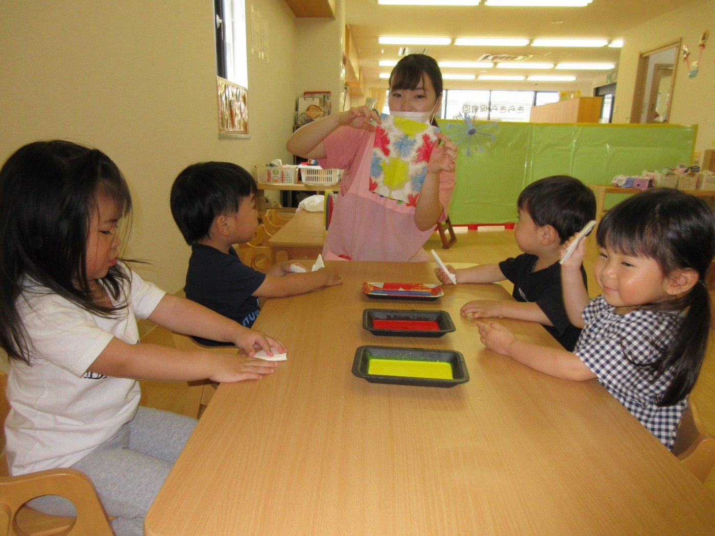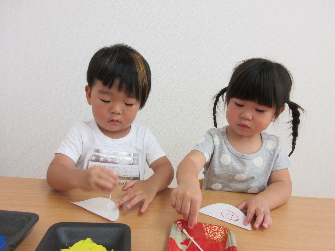 絵の具を使ってにじみ絵にしたり、のりでペタペタ丸型や星型をつなげたり…