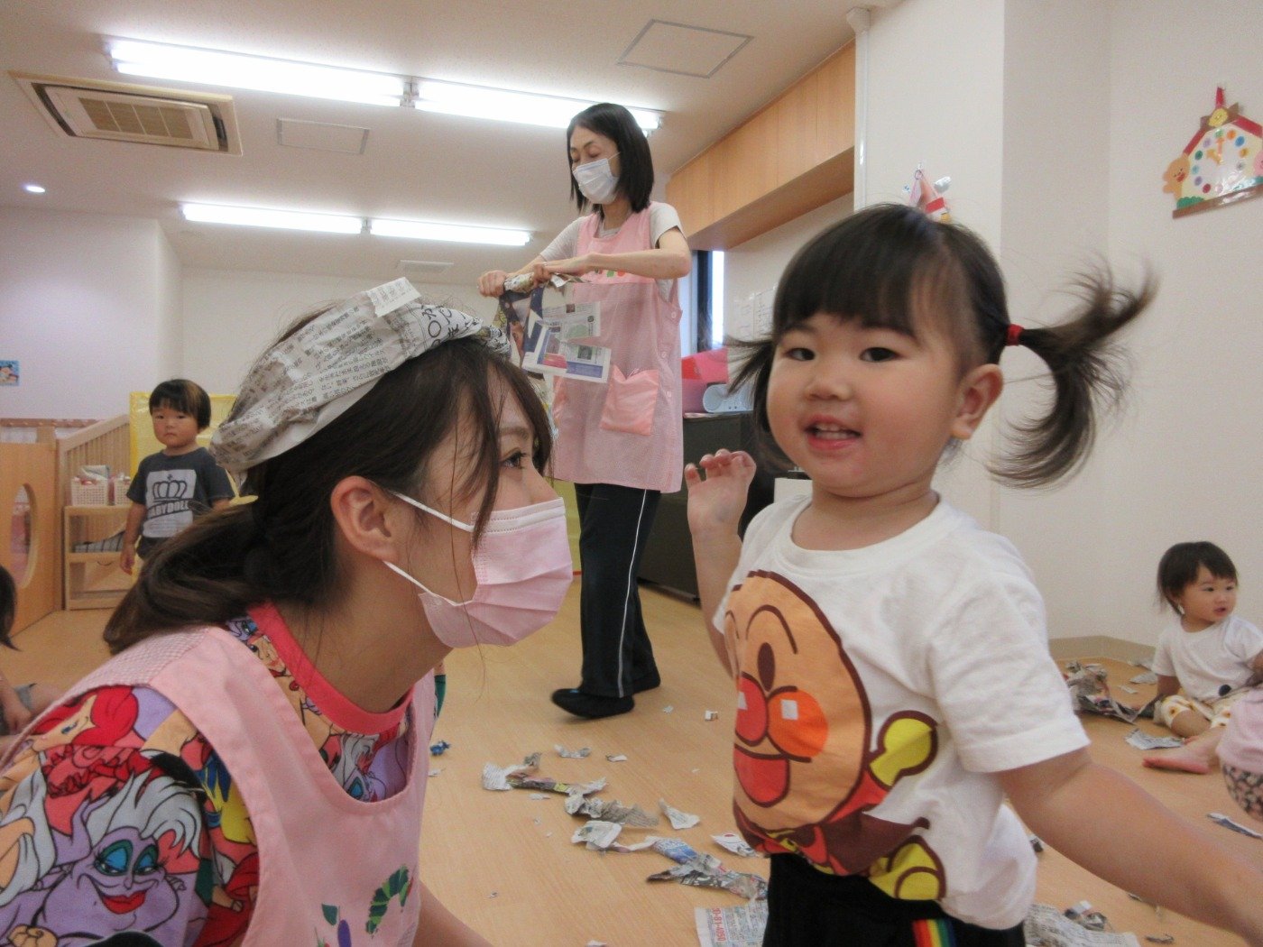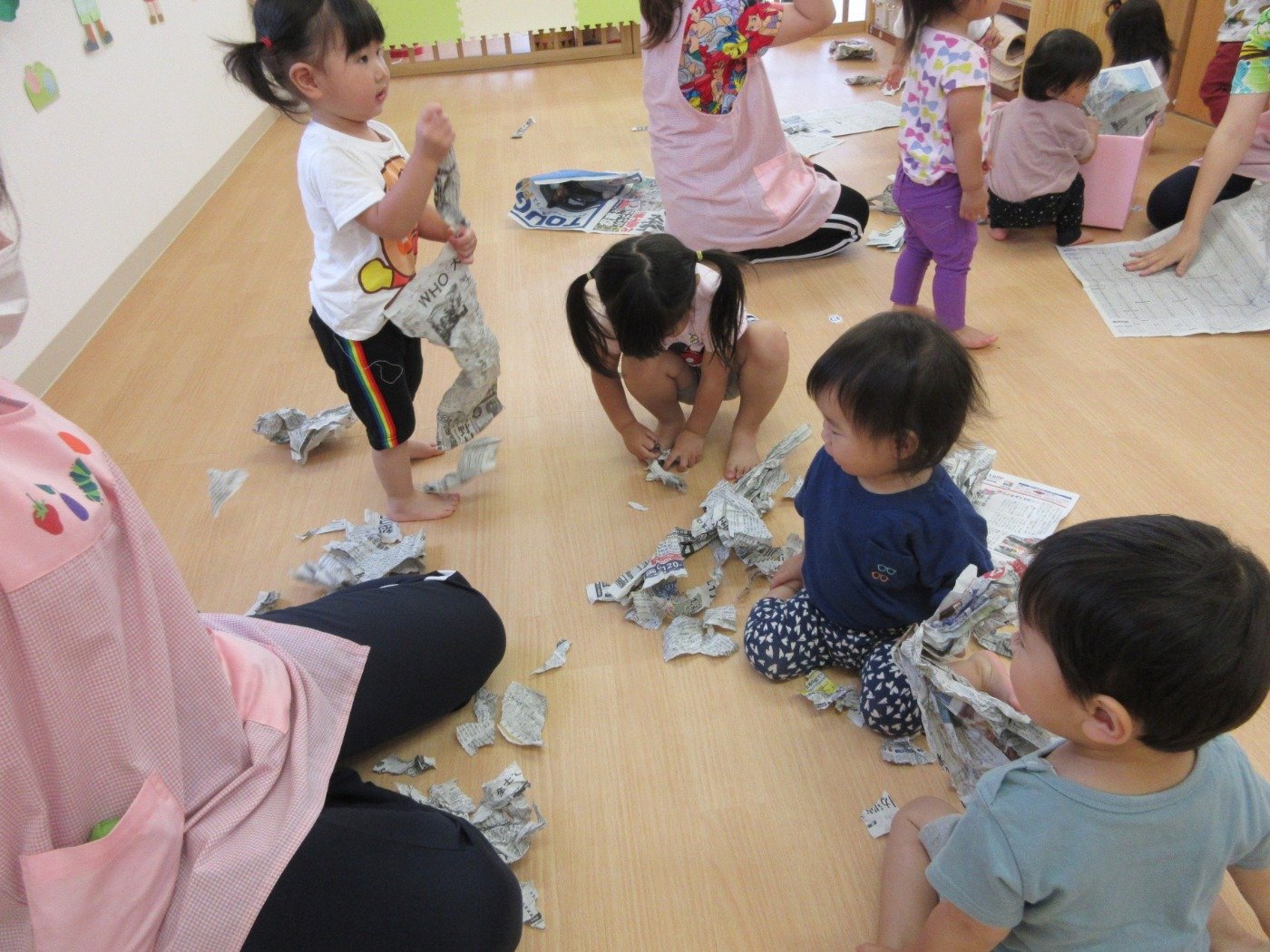 朝からずっと雨模様のある日…今日はお外に行けないね。そうだ!みんなで新聞紙遊びをしよう♪