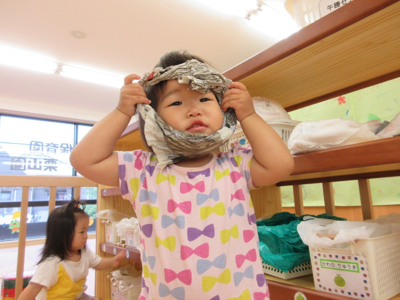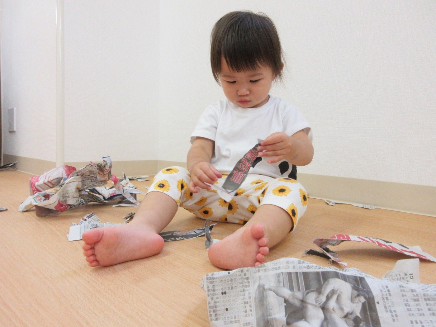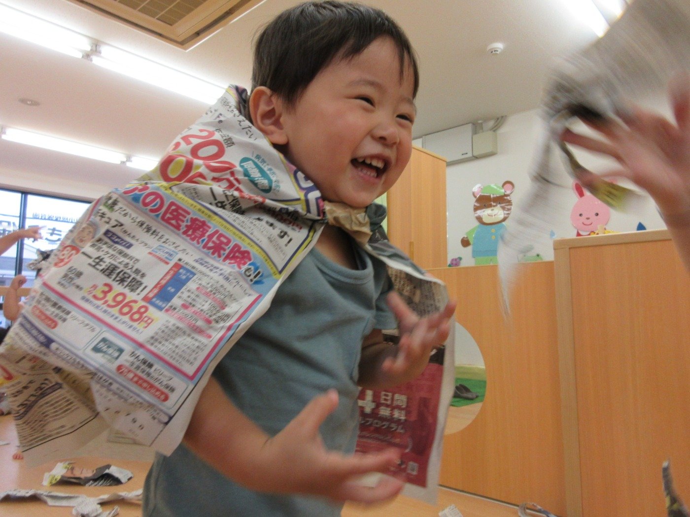 小さな手に新聞紙を持ち、思い思いの遊びを楽しんでいました。