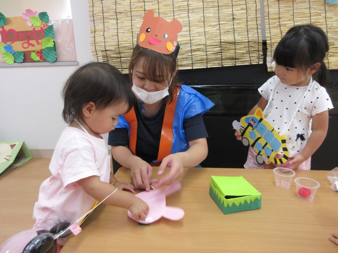好きなお面を選んでから自分でお目目を貼ります。可愛いお顔ができたね。