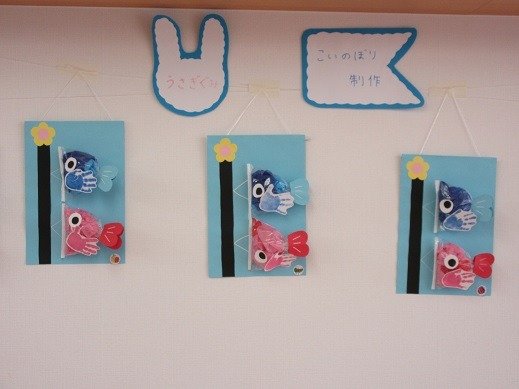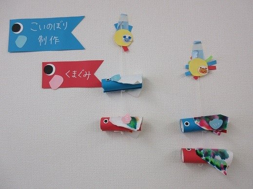 「できたよー!」完成したこいのぼりに大満足、大喜びの子どもたちです。