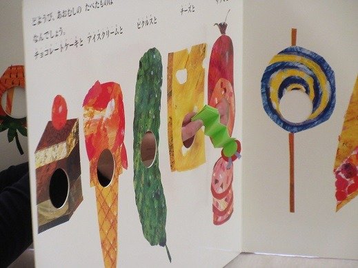 あおむしさんが絵本の中に入って色々な食べ物を食べていき…