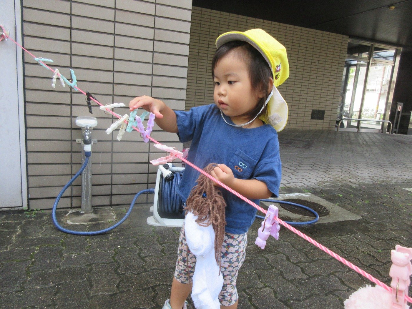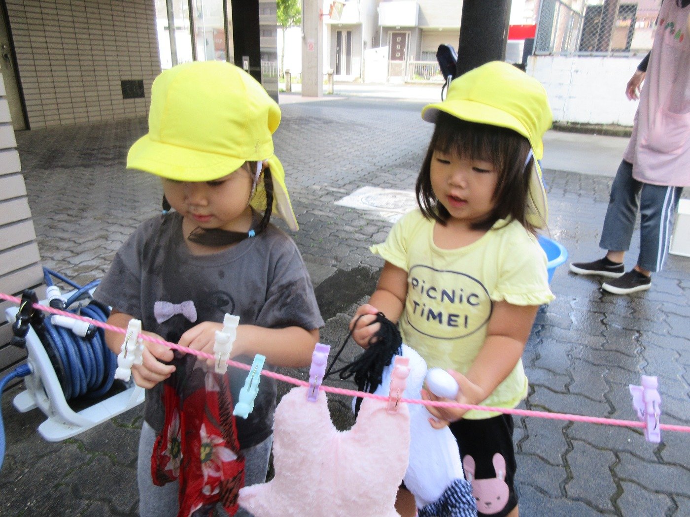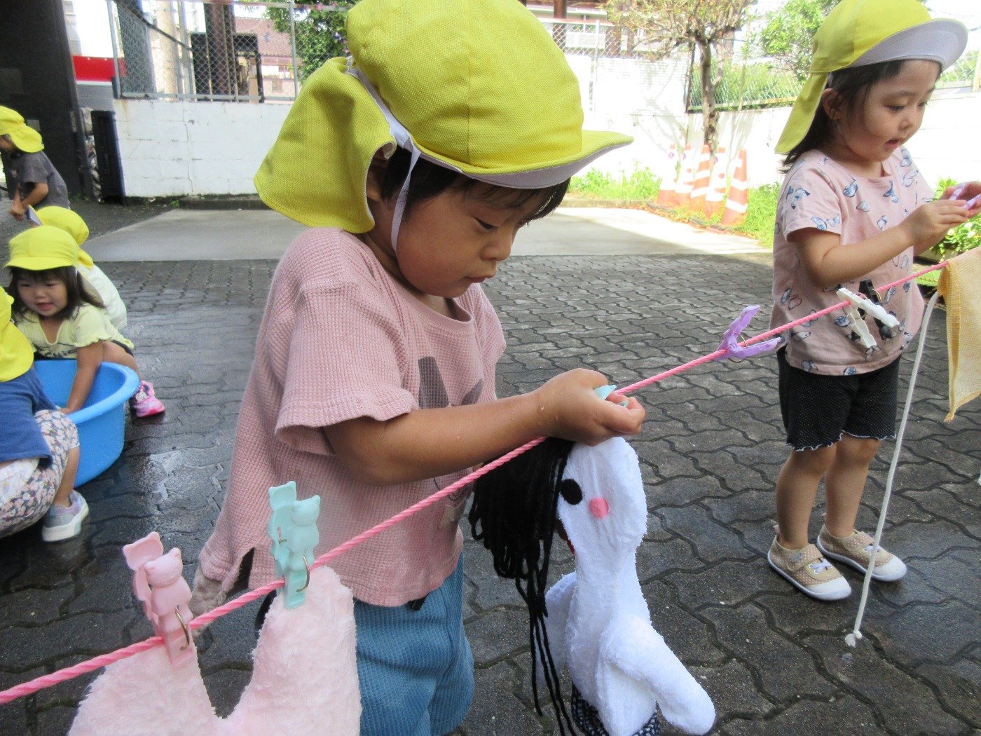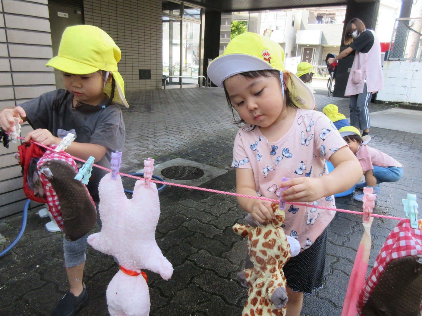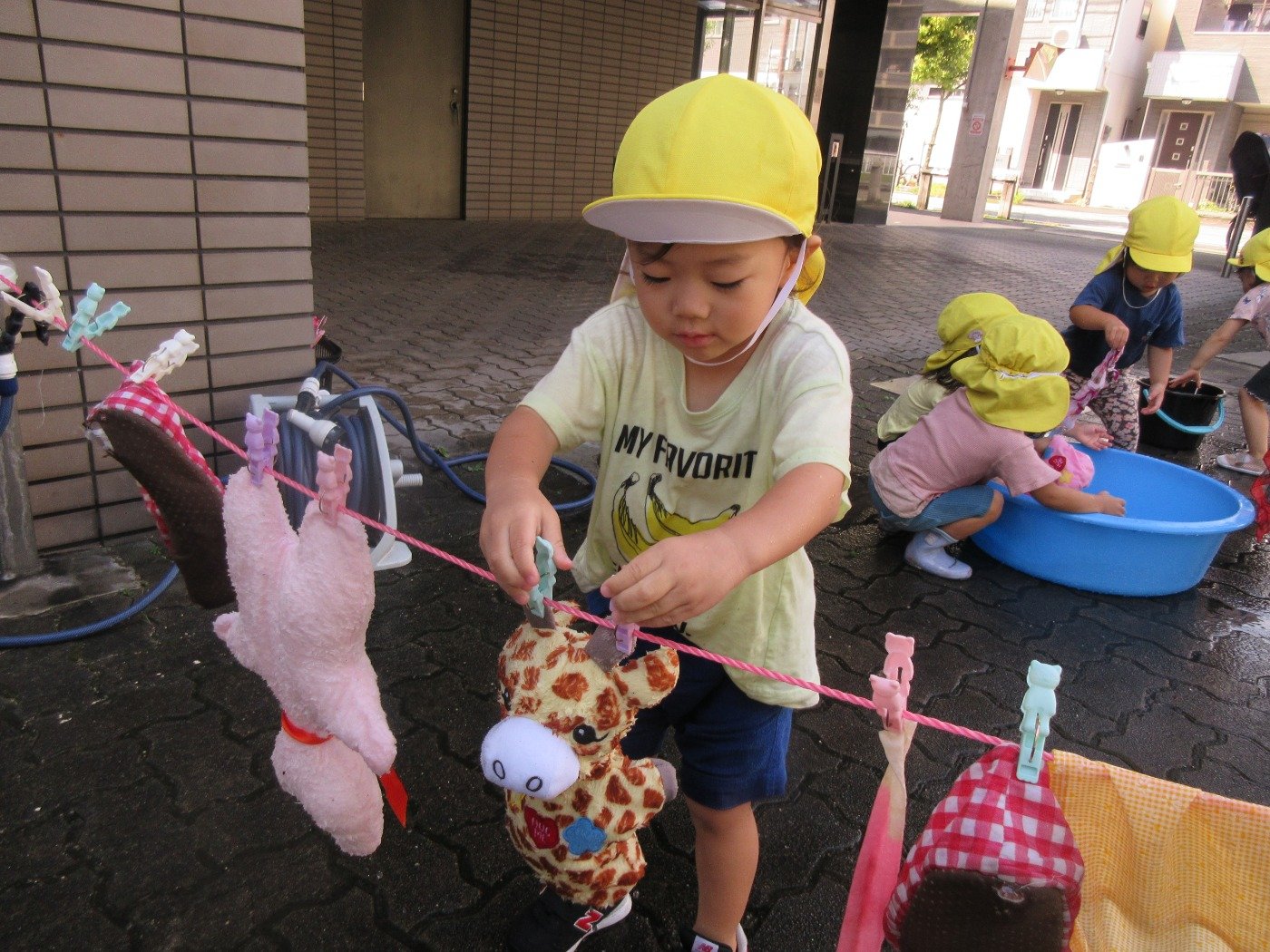 夏日だった9月の初旬、くま組さんは、お洗濯ごっこをしました。
