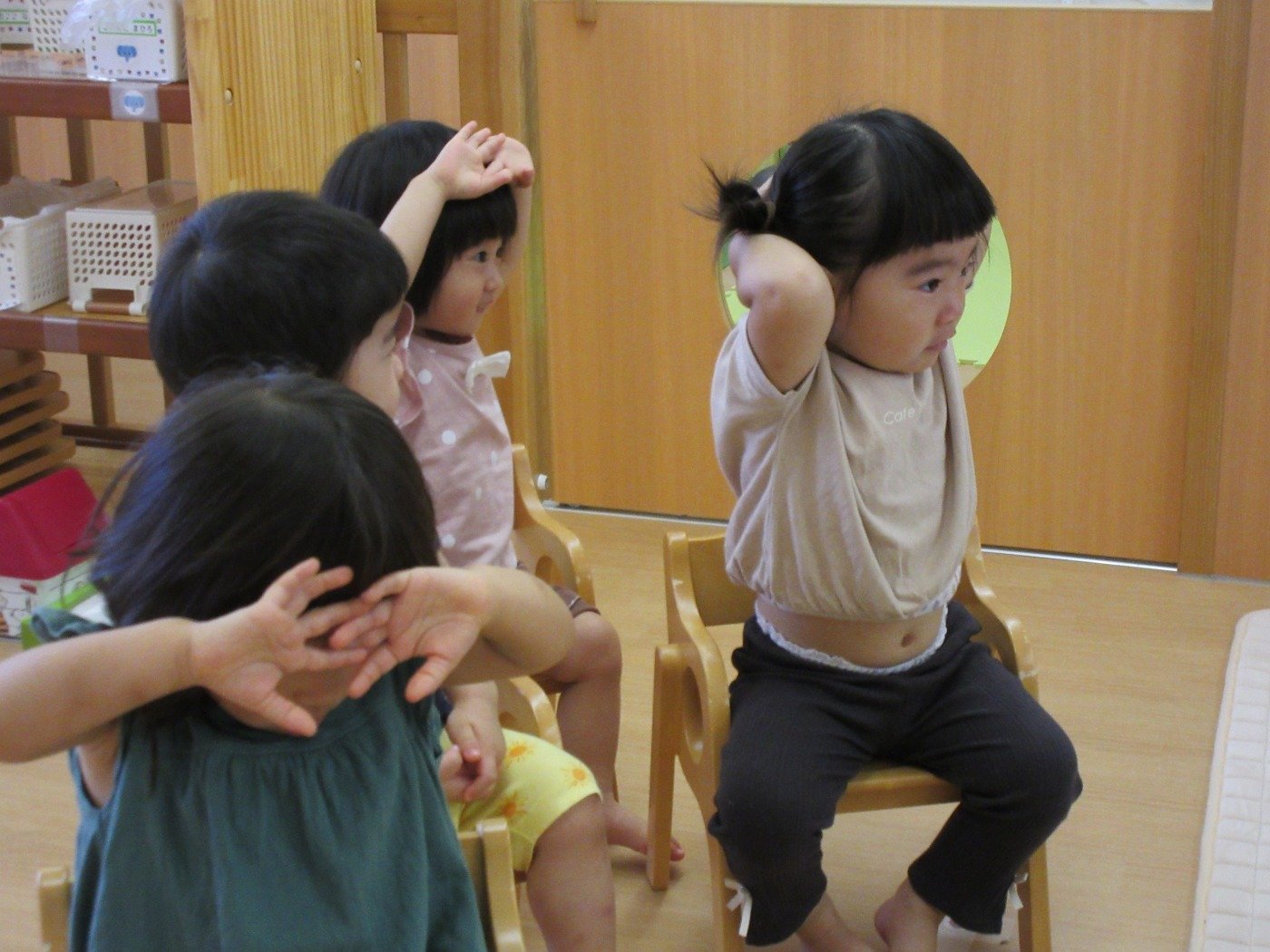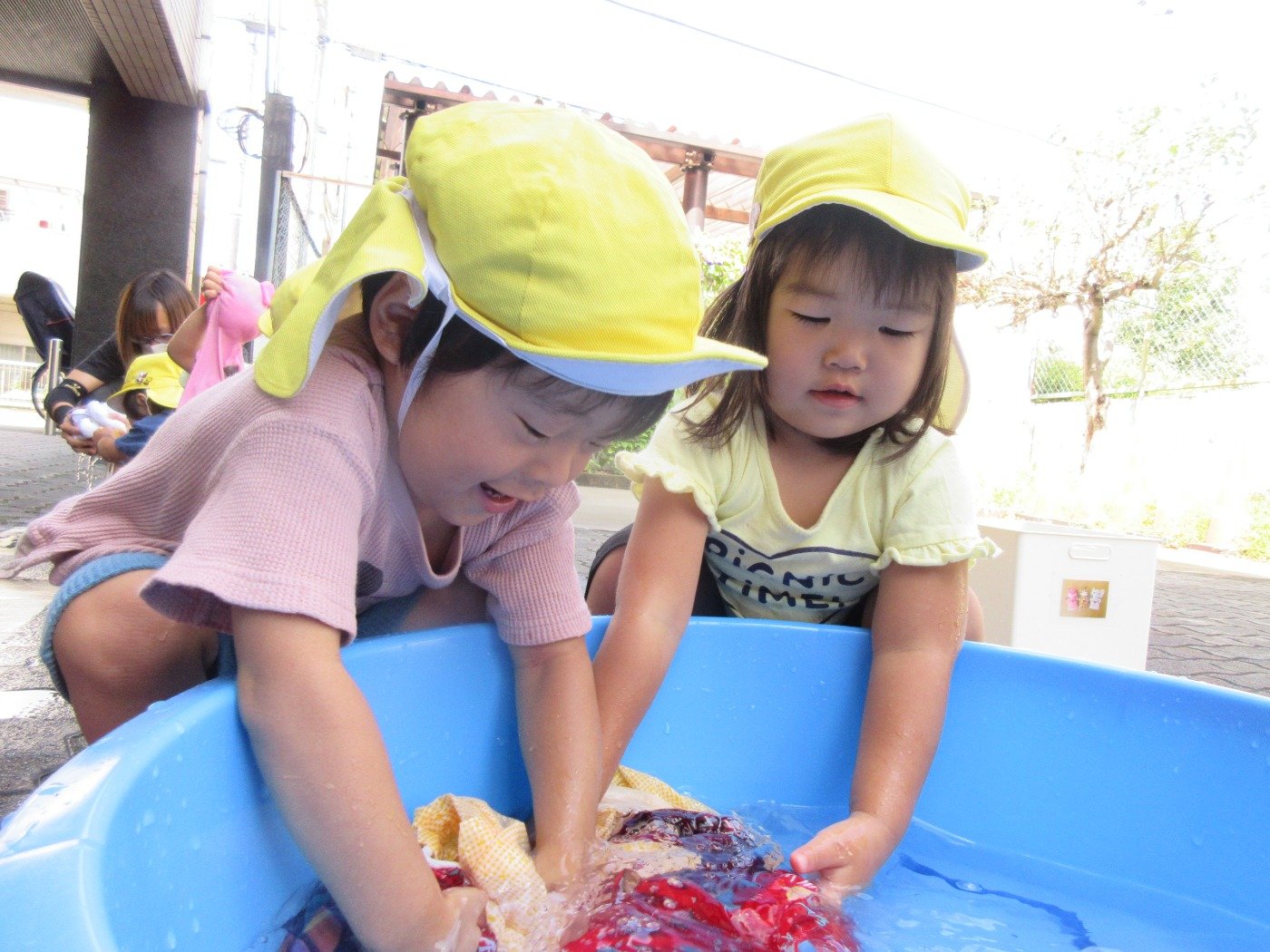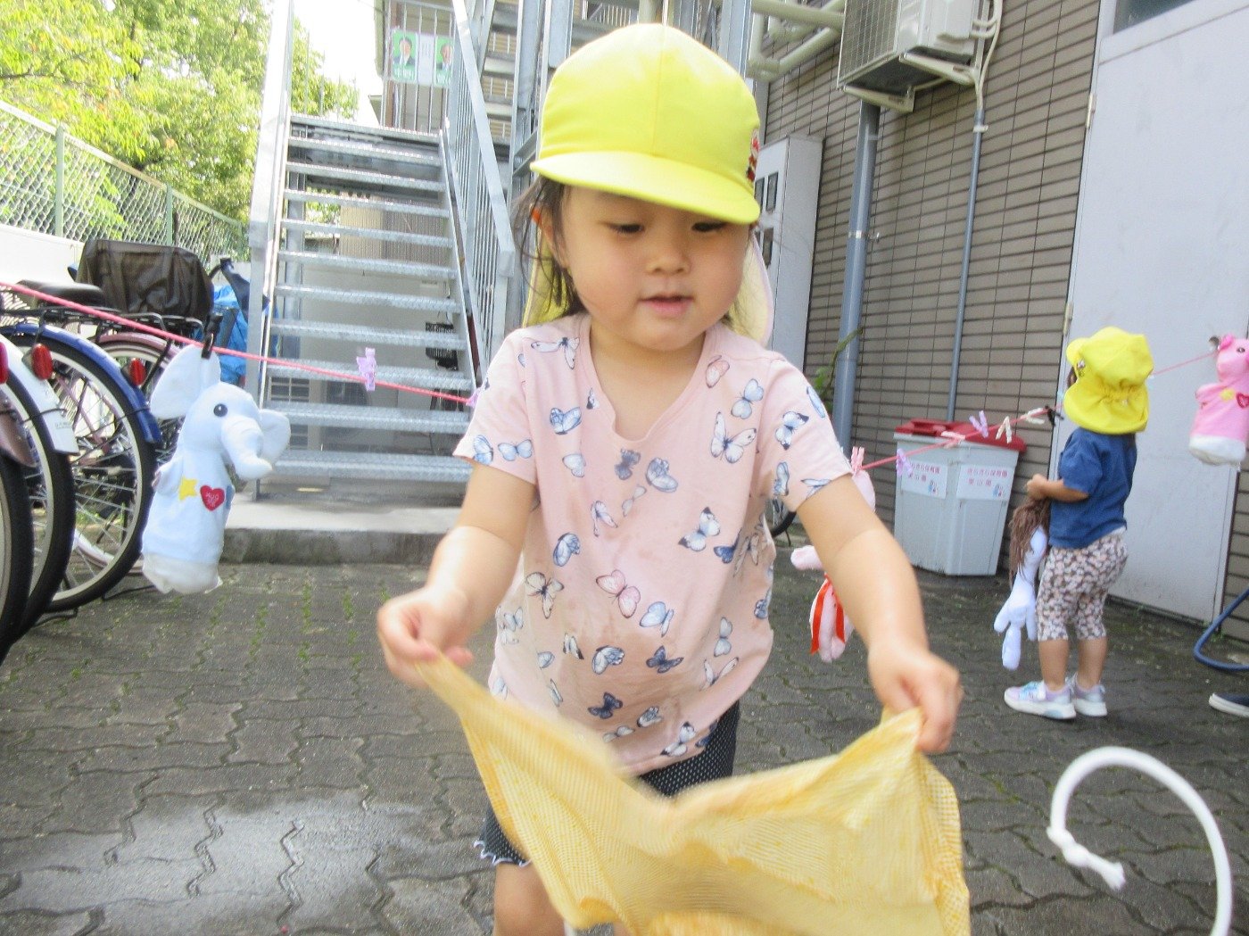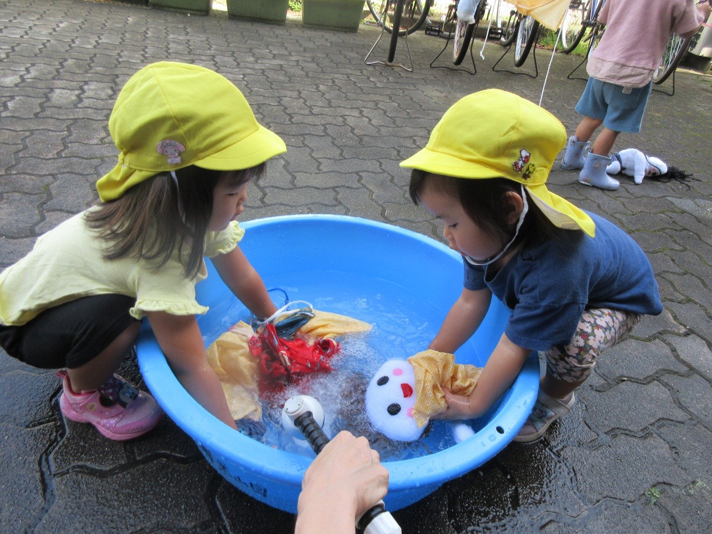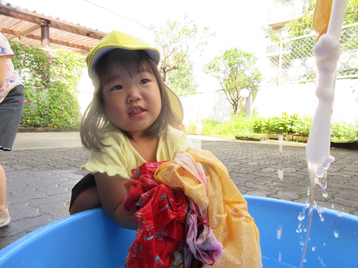 夏日だった9月の初旬、くま組さんは、お洗濯ごっこをしました。