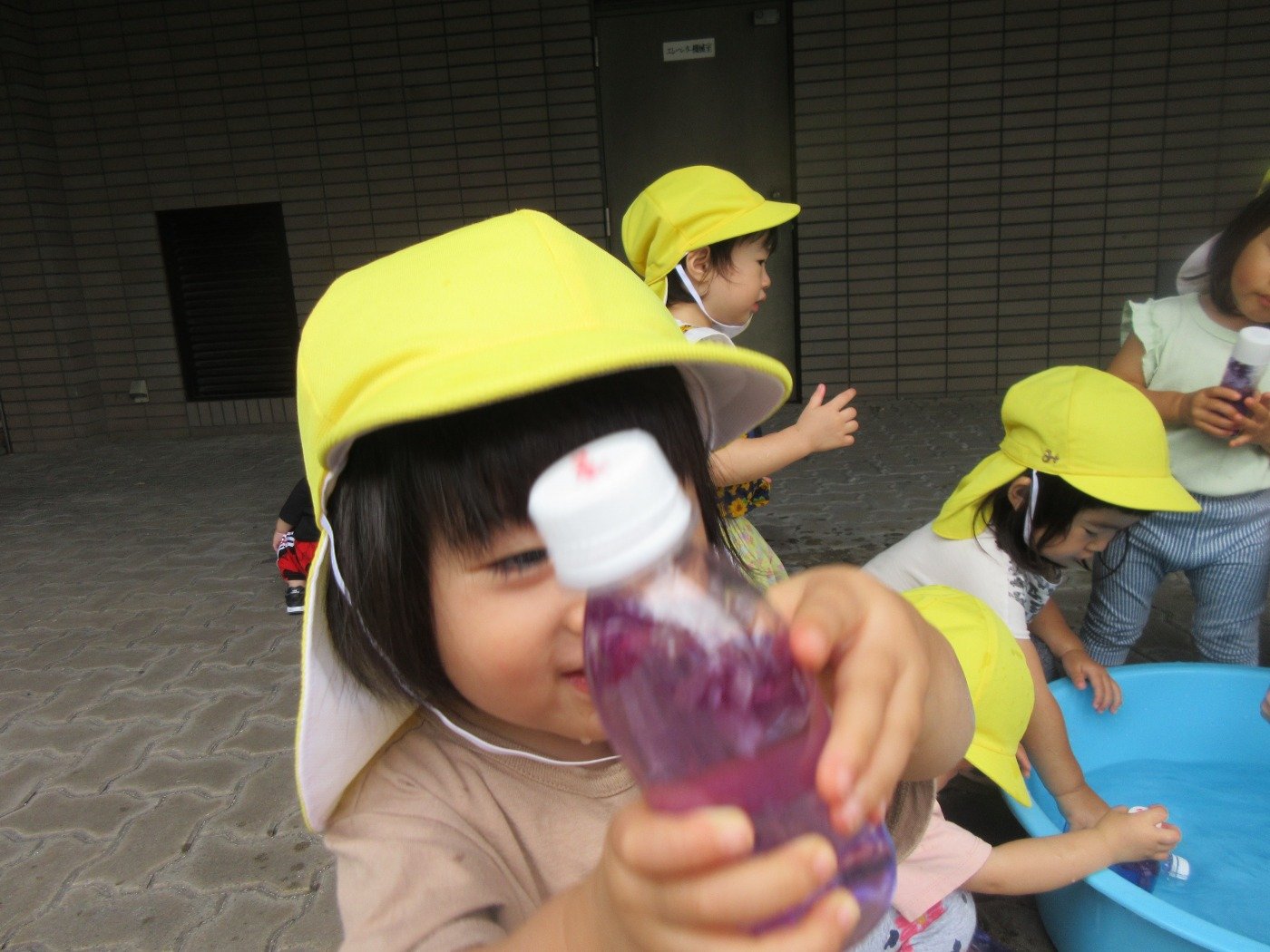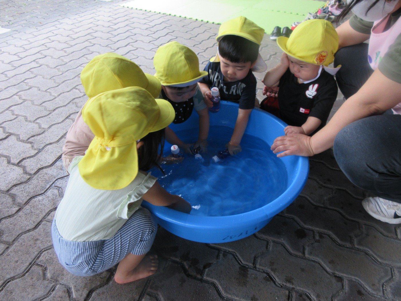 色水の入った容器を水に浮かべると、とっても綺麗☆