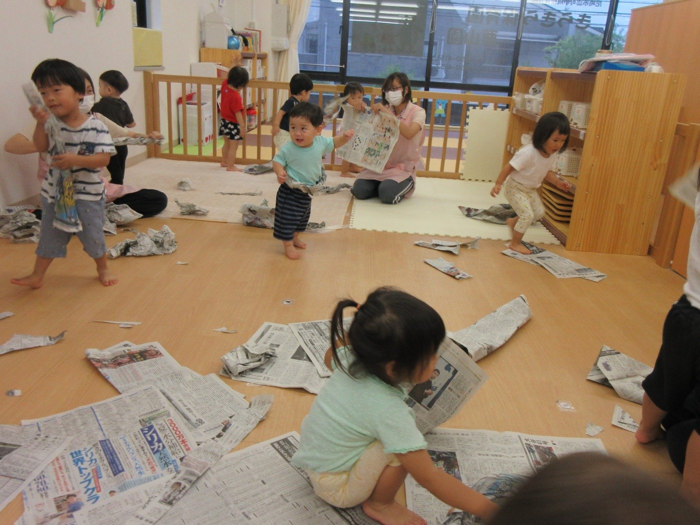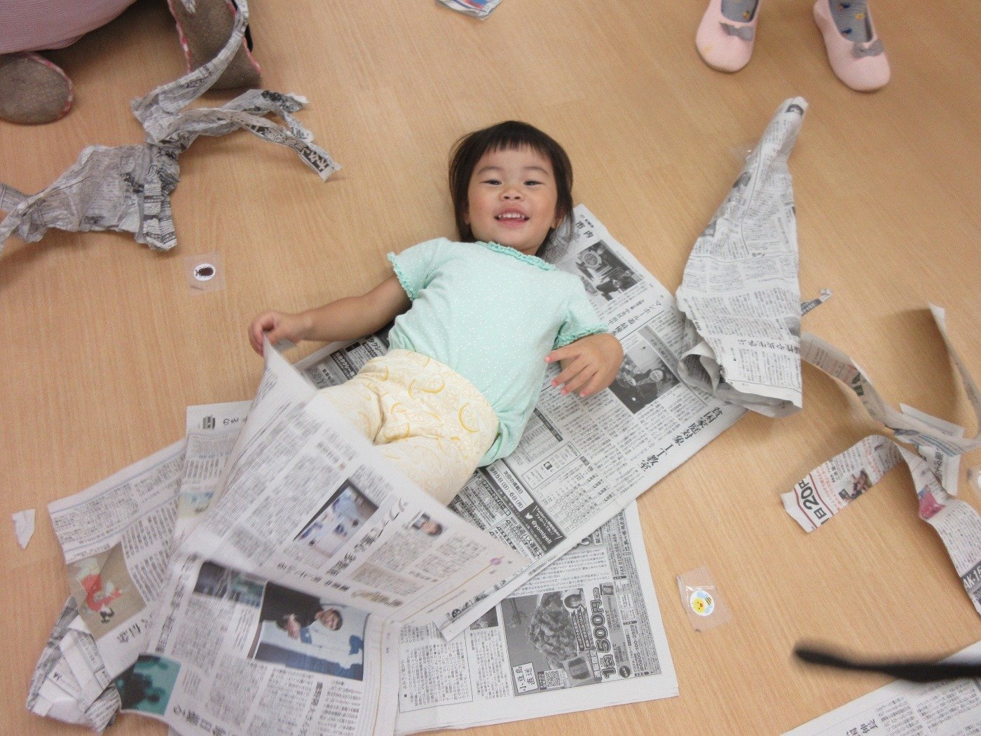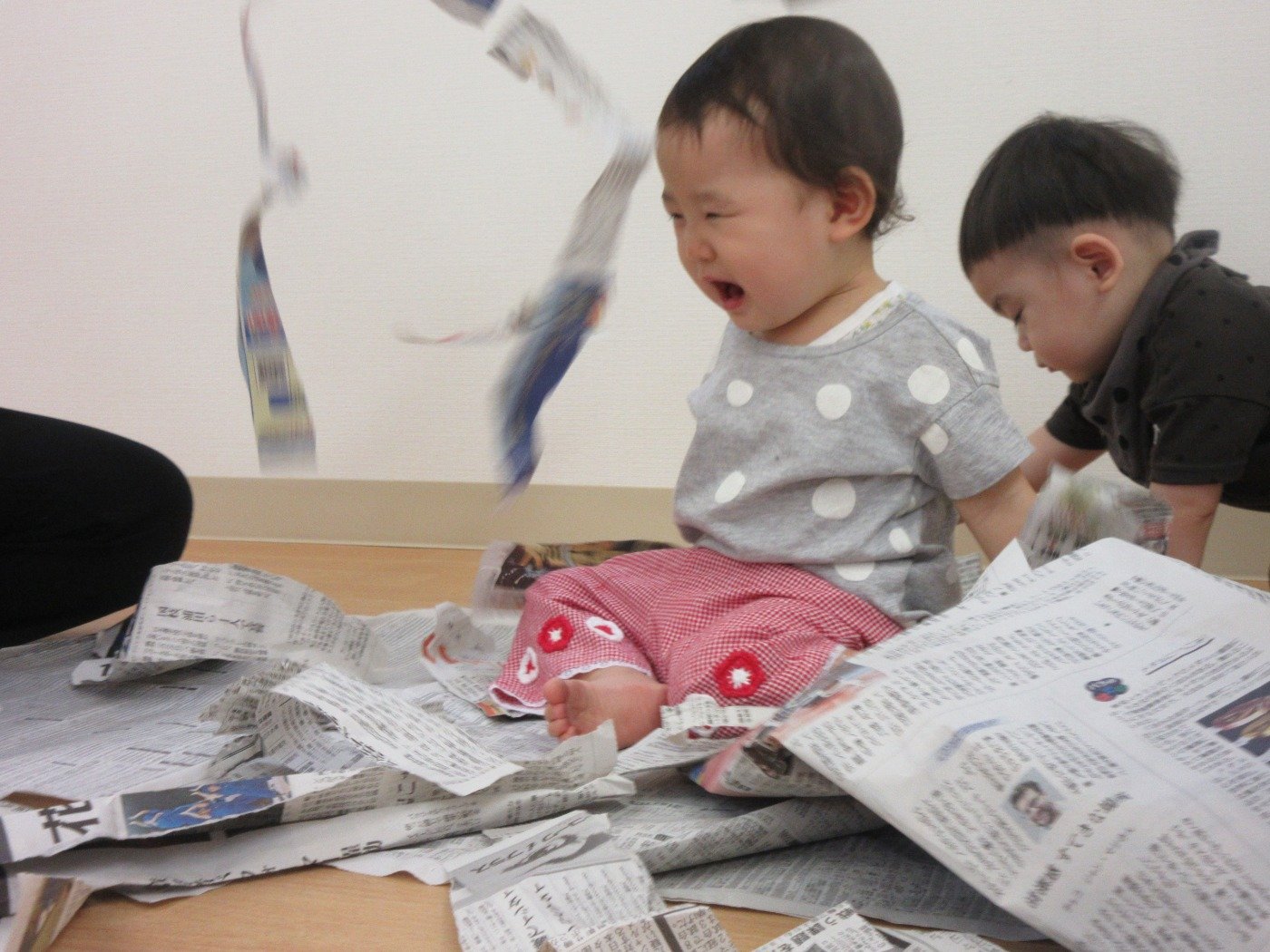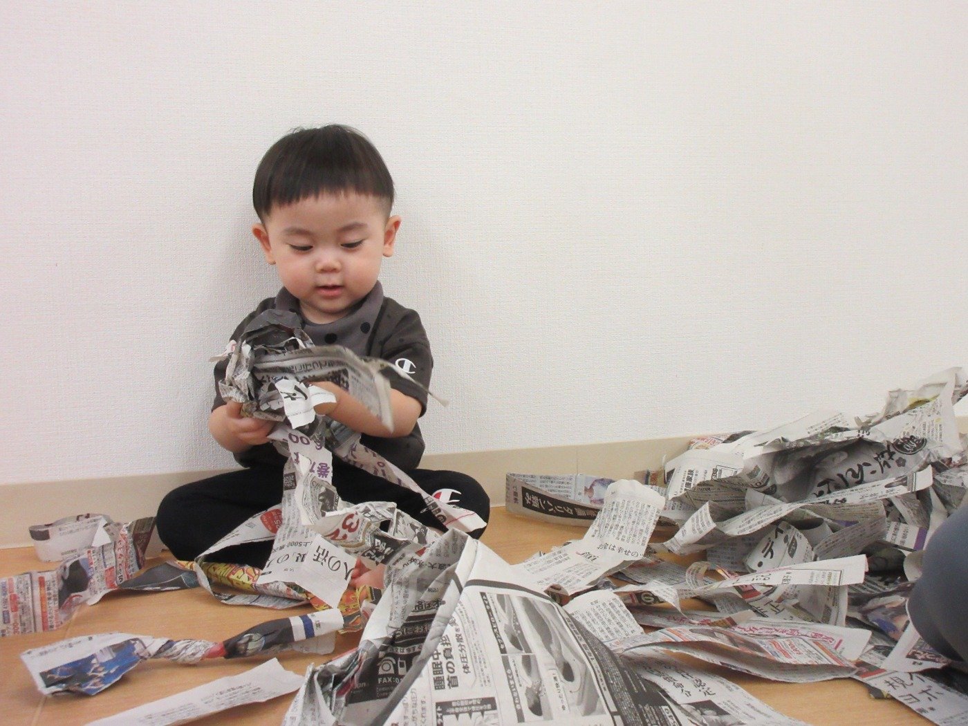 お部屋いっぱいに広がった新聞紙を、今度は「よーいドン」で
