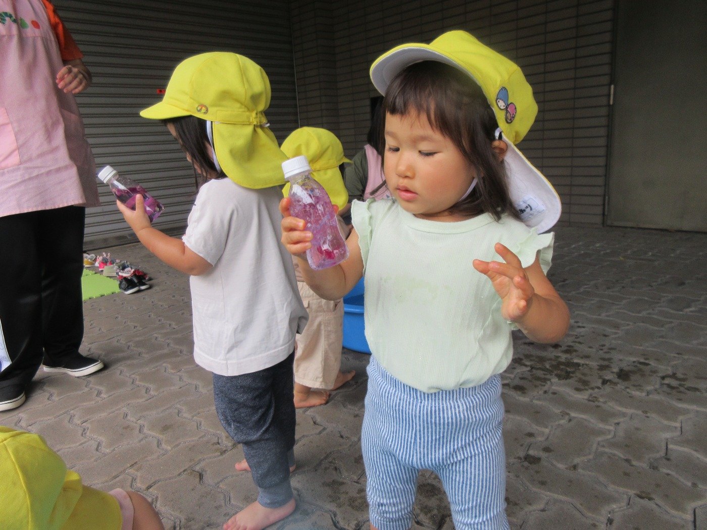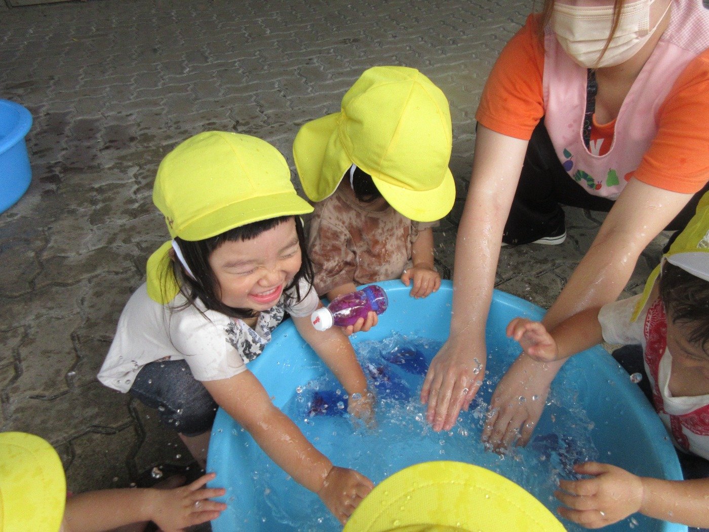 子どもたちは、容器でクルクル水をかき混ぜかき混ぜ