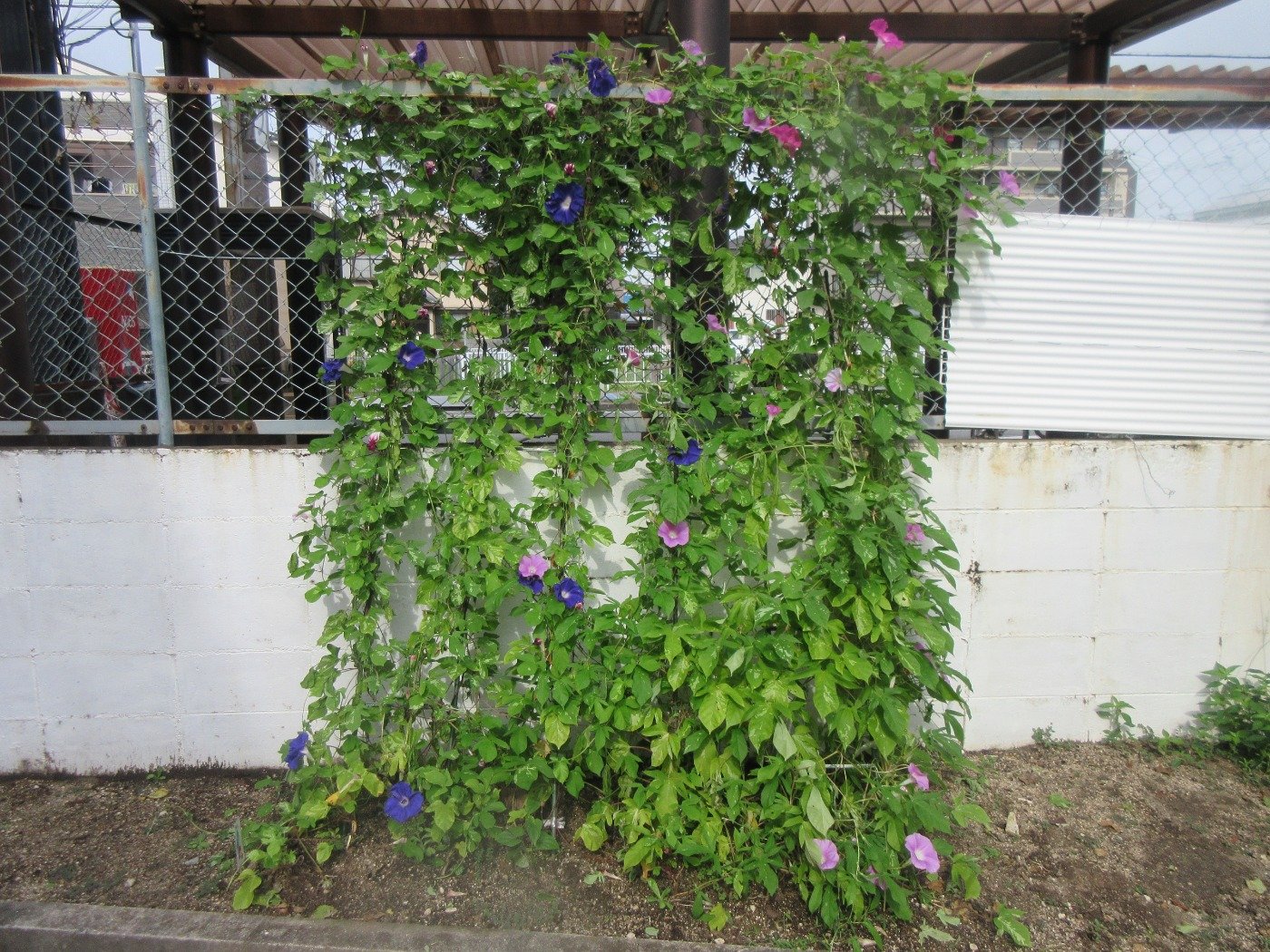 園前の朝顔は、夏が過ぎても元気いっぱいに花を咲かせて