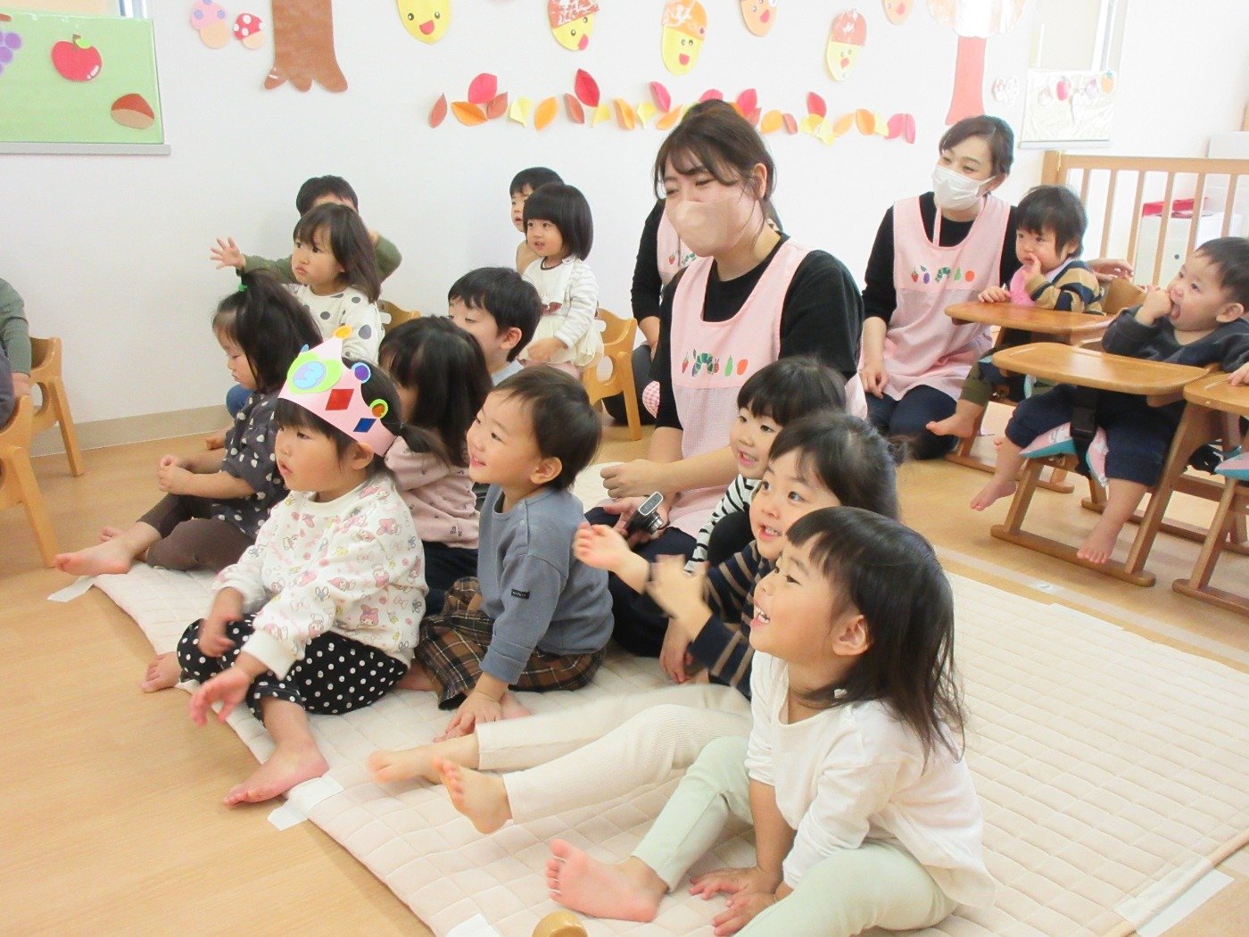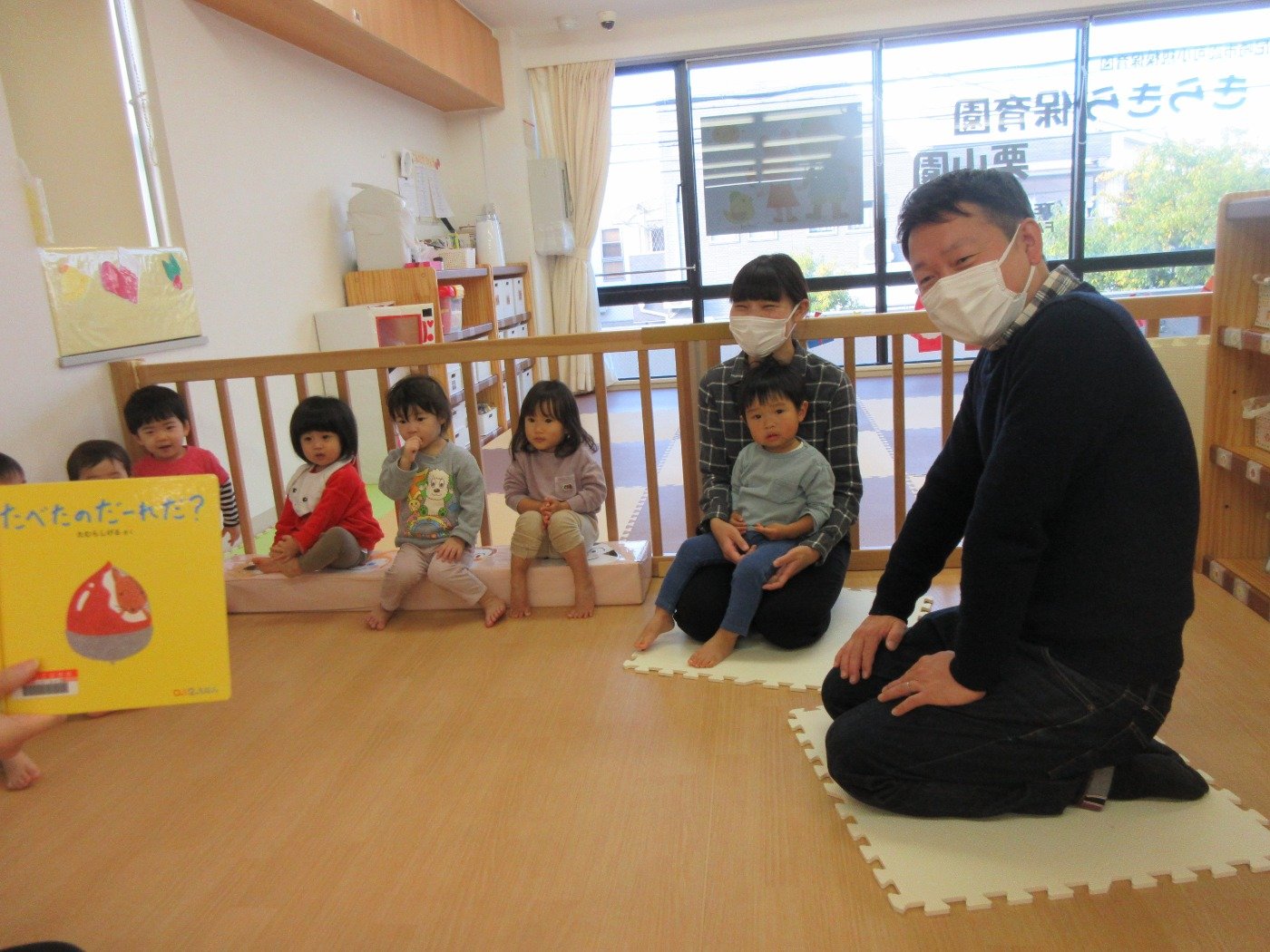 「きちんと座ってお話聞いてるー。」