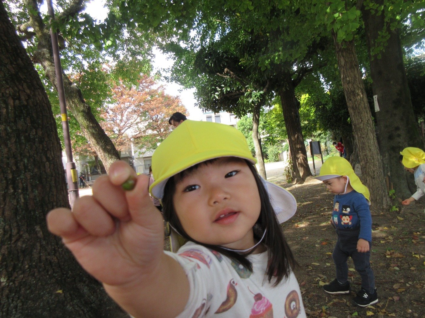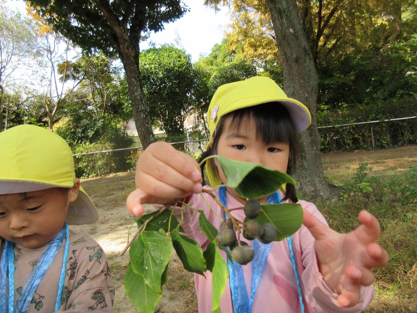 「あったー!」と木の実や葉っぱ、石ころなどなど…