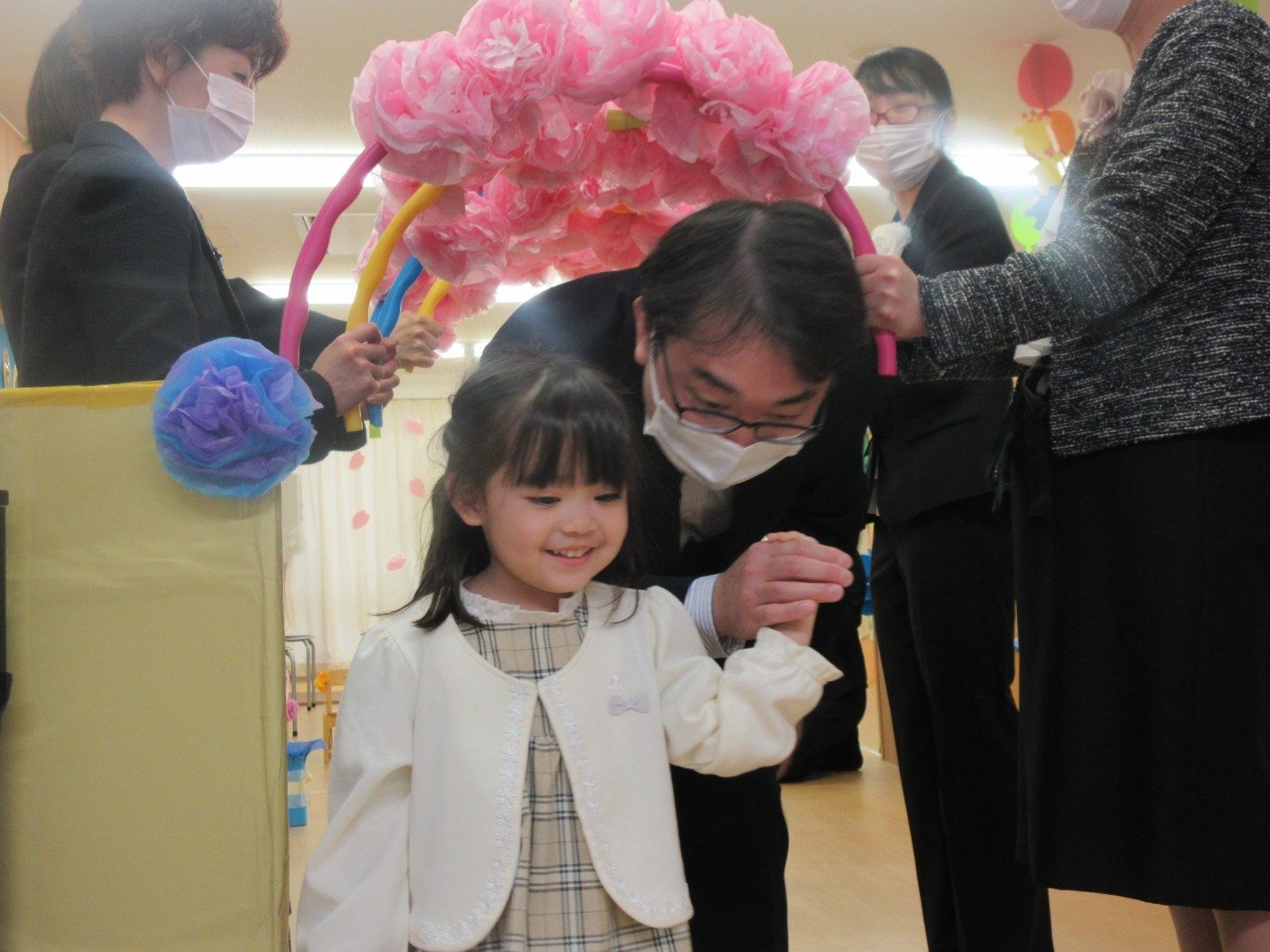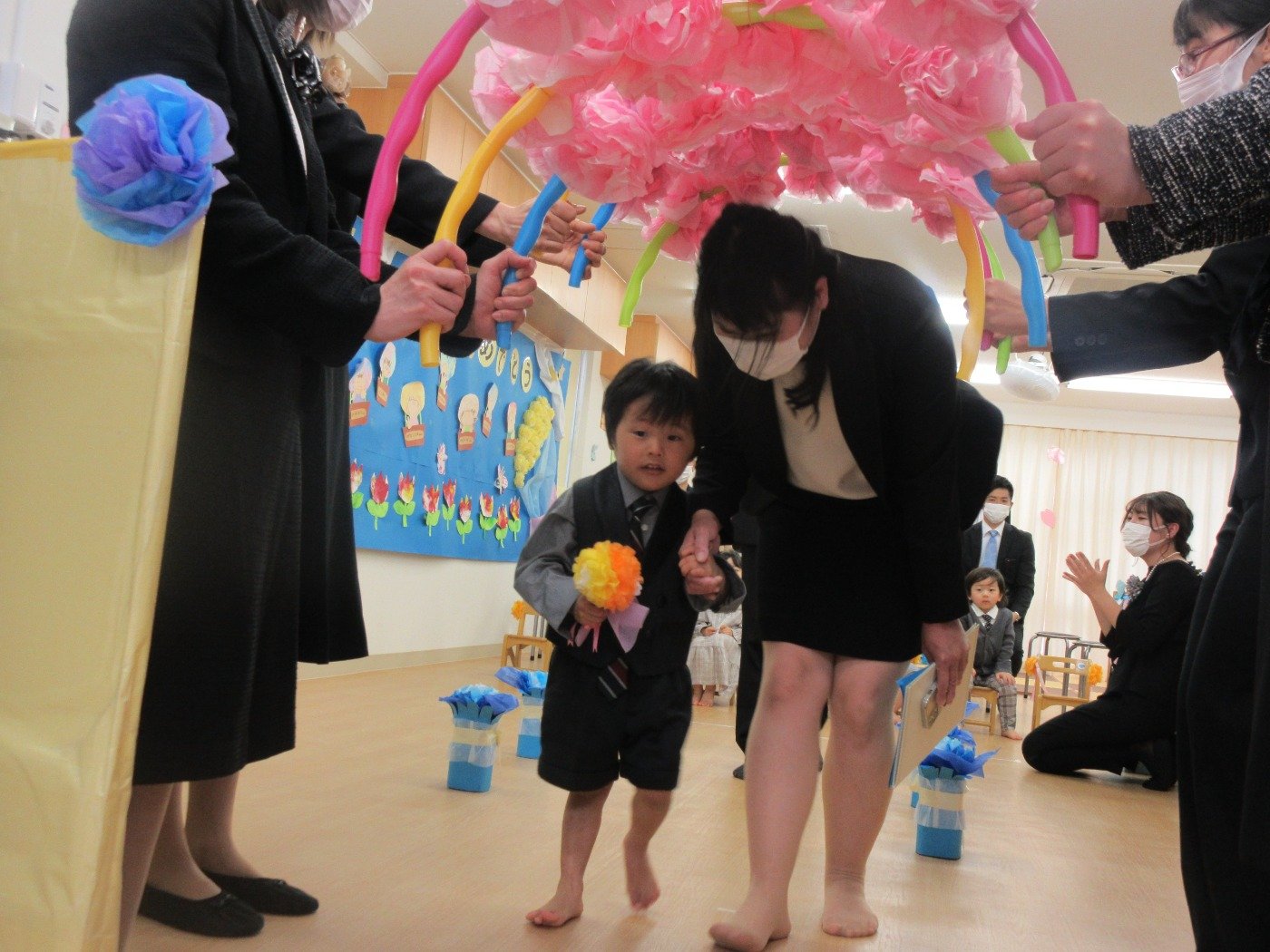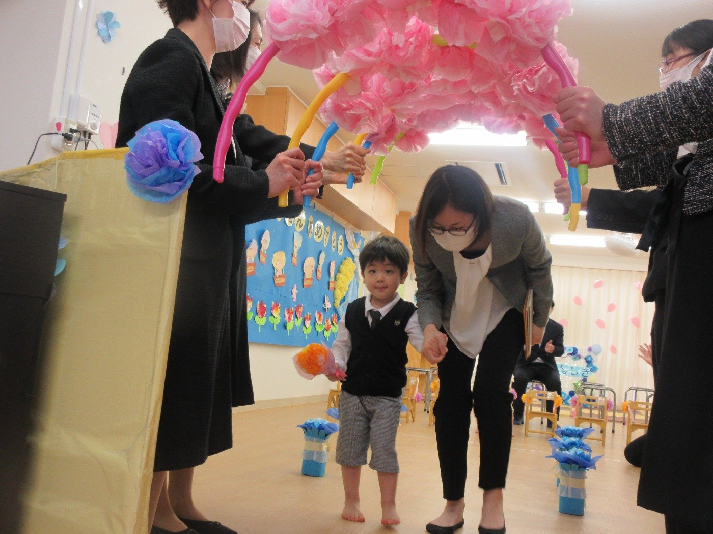 担任の先生から花束を受け取り、花のアーチを歩く子どもたちを