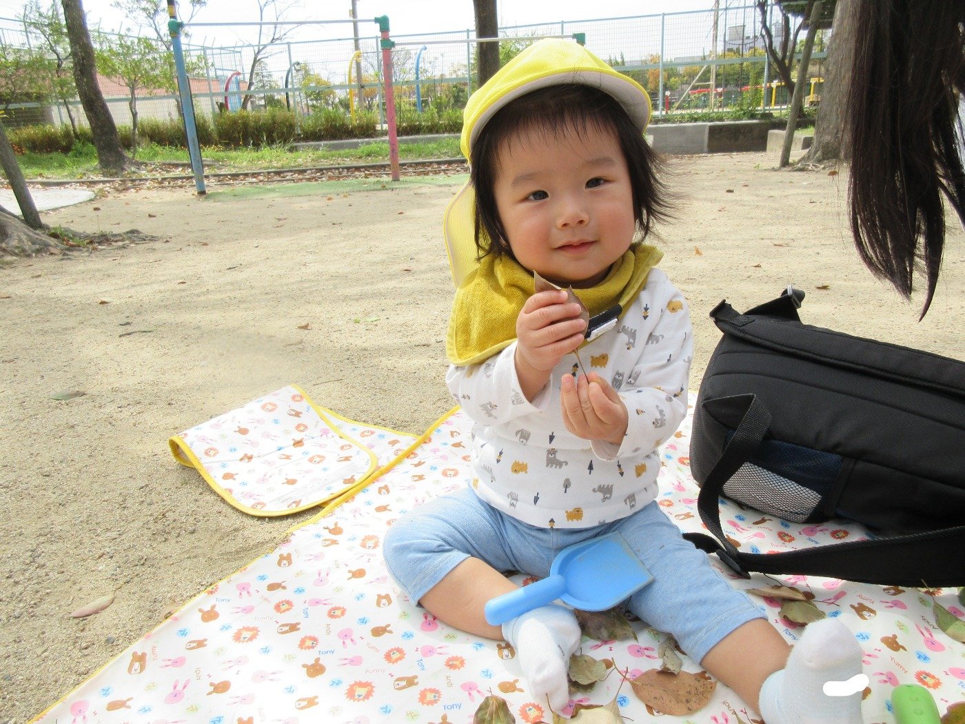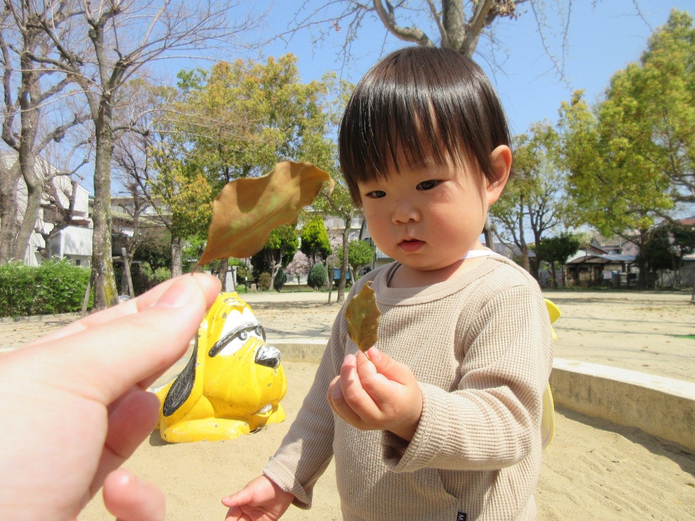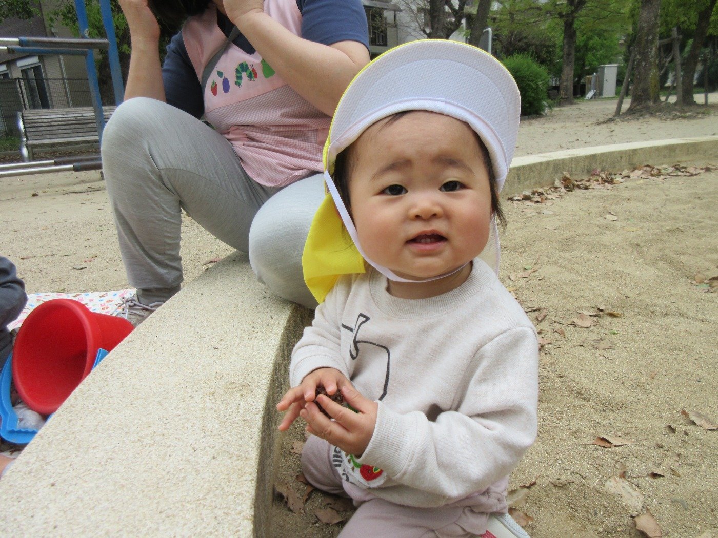 公園に行くと、ひよこ組さんはお砂をつかんでニギニギ…