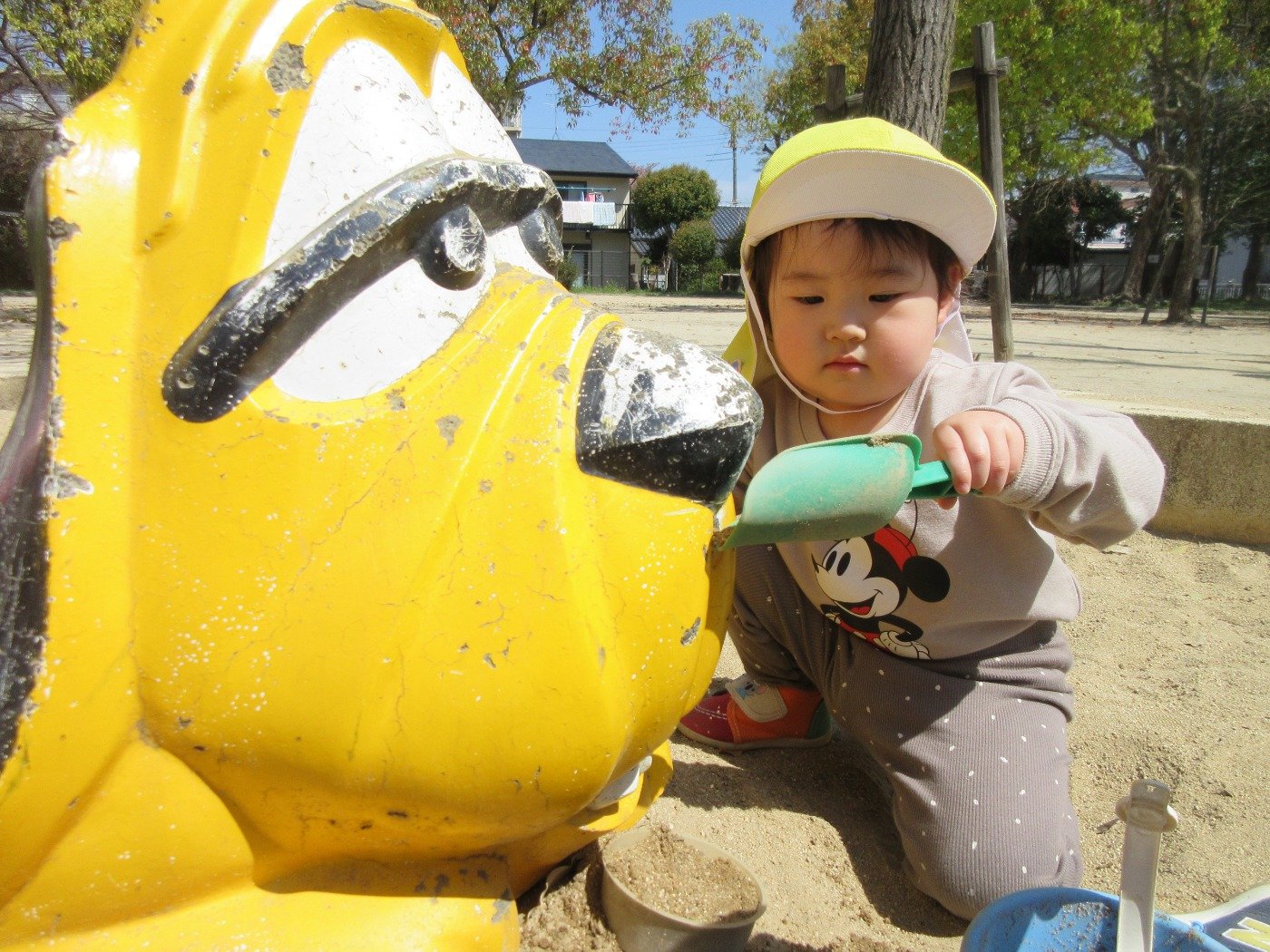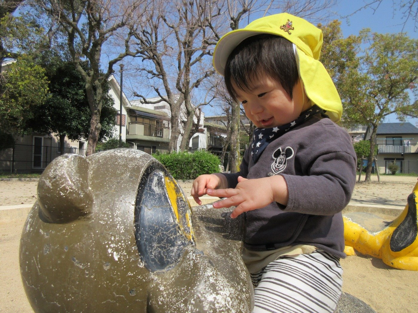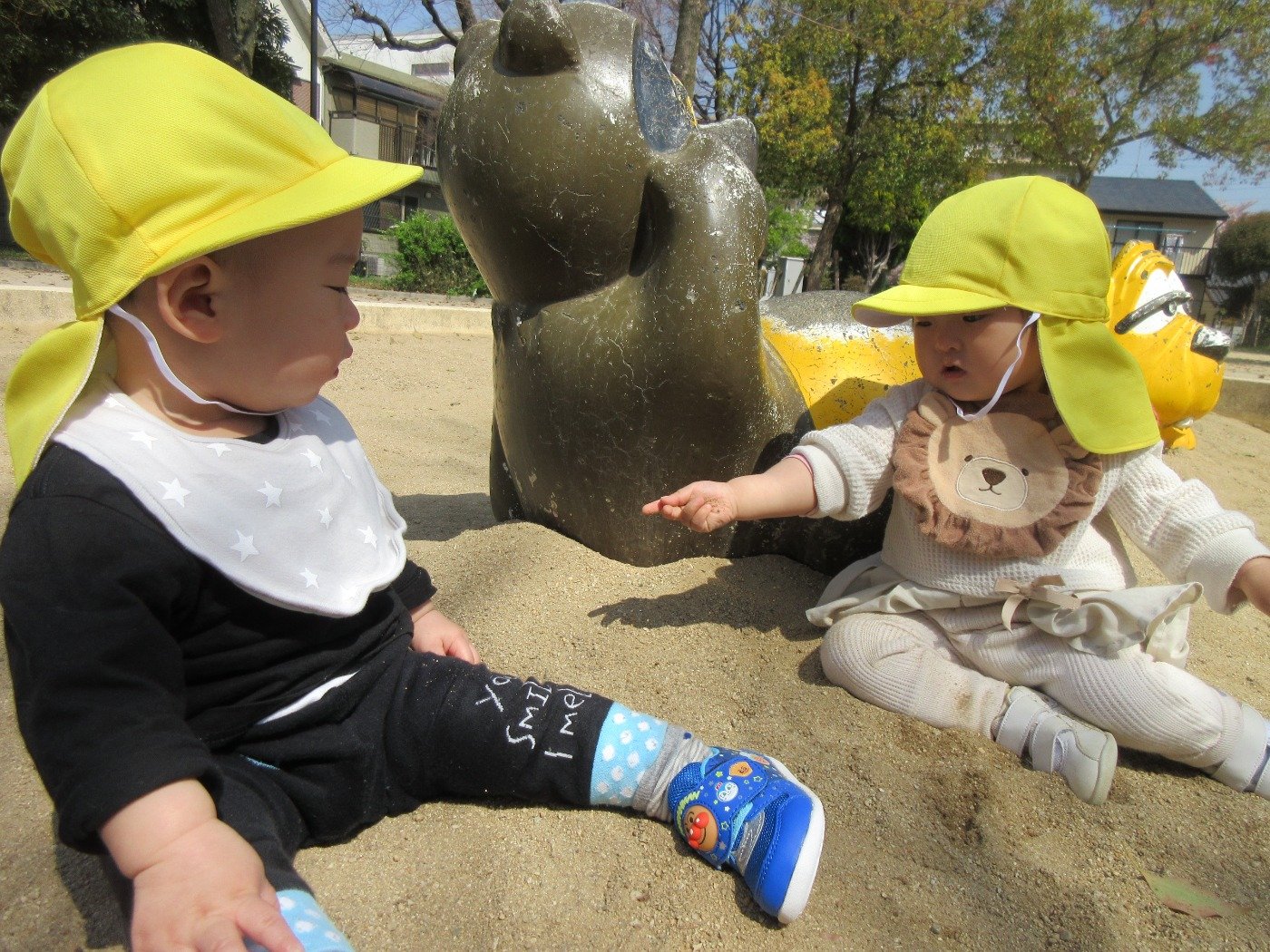 公園に行くと、ひよこ組さんはお砂をつかんでニギニギ…