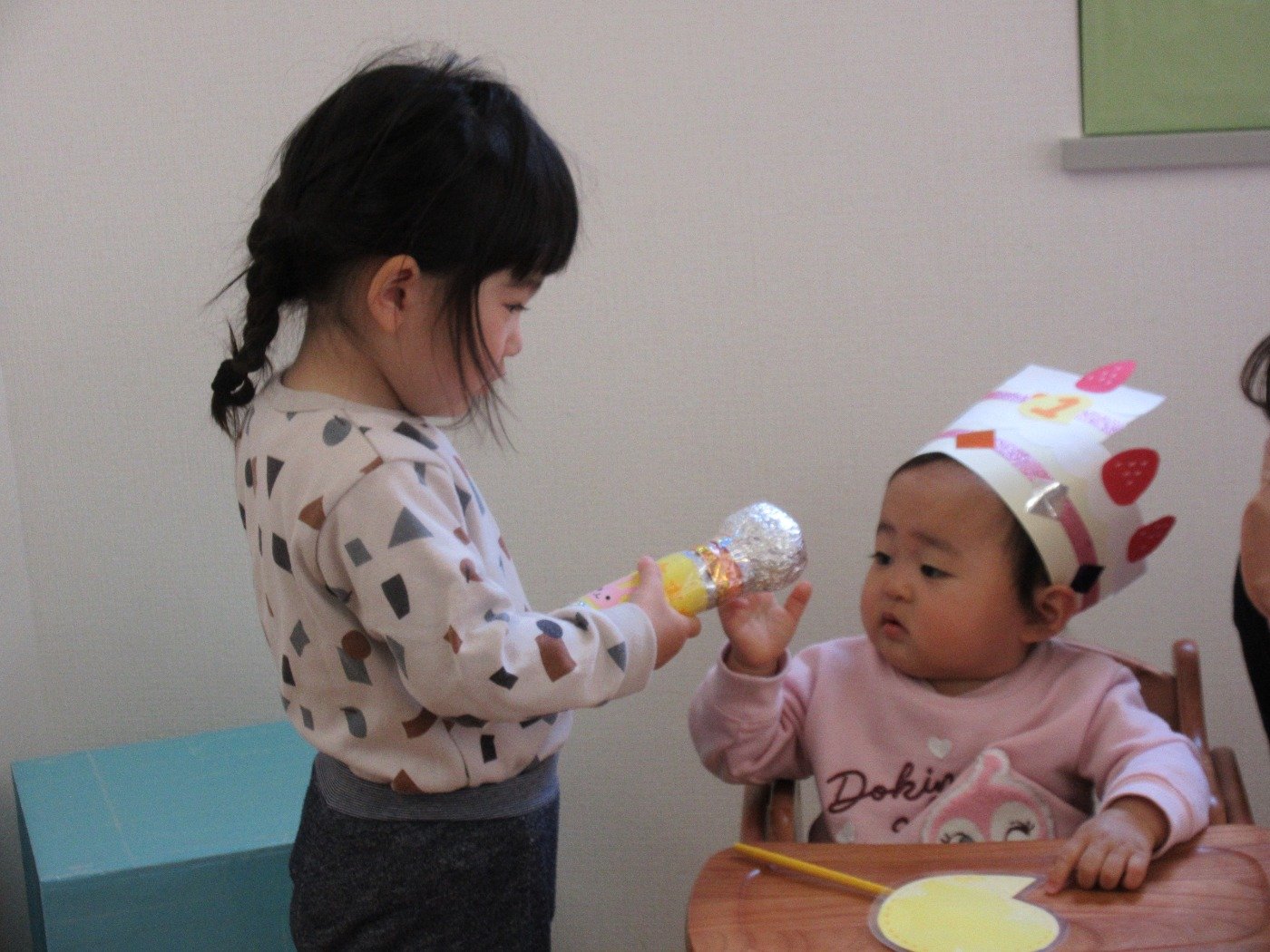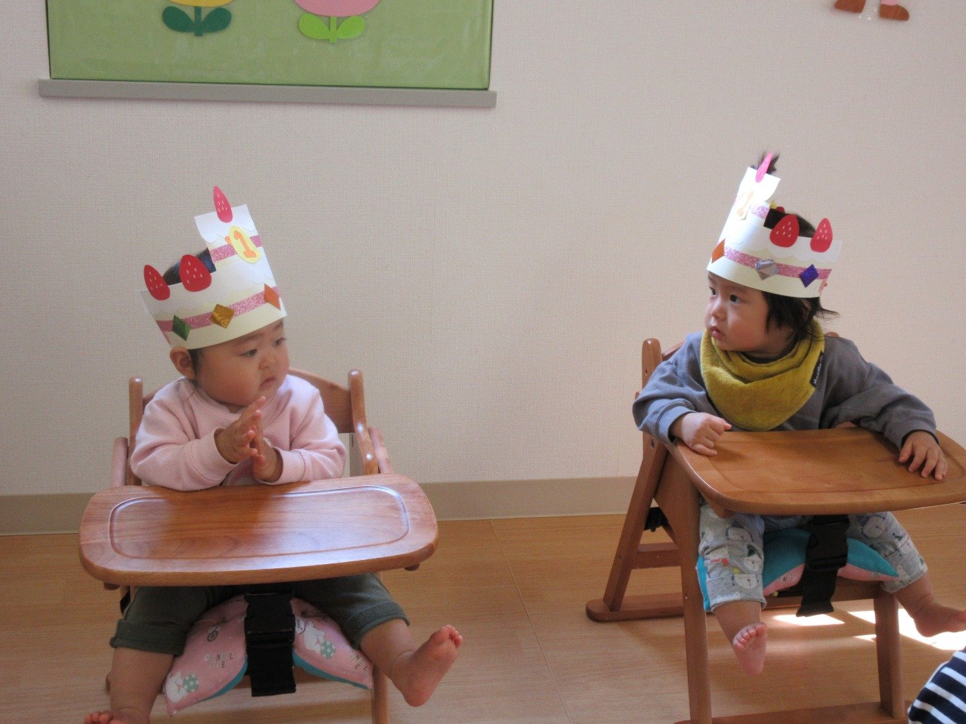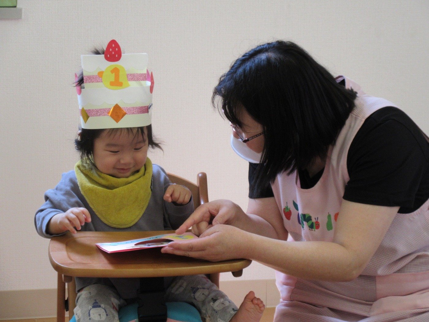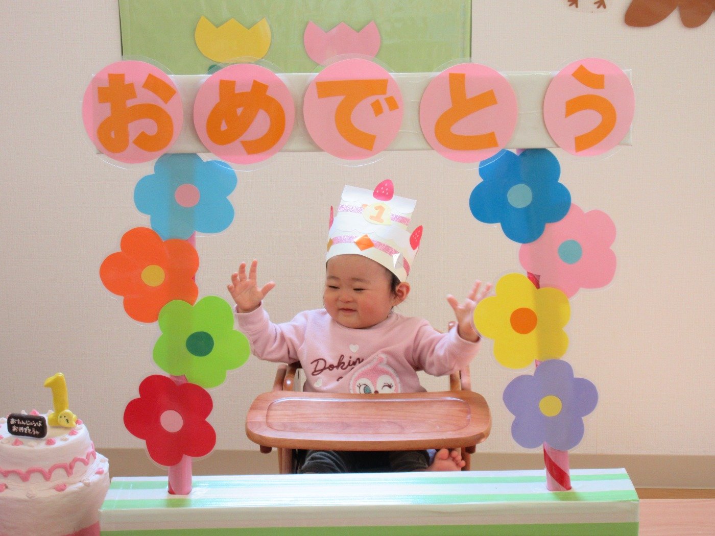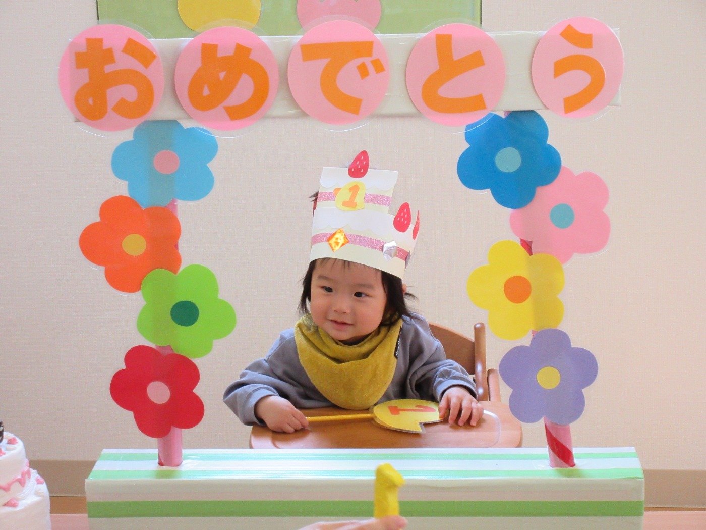 ケーキ型の冠をかぶせてもらいニコニコです。