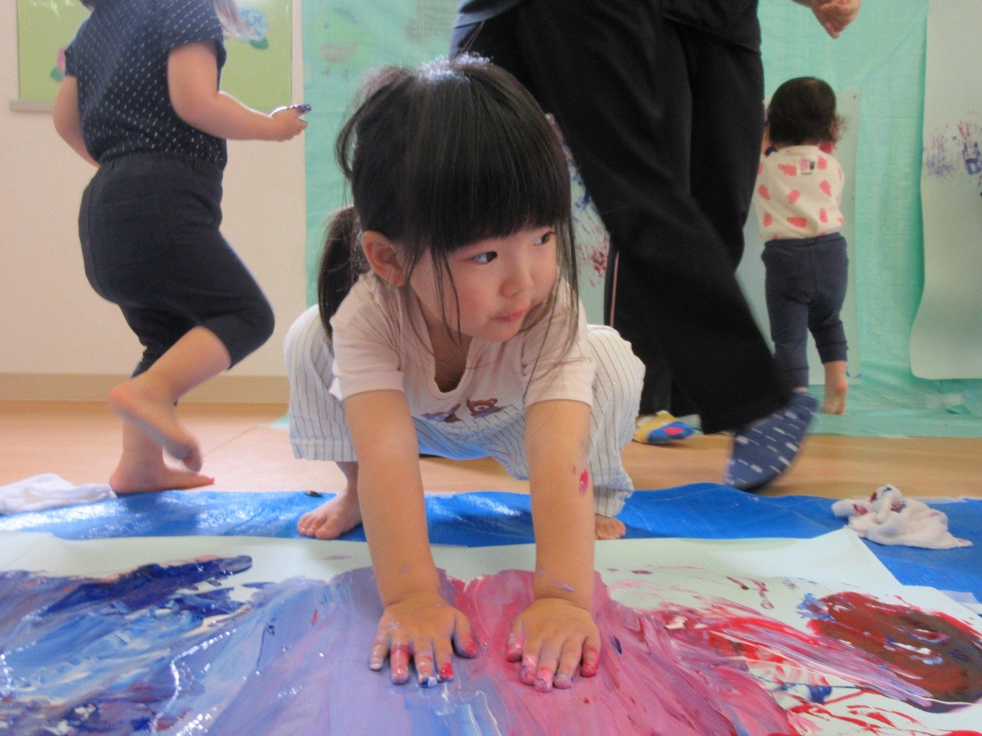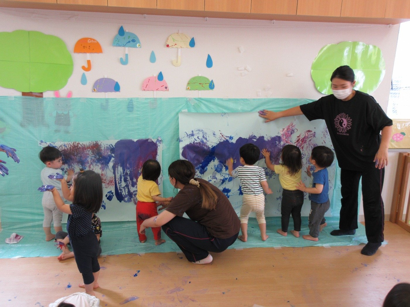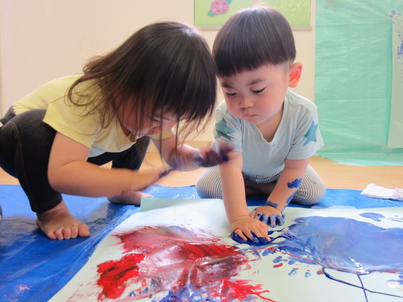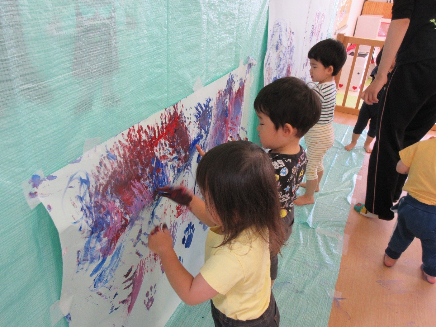 お部屋いっぱいに模造紙を広げて、みんなで絵の具をぬりぬり♪