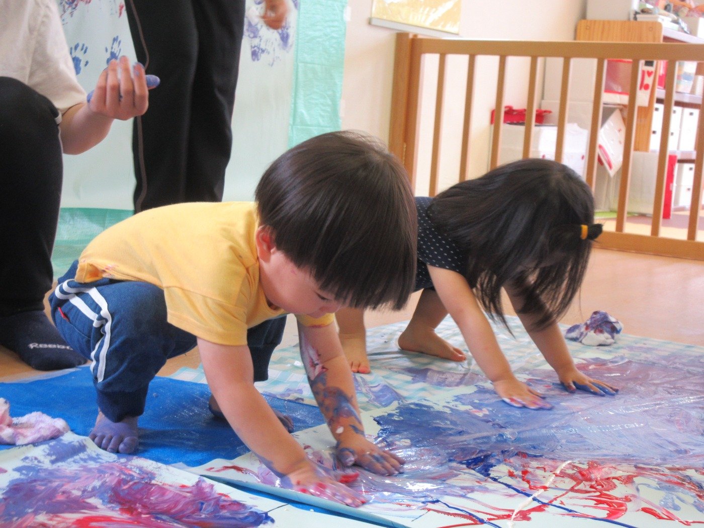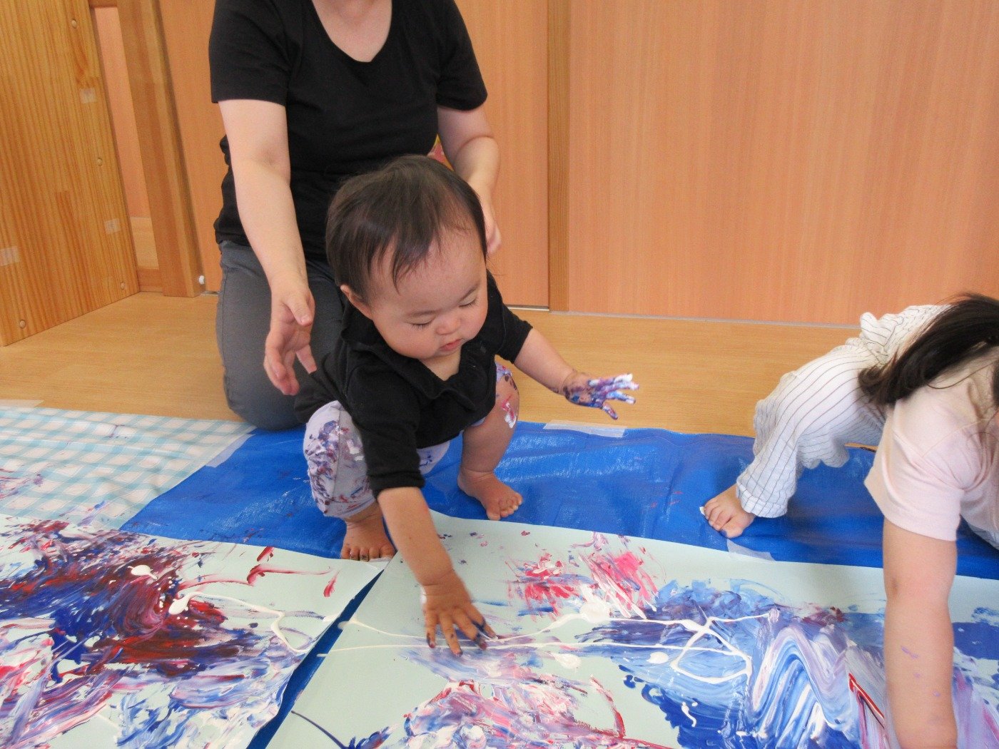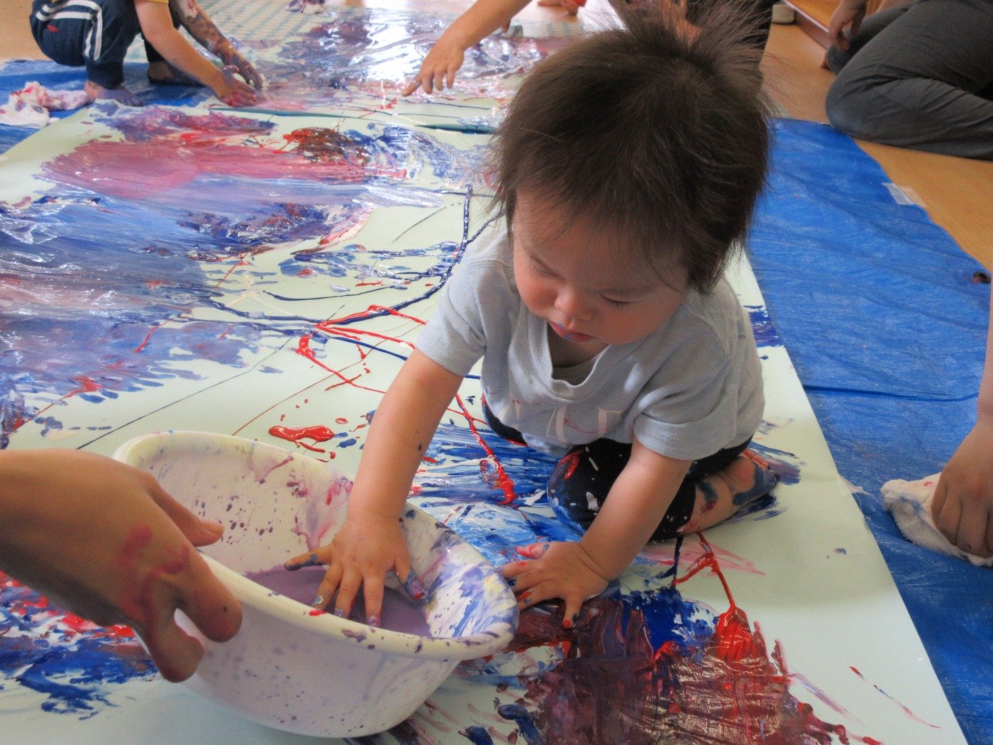 お部屋いっぱいに模造紙を広げて、みんなで絵の具をぬりぬり♪