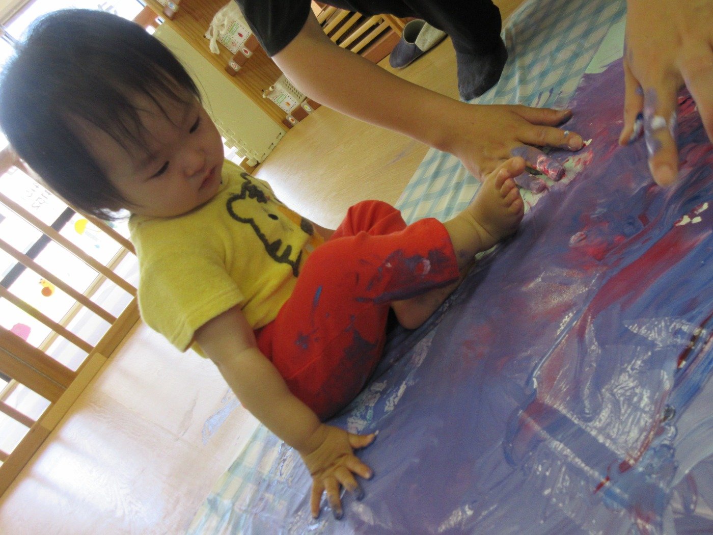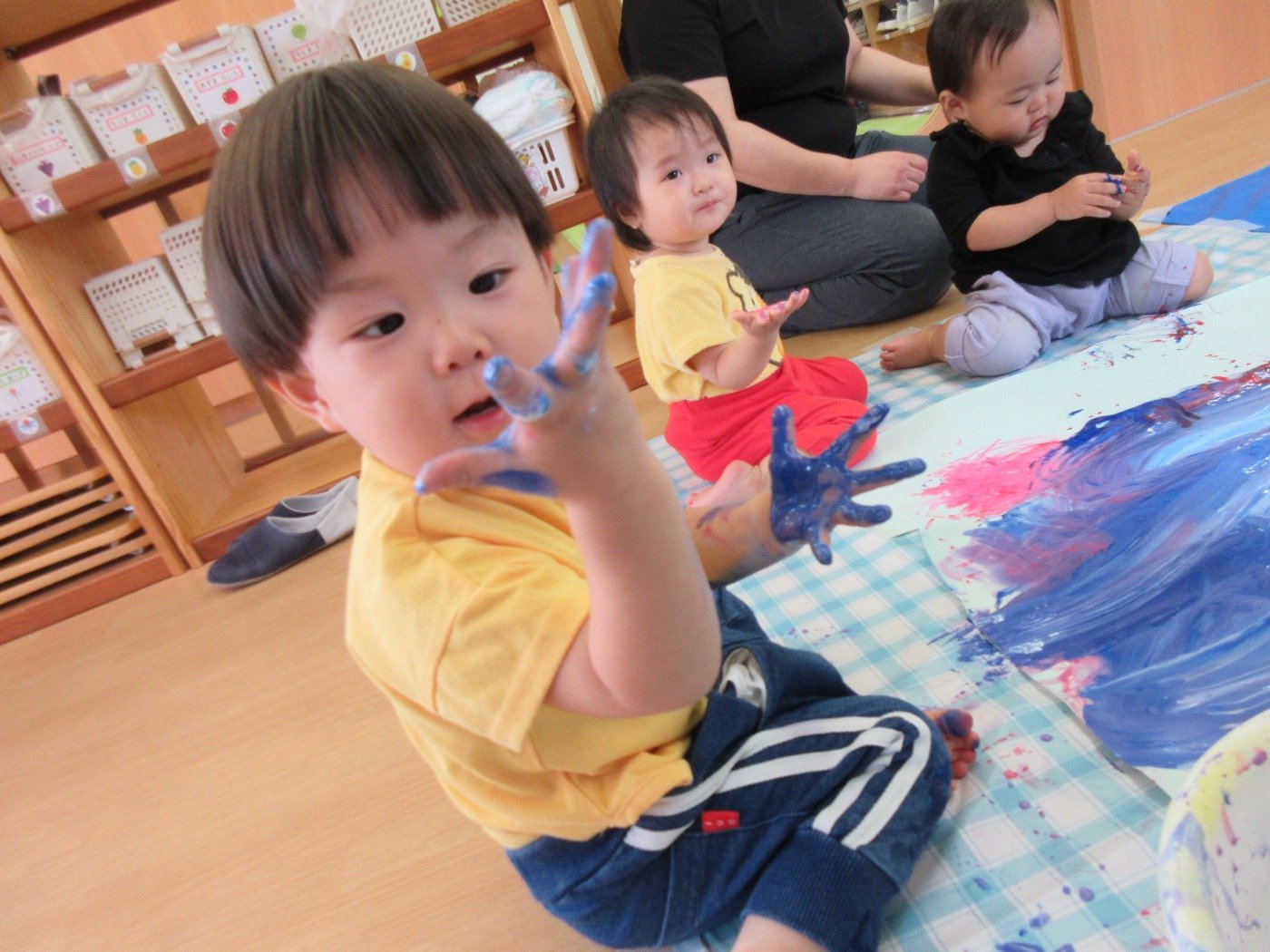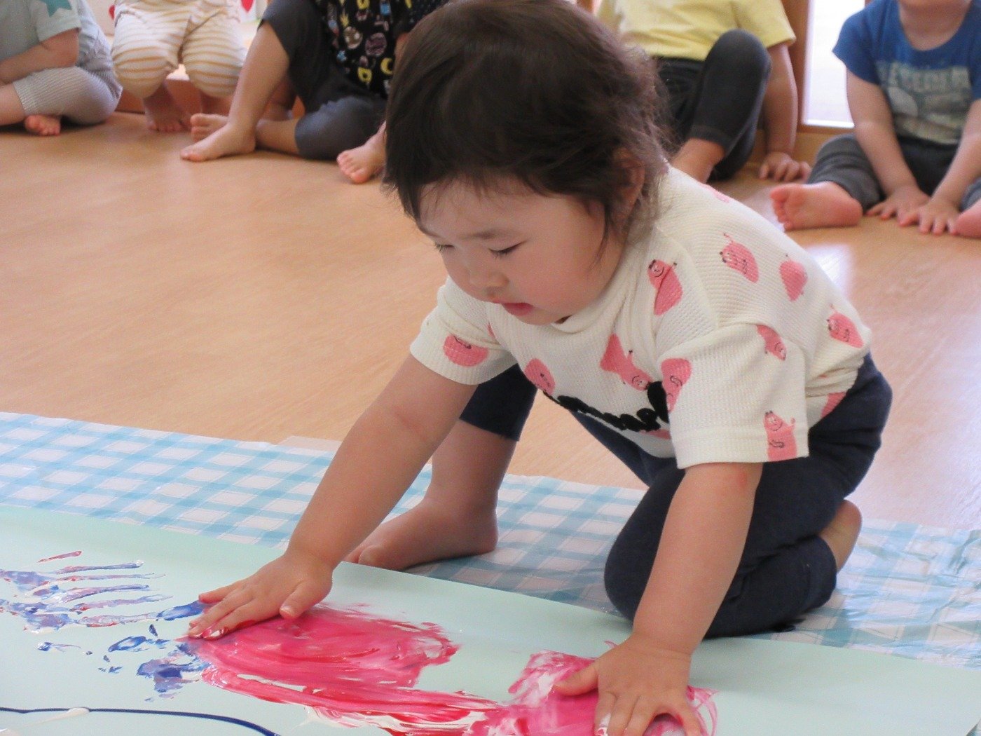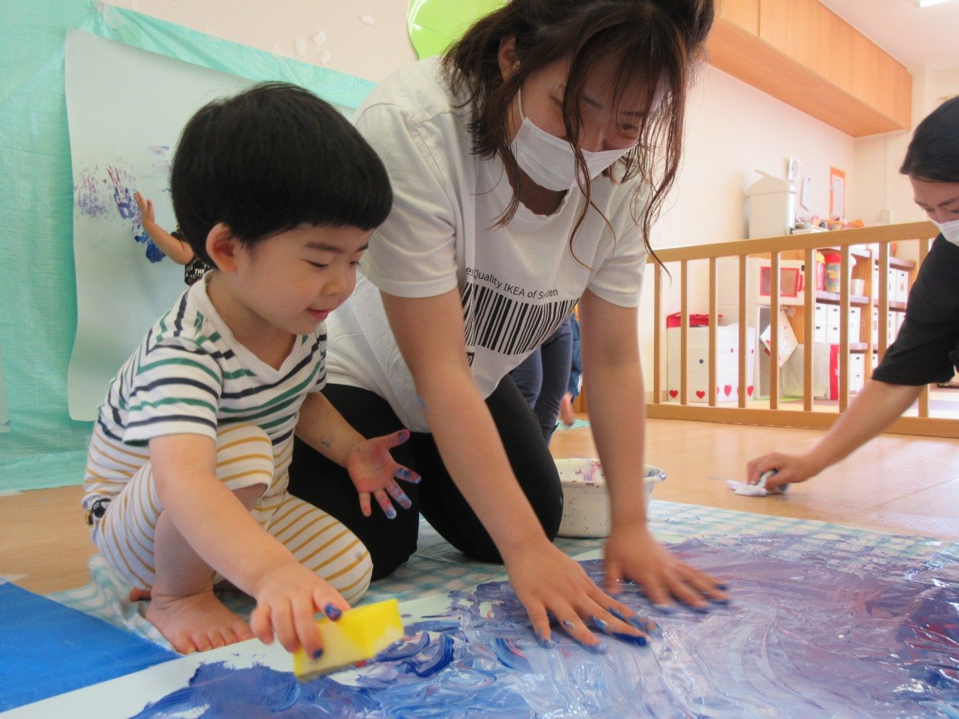 お部屋いっぱいに模造紙を広げて、みんなで絵の具をぬりぬり♪