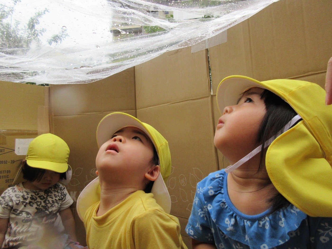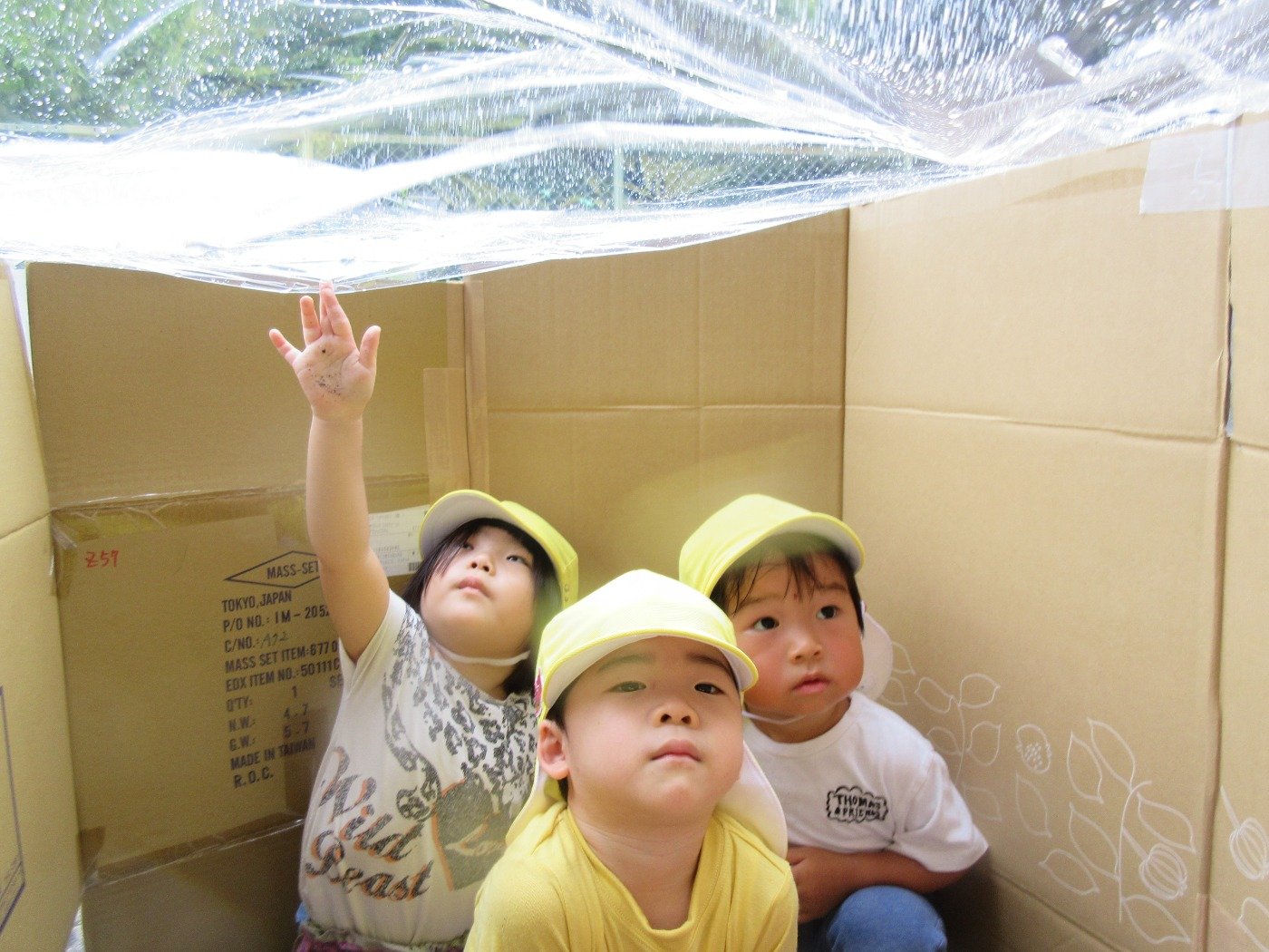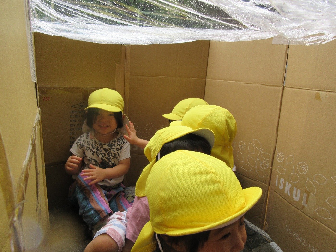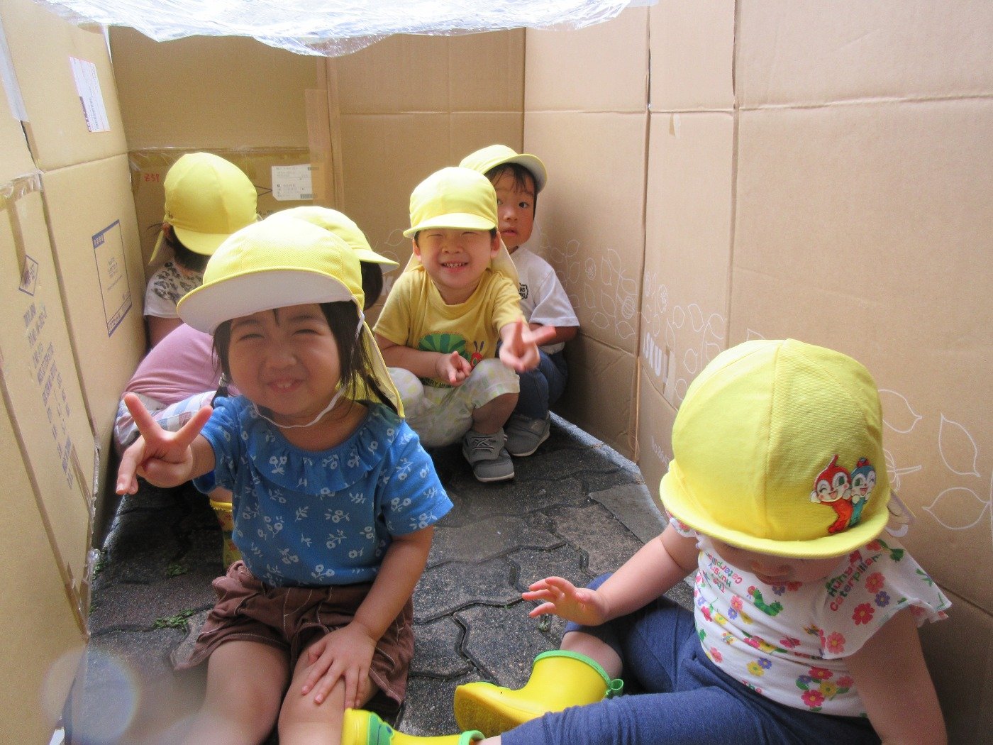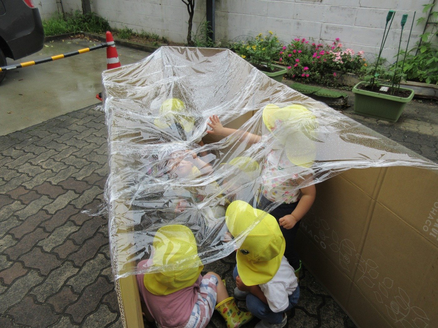 小雨模様のある日、園前にダンボールハウスが出現!