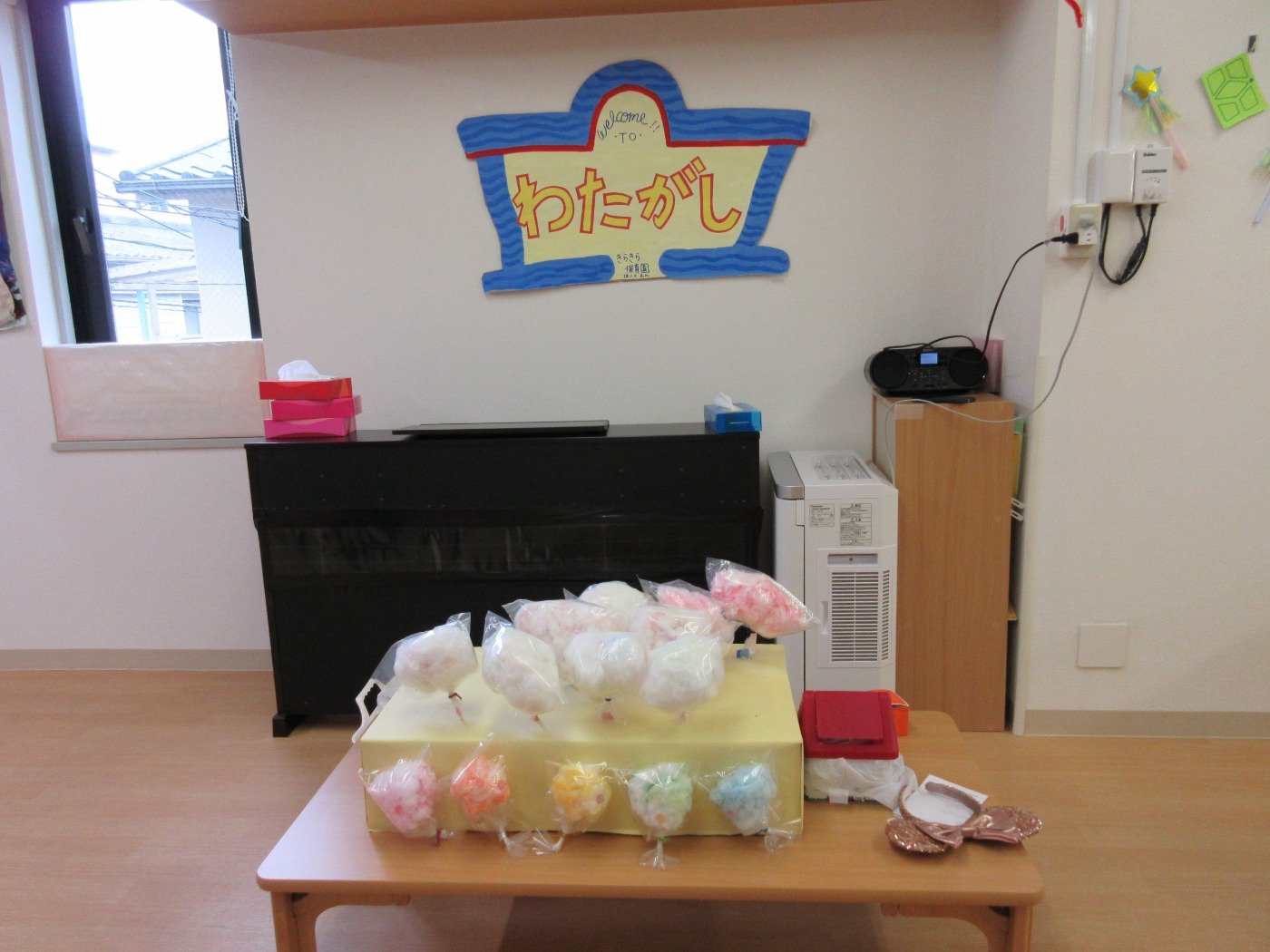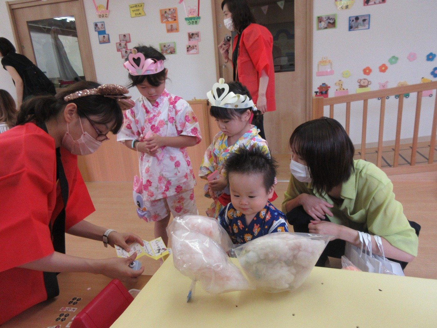 綿菓子屋さんの綿菓子は、子どもたちが作ったものにシールを貼って