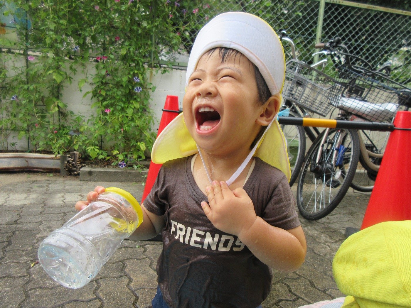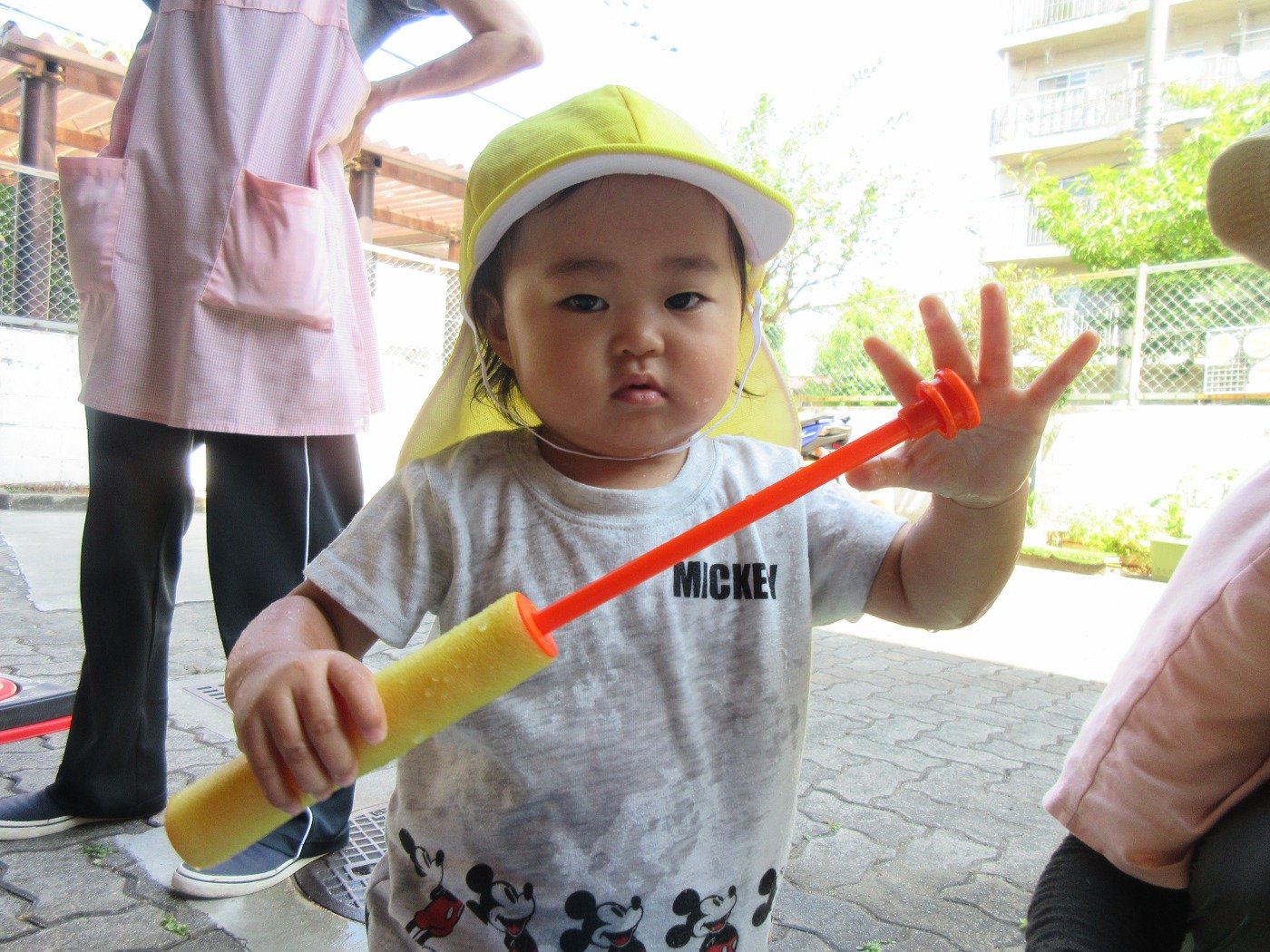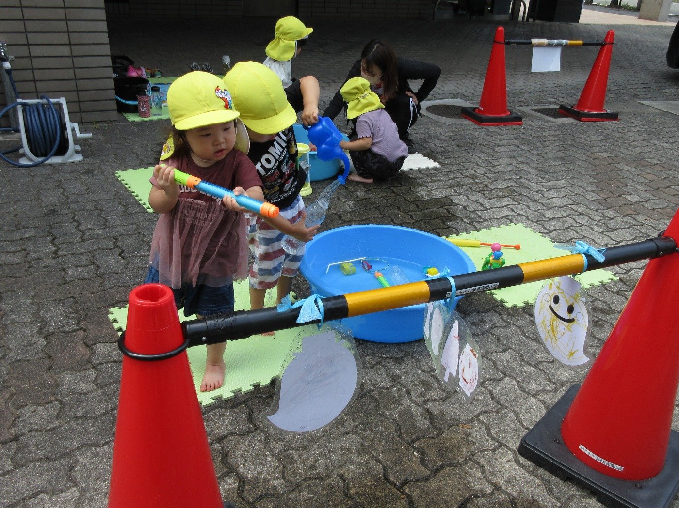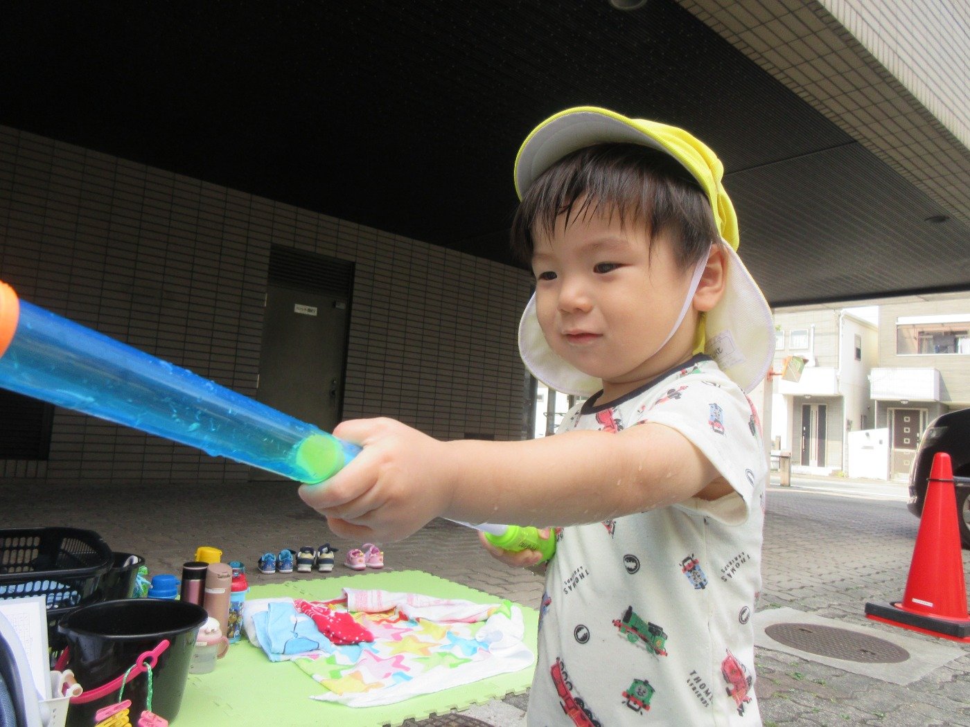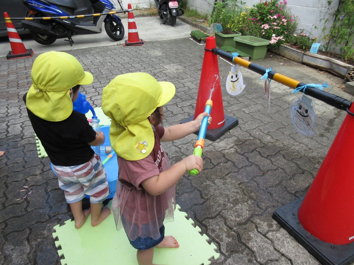 自分たちで色を塗ったおばけちゃんめがけて、水鉄砲発射ー!