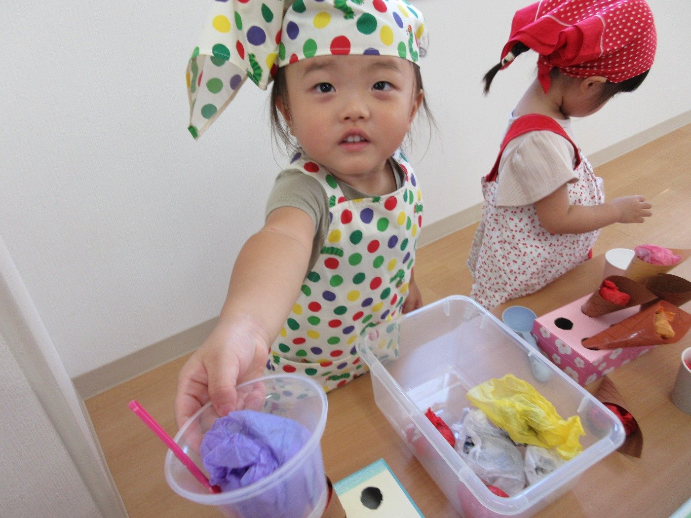 カップに入れたら「はい、どうぞ。」とごっこ遊びが始まる