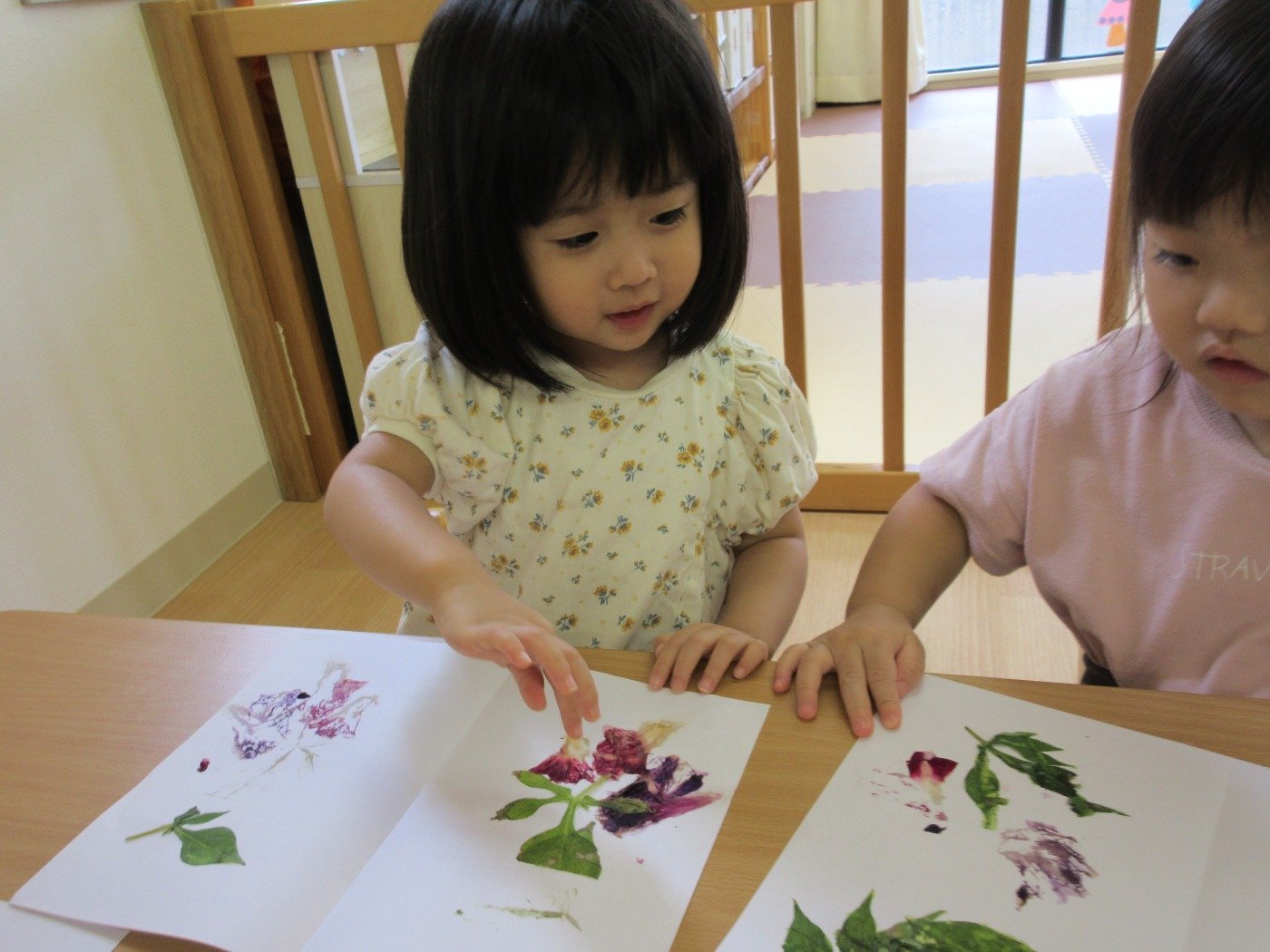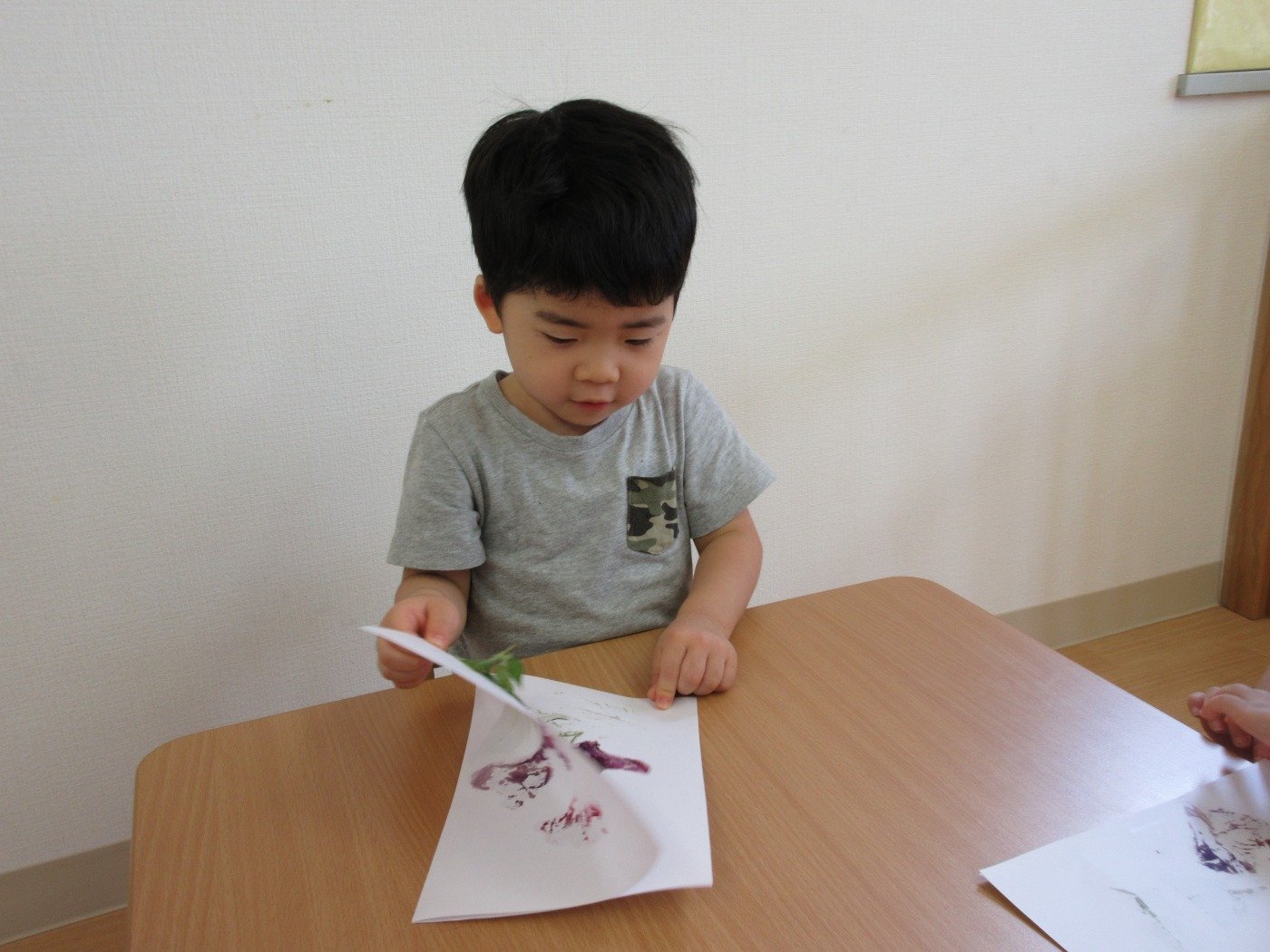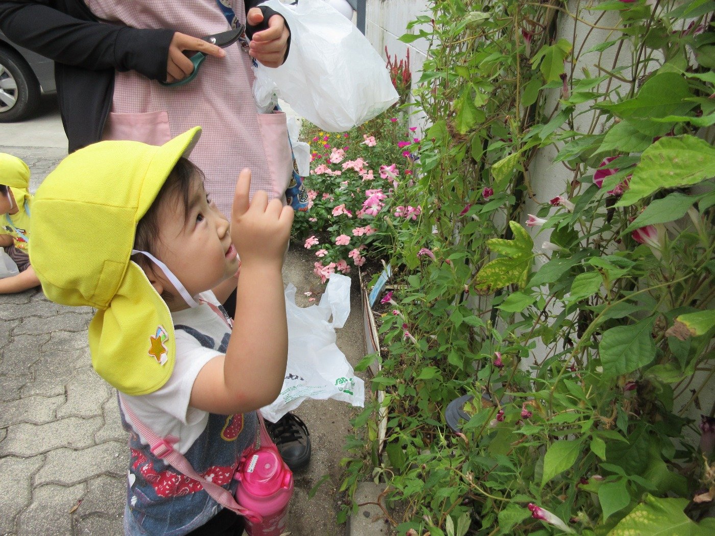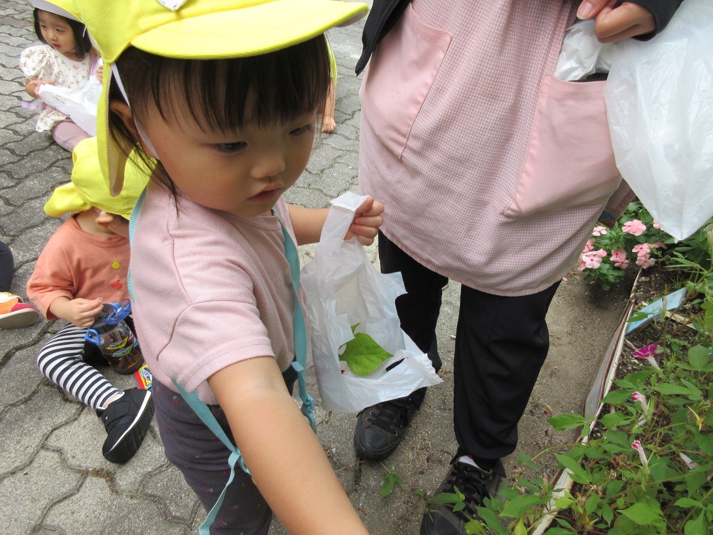 くまぐみさんは、園前の朝顔のお花と葉っぱを摘んできて、