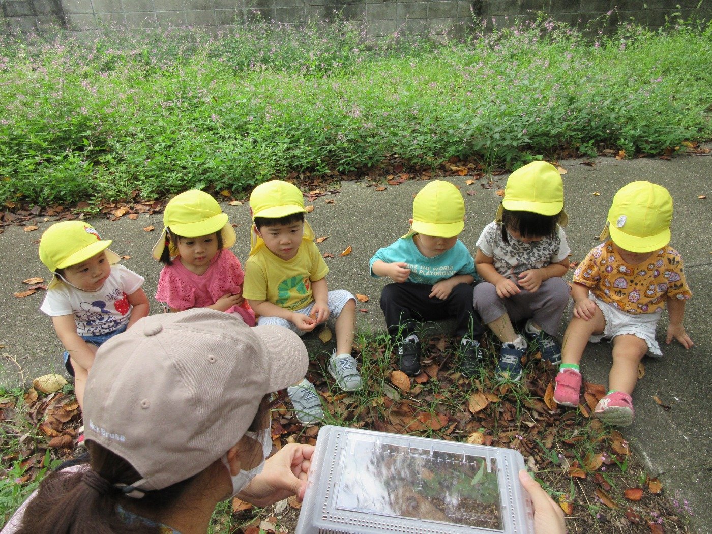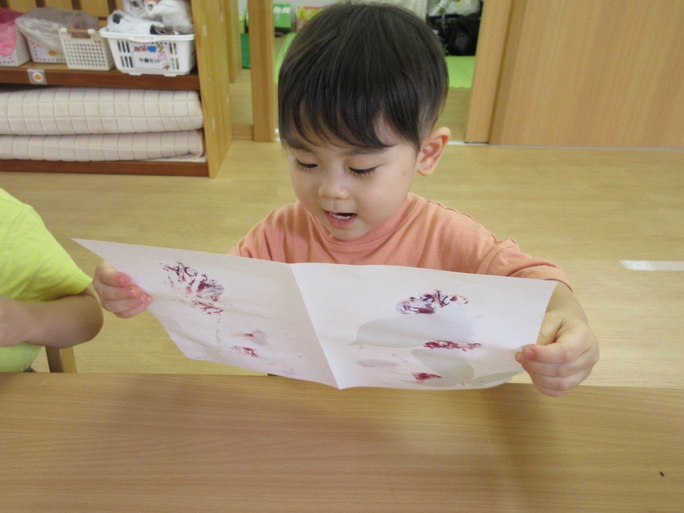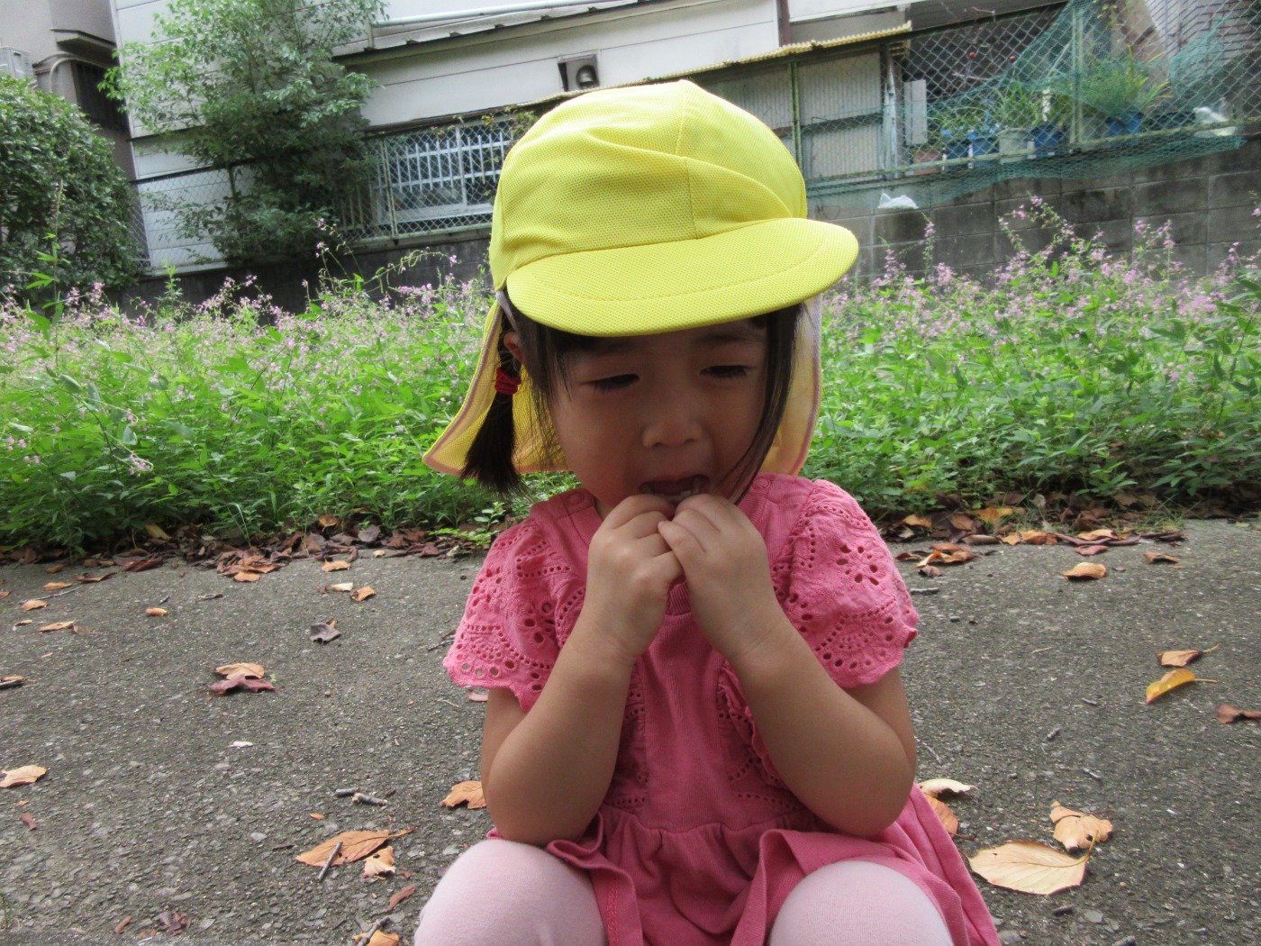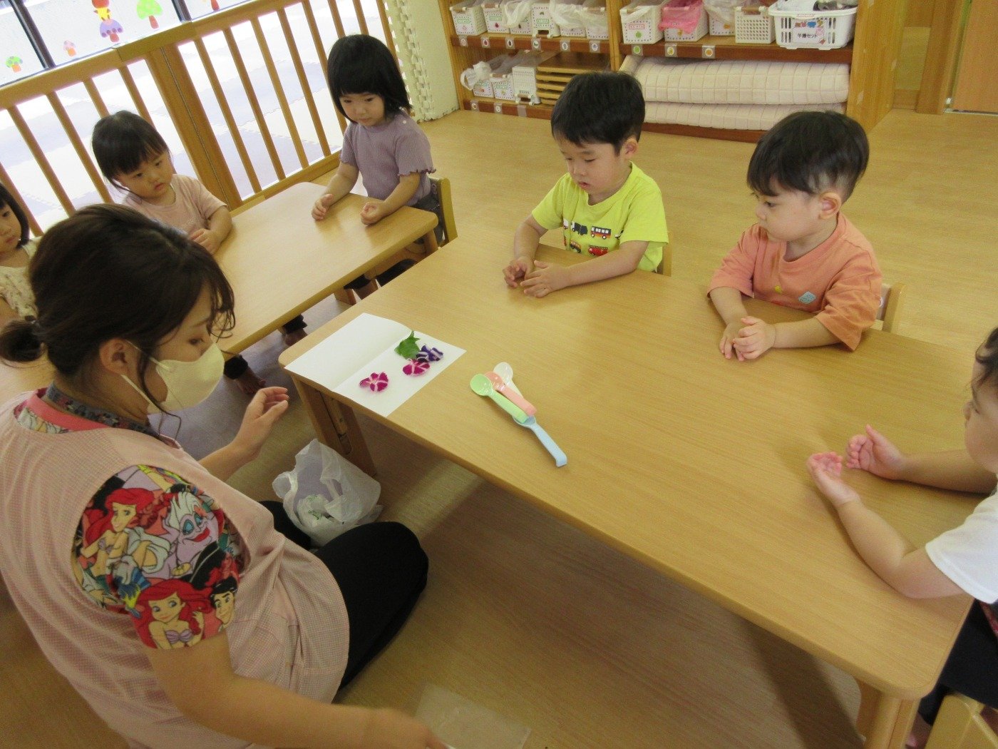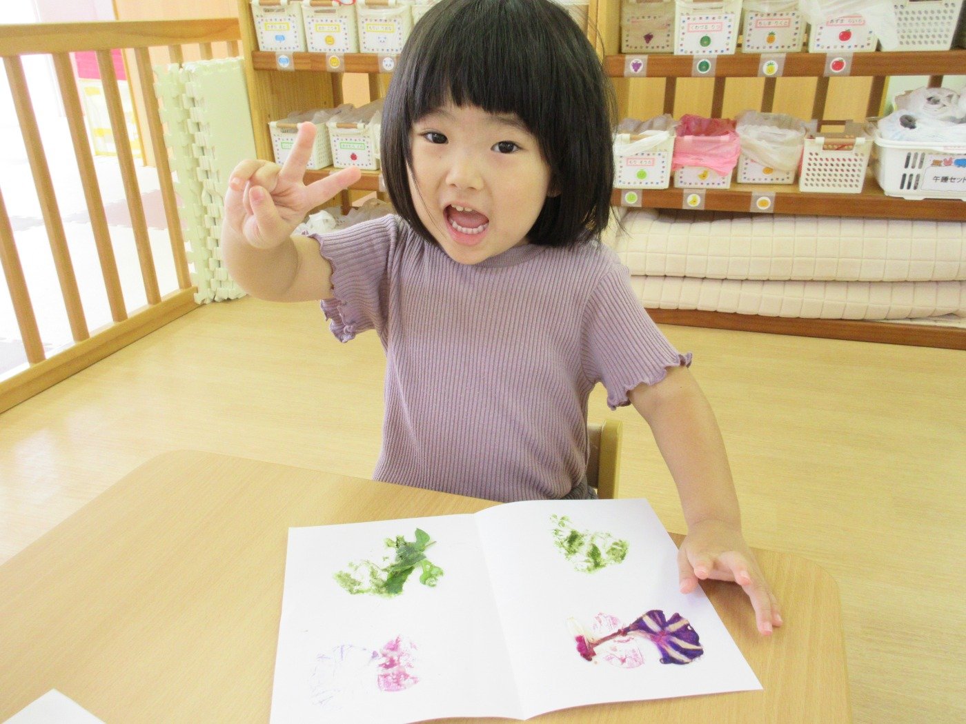 くまぐみさんは、園前の朝顔のお花と葉っぱを摘んできて、