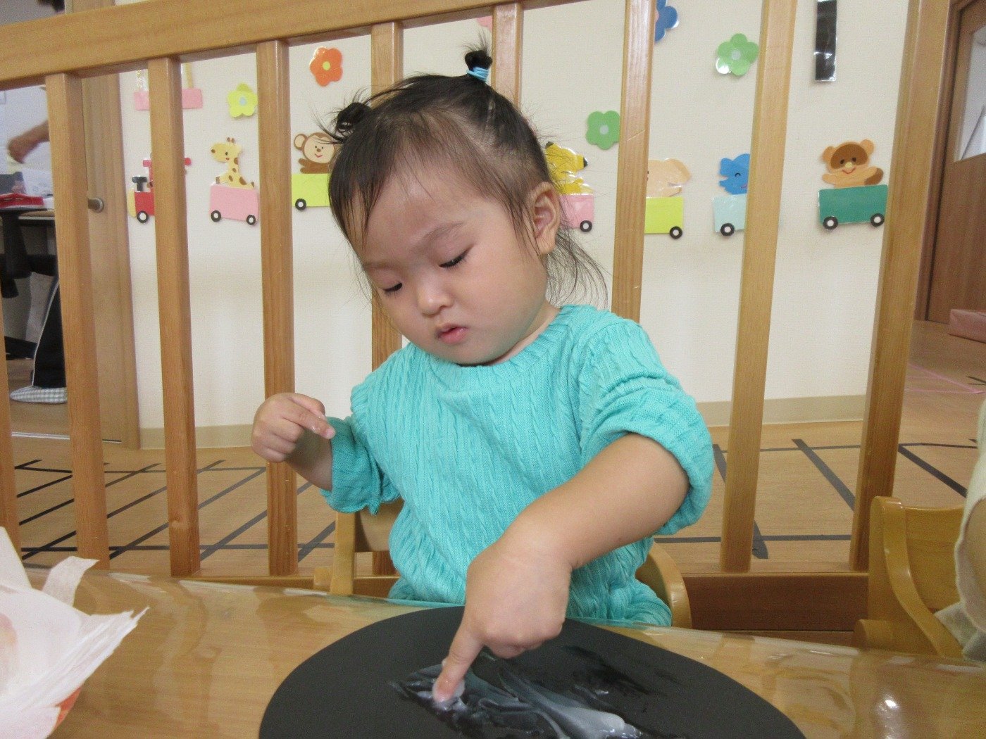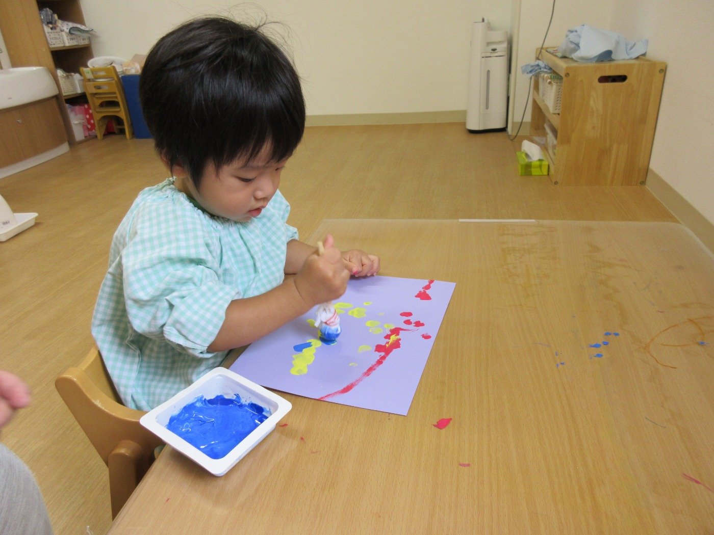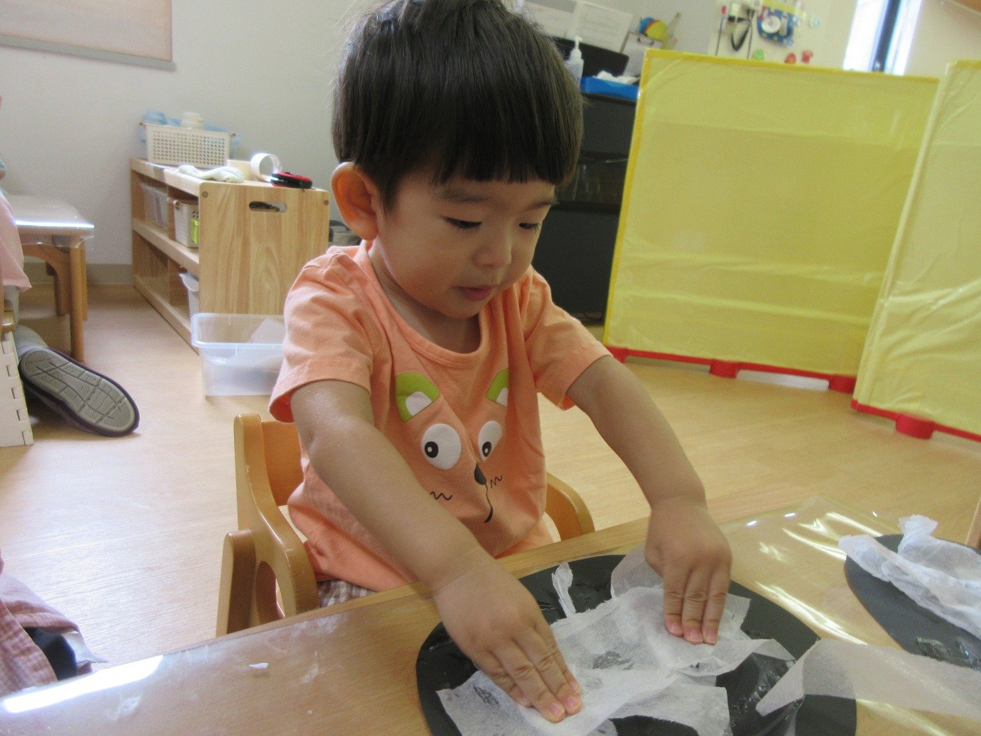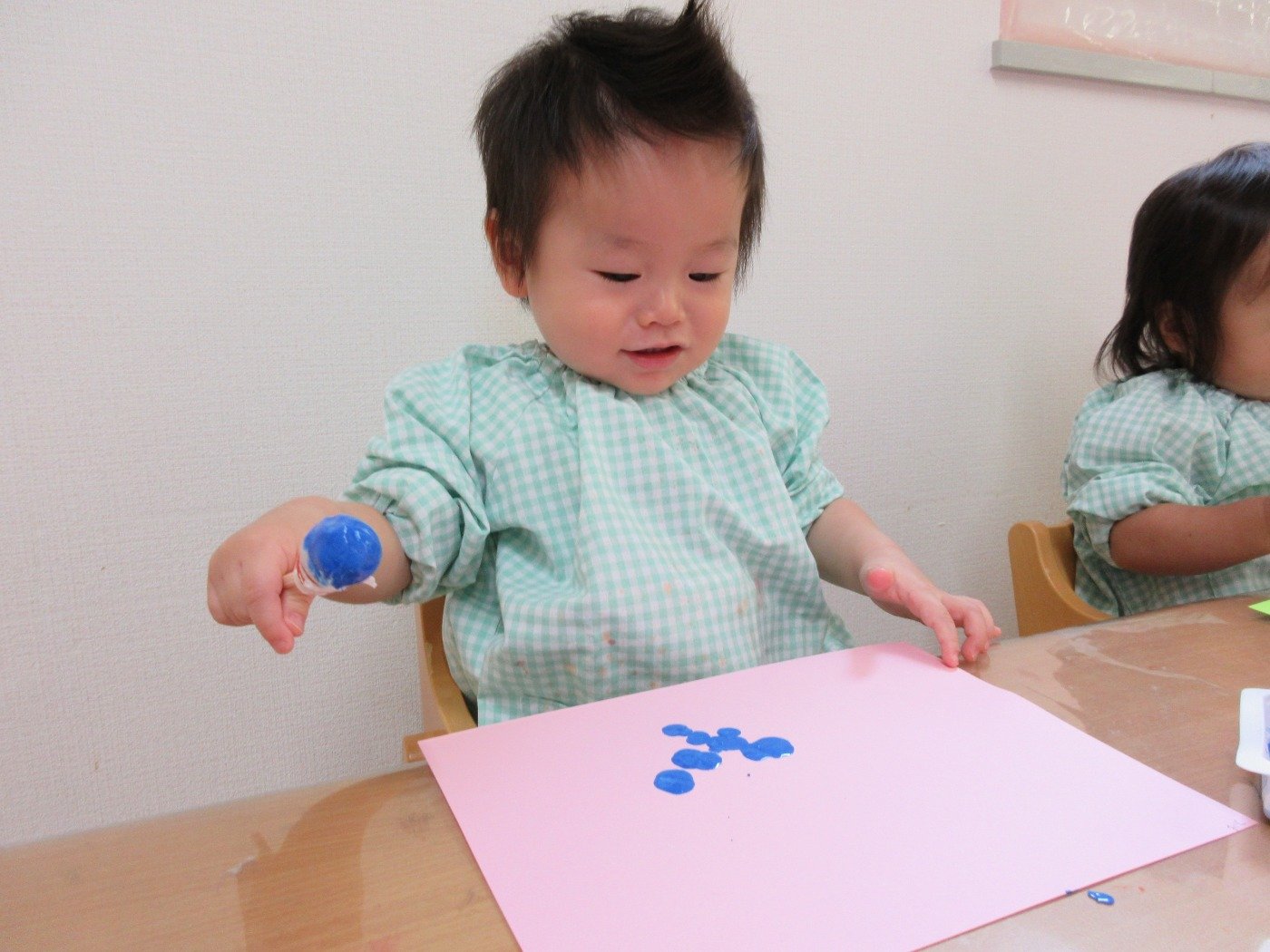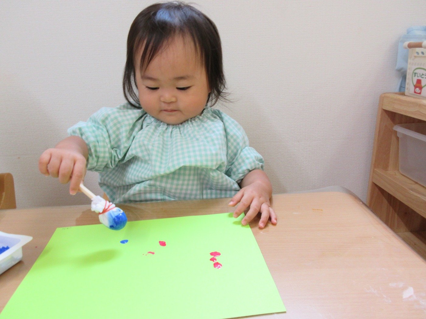 ひよこぐみさんは、小さな手で器用にタンポを持ってポンポンポン…