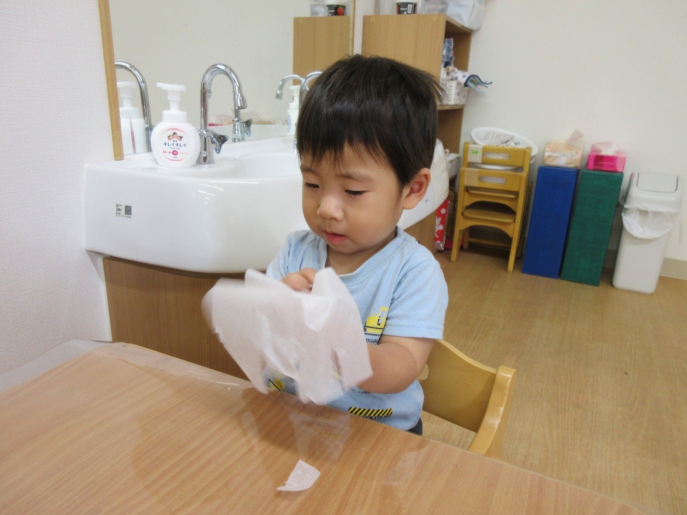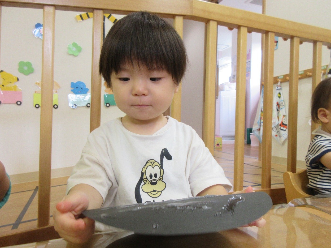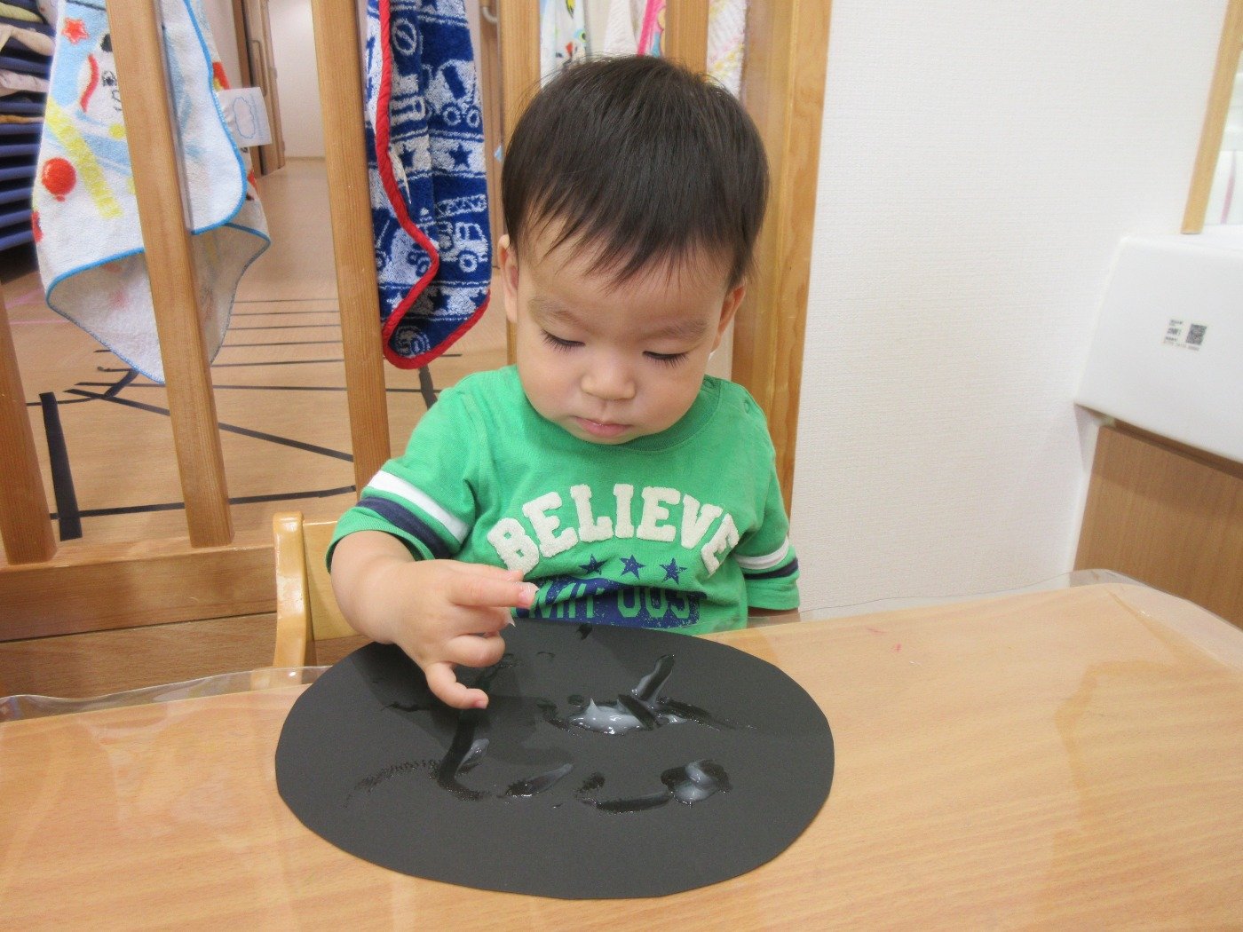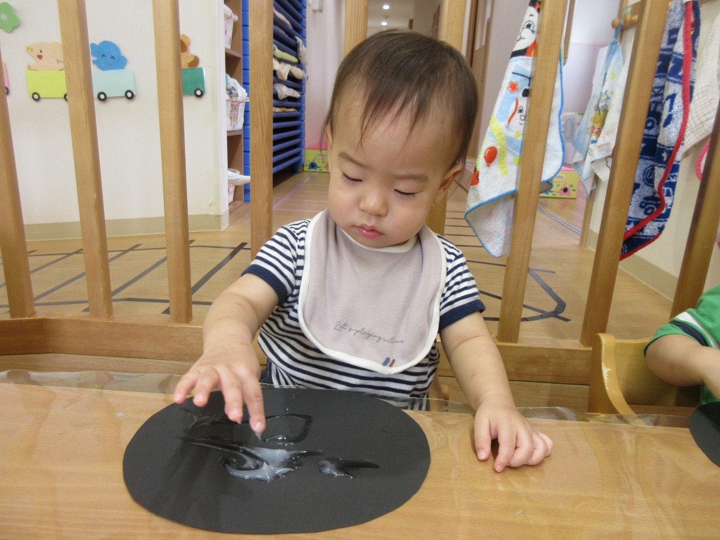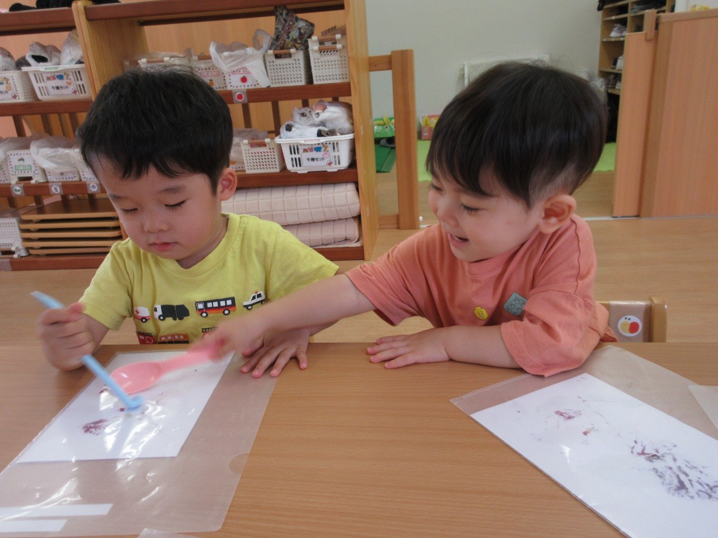 ひよこぐみさんは、小さな手で器用にタンポを持ってポンポンポン…
