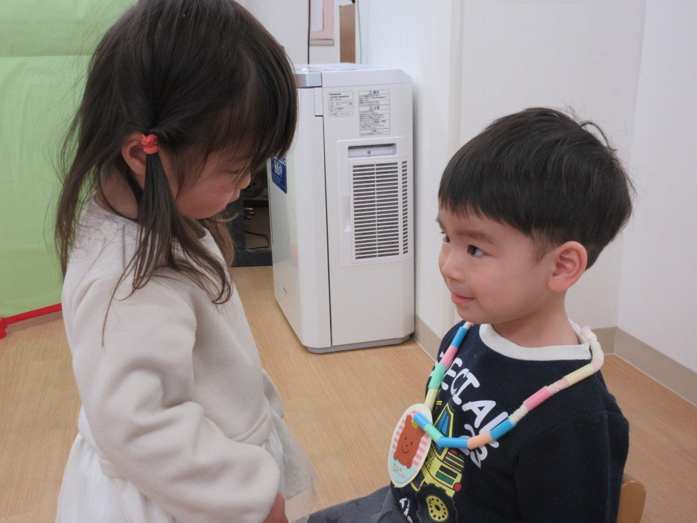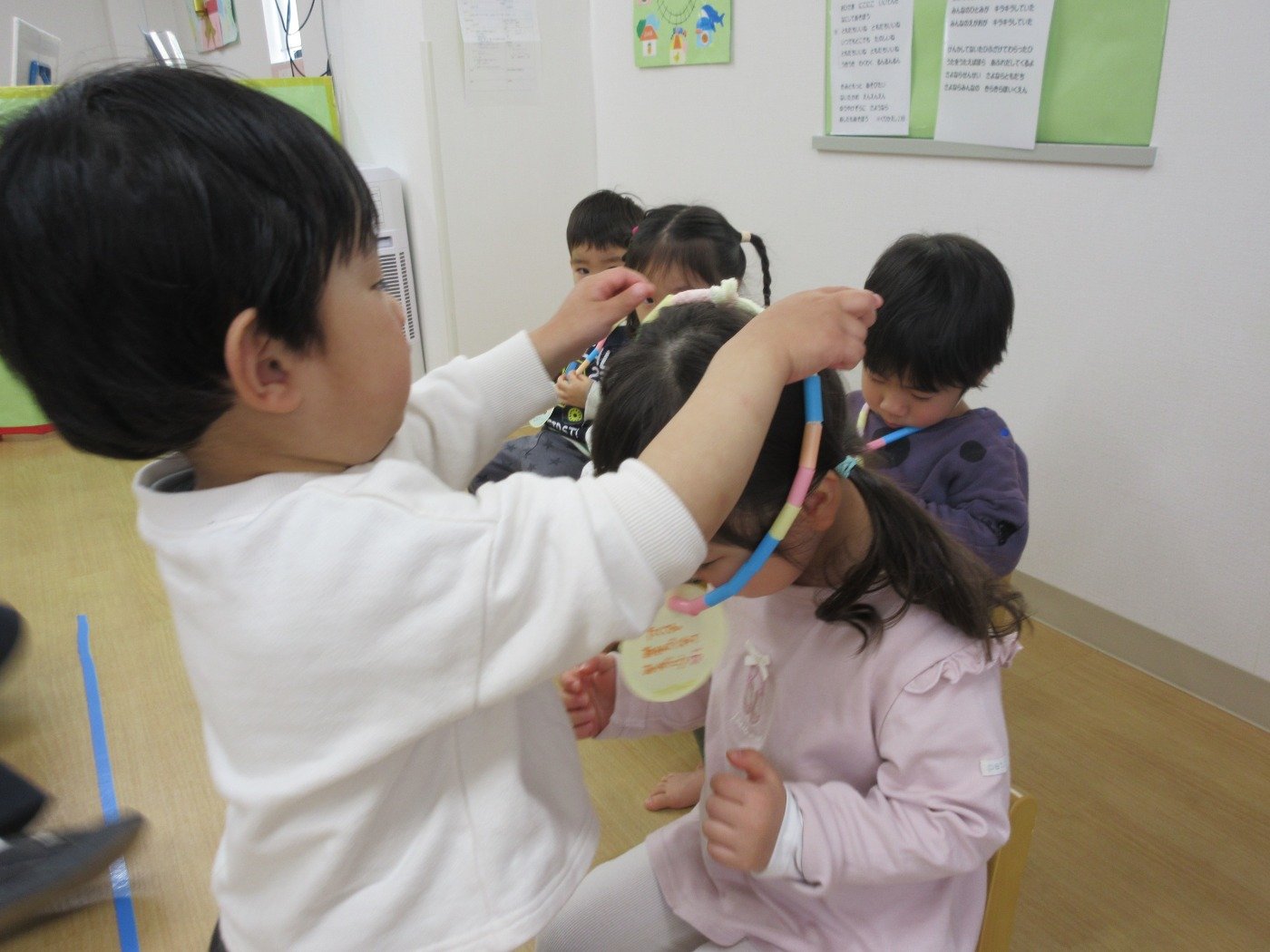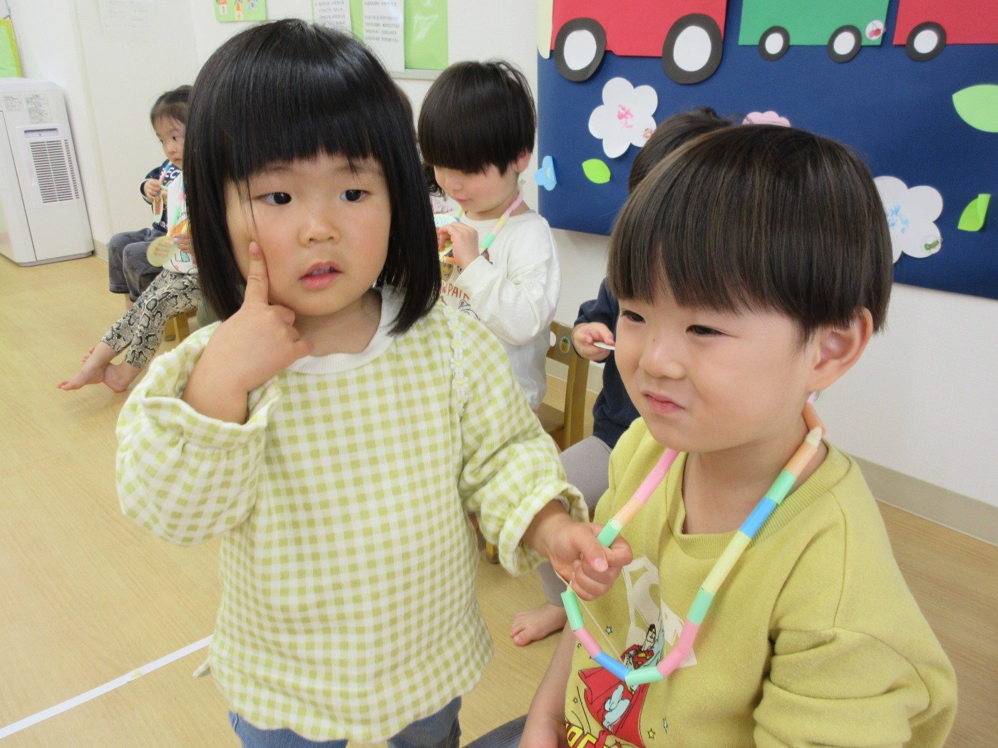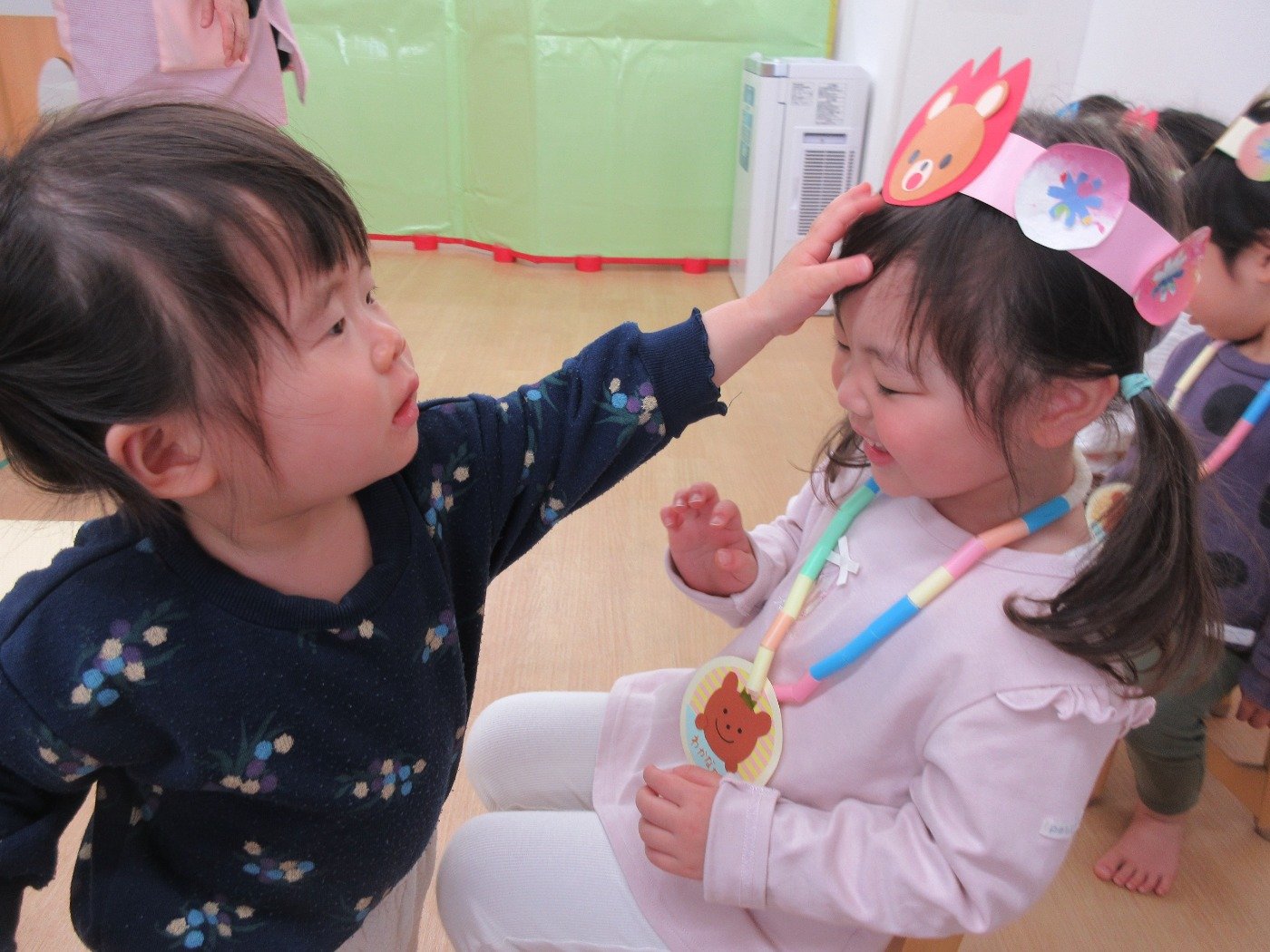 うさぎ組さんとひよこ組さんが、手作りのネックレスと王冠を