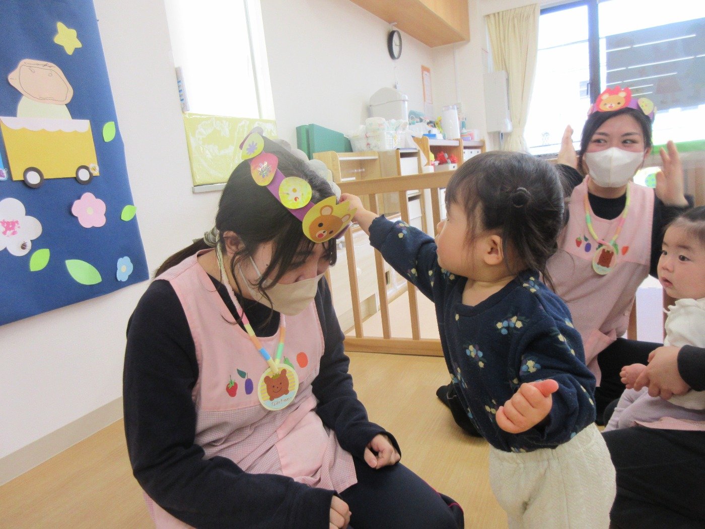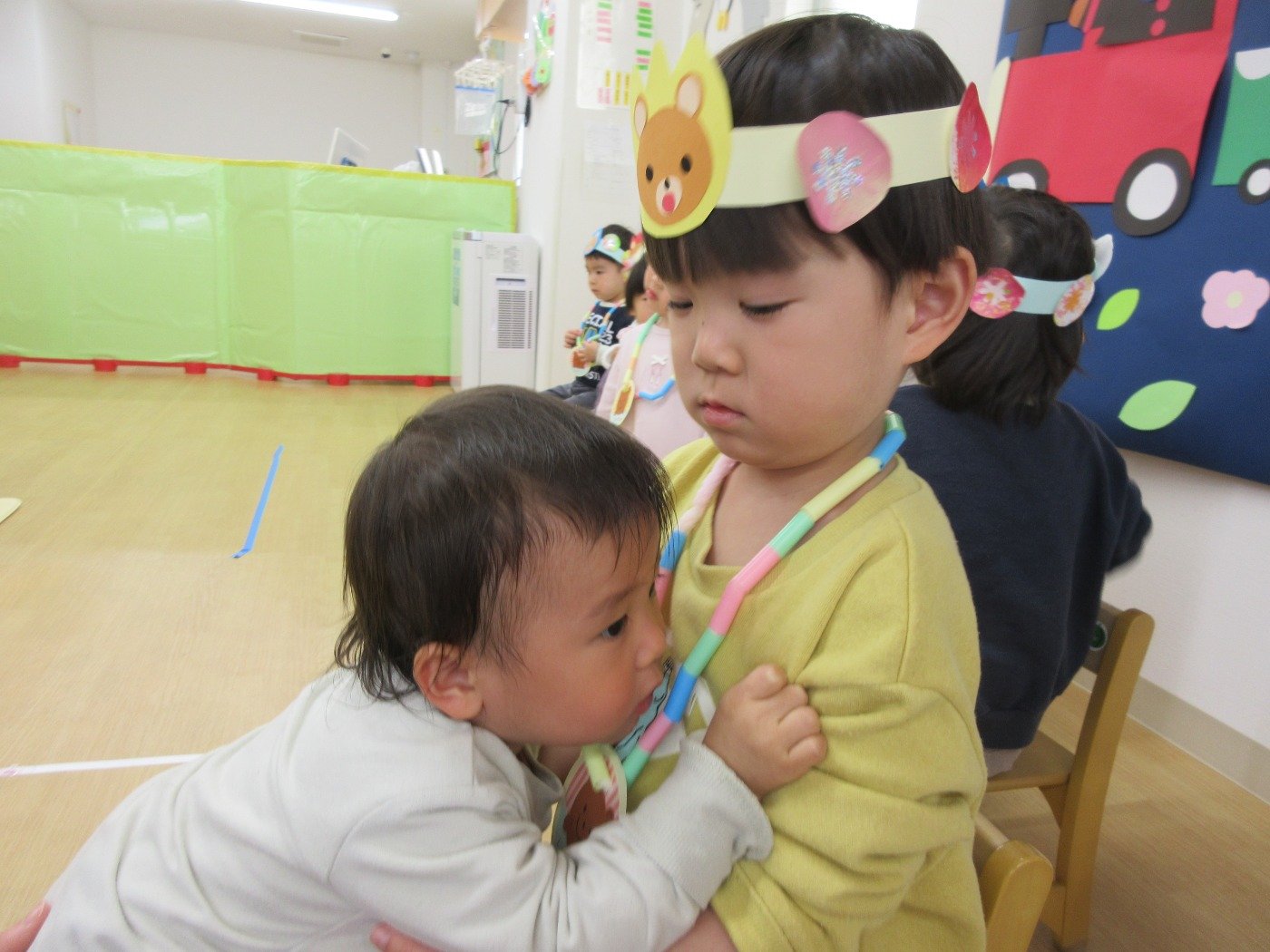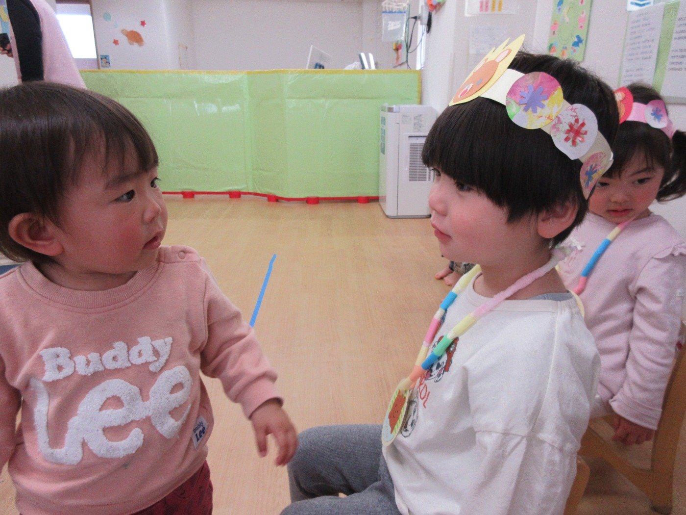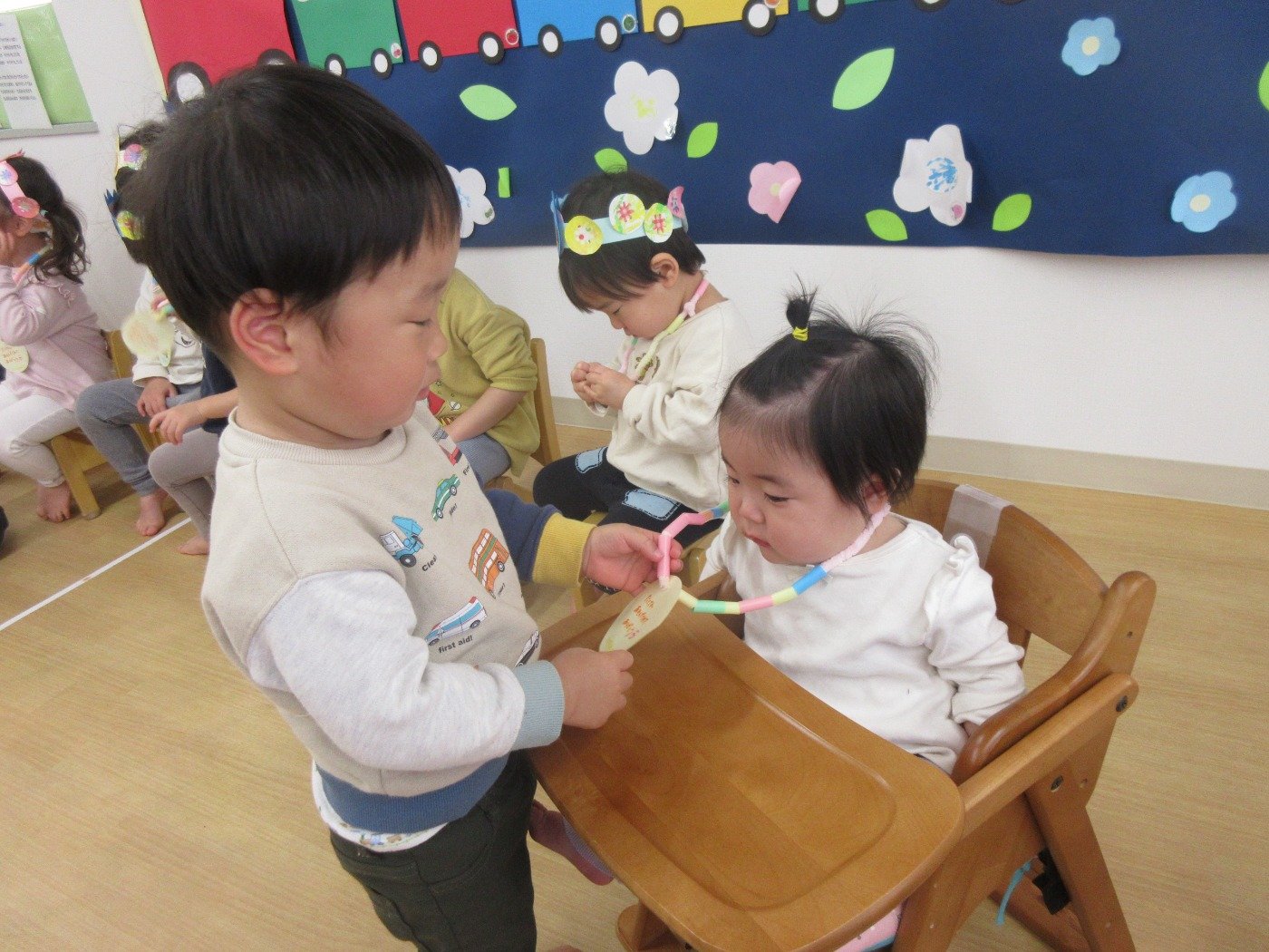 うさぎ組さんとひよこ組さんが、手作りのネックレスと王冠を