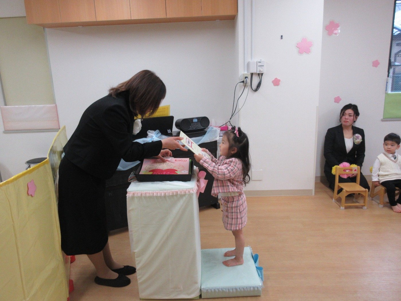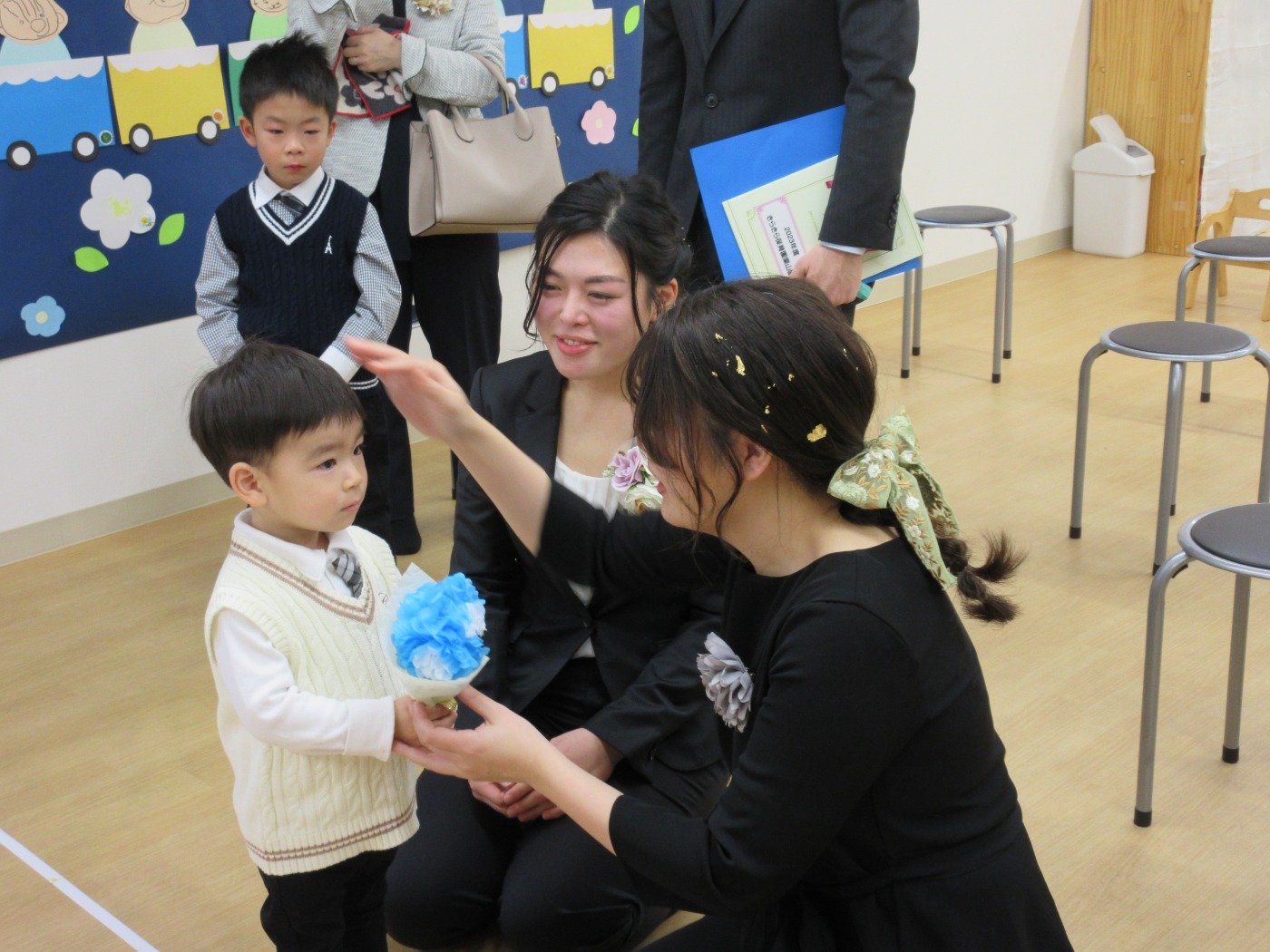 受け取った証書とおうちの人へのプレゼントを渡すと、