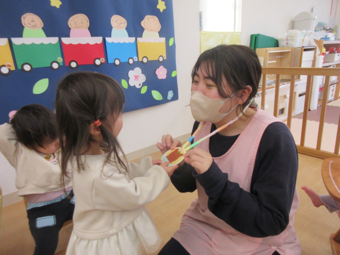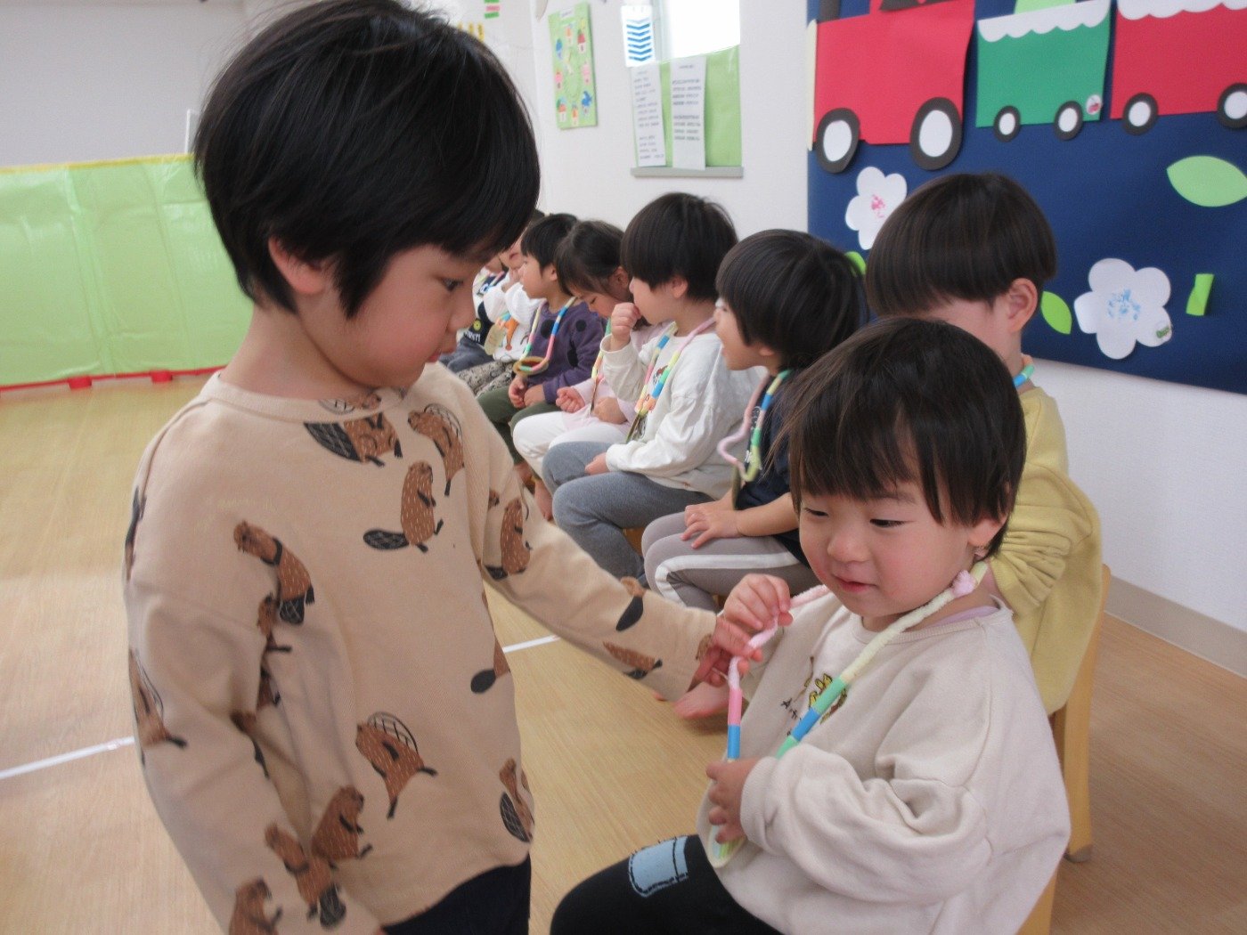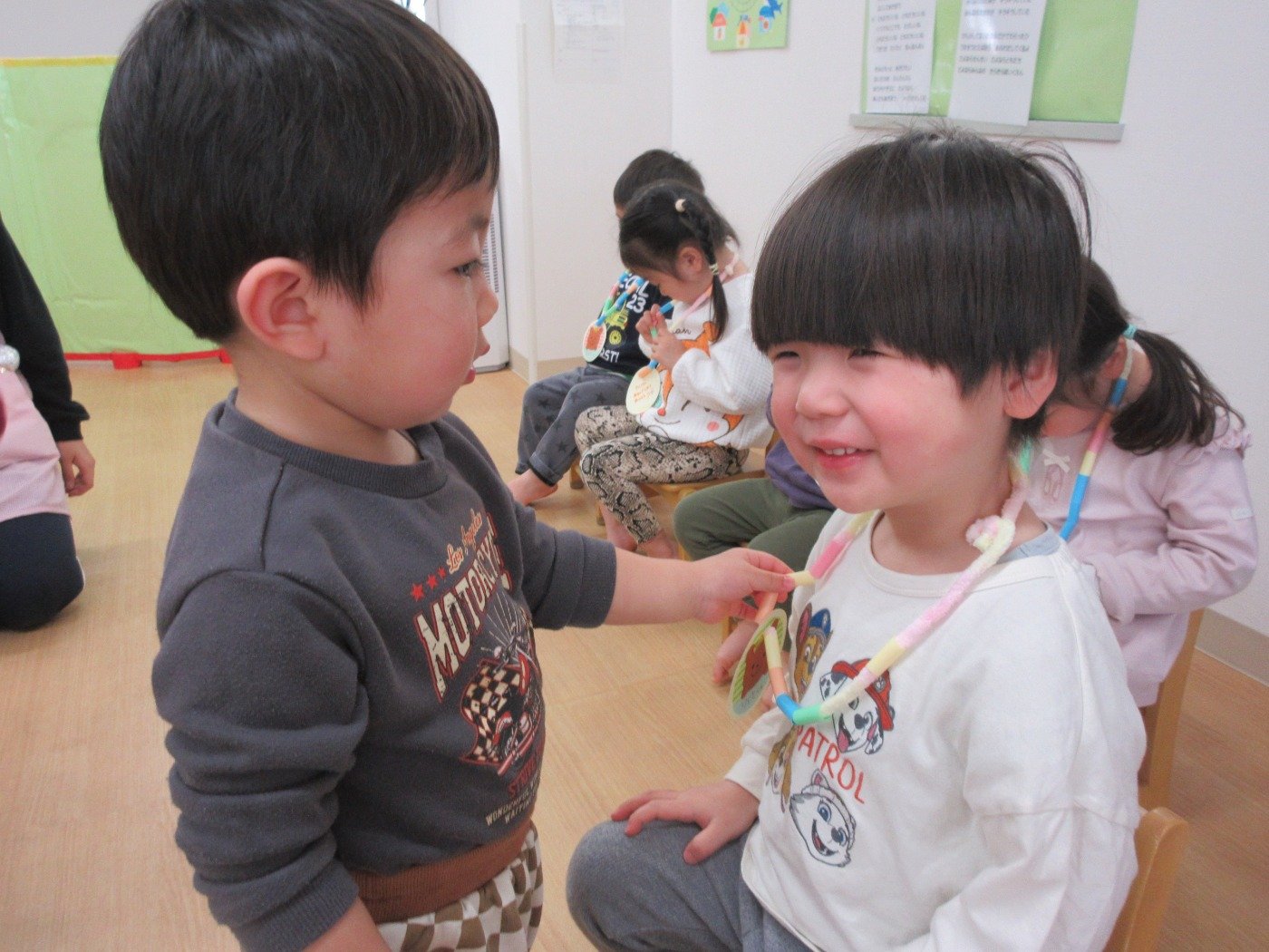 ネックレスはうさぎ組さんが、一生懸命ひも通しをして作ってくれました。