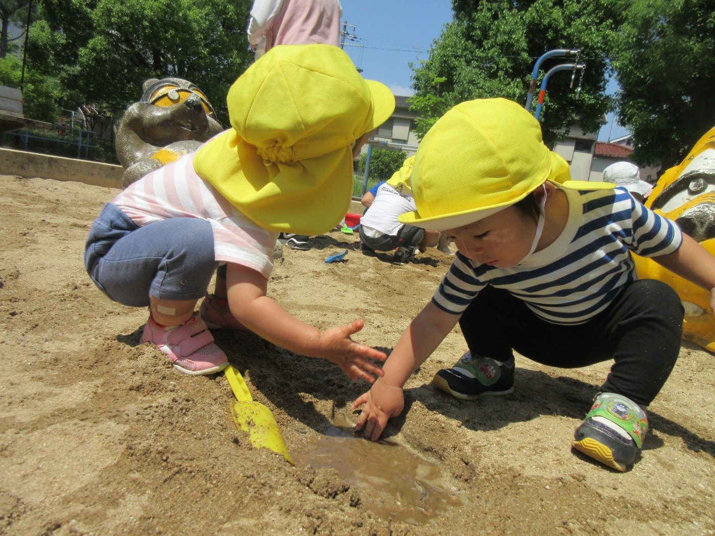 穴を掘って、水を流すと「それー!」おててを突っ込んだり、