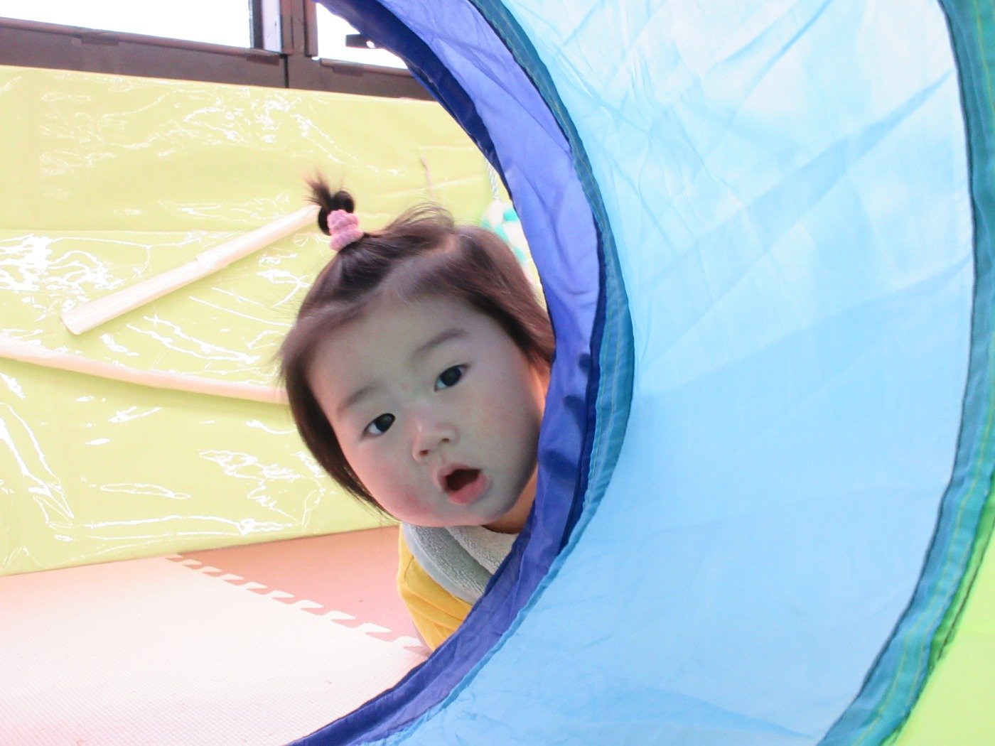 初めてのトンネルもニコニコ、手作りの壁面遊びにも夢中です。