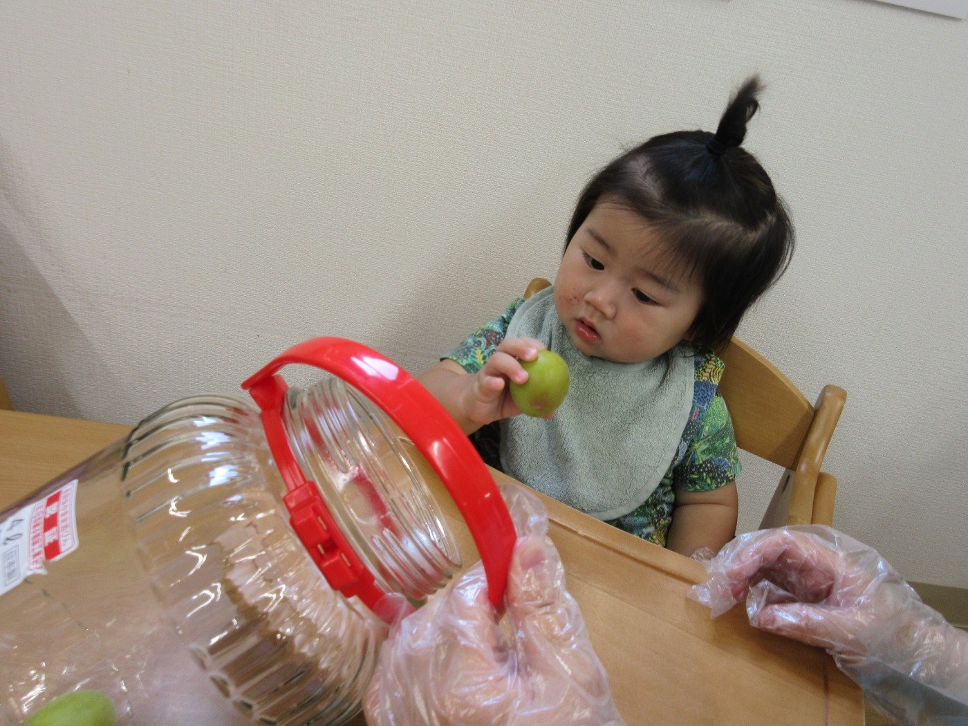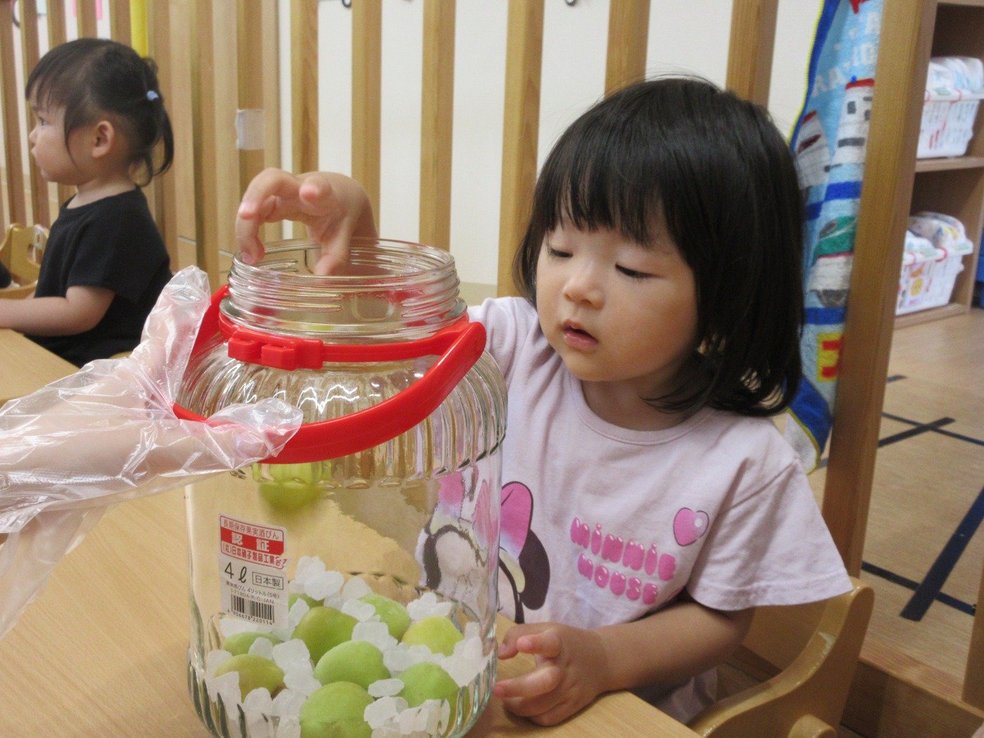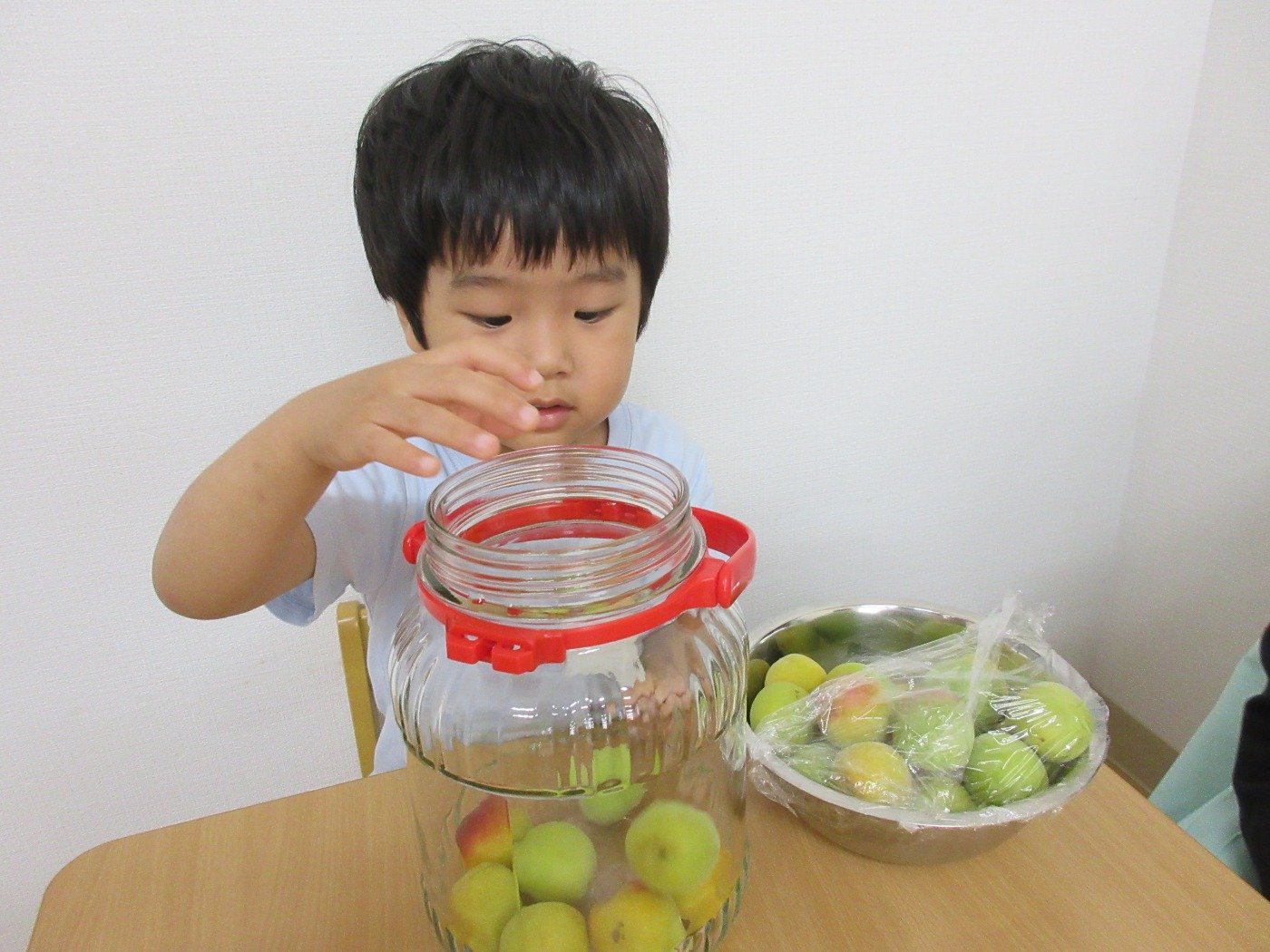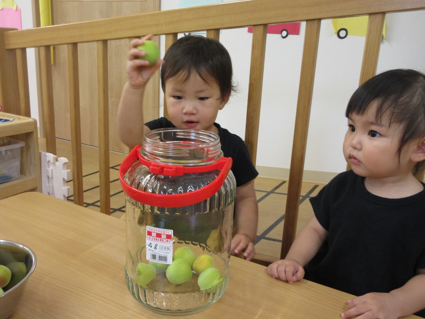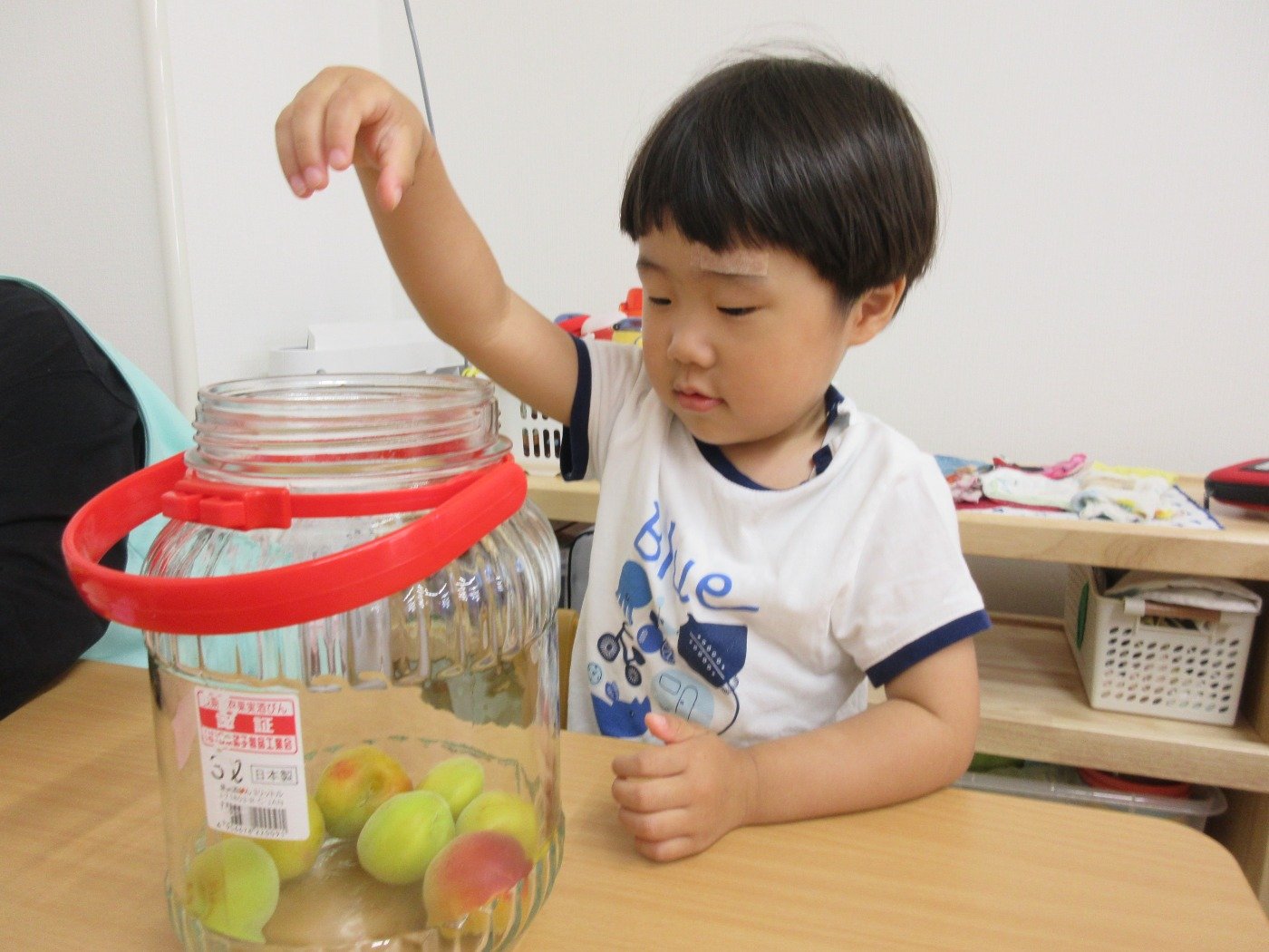 ひとつずつ梅を手に取りビンの中に入れていきました。