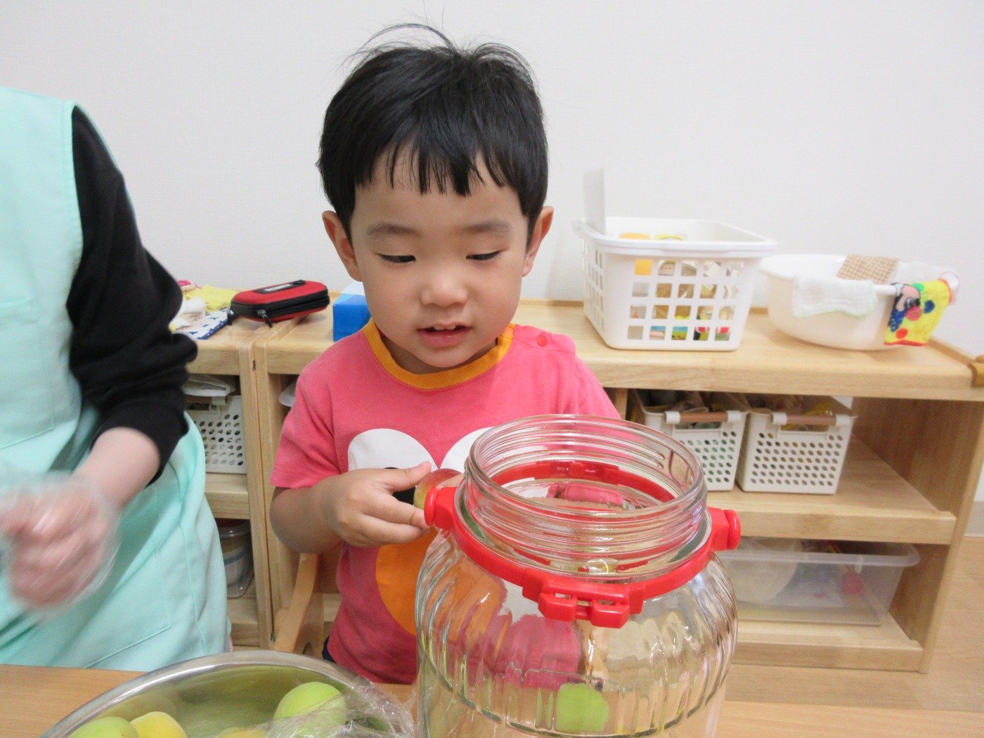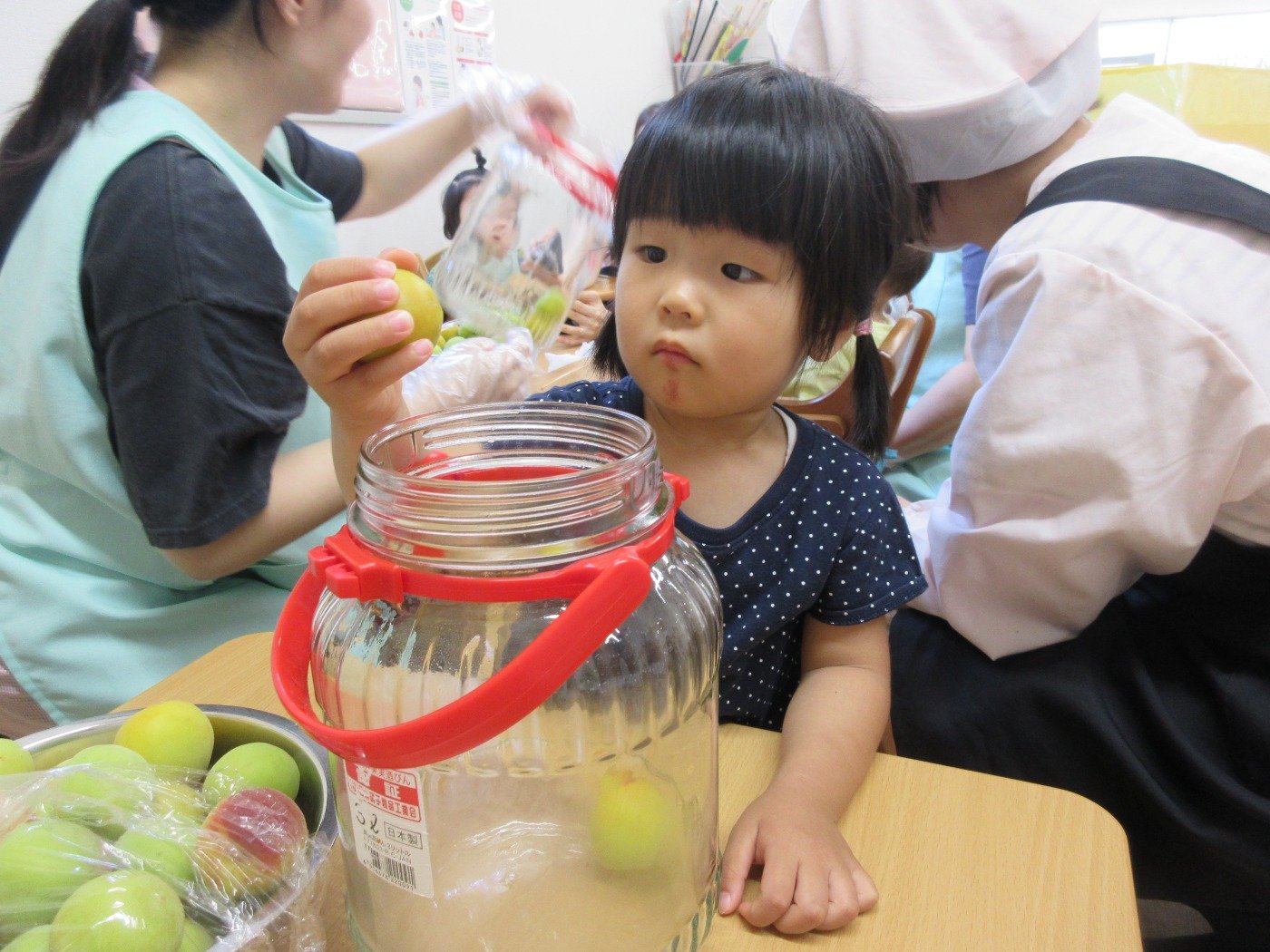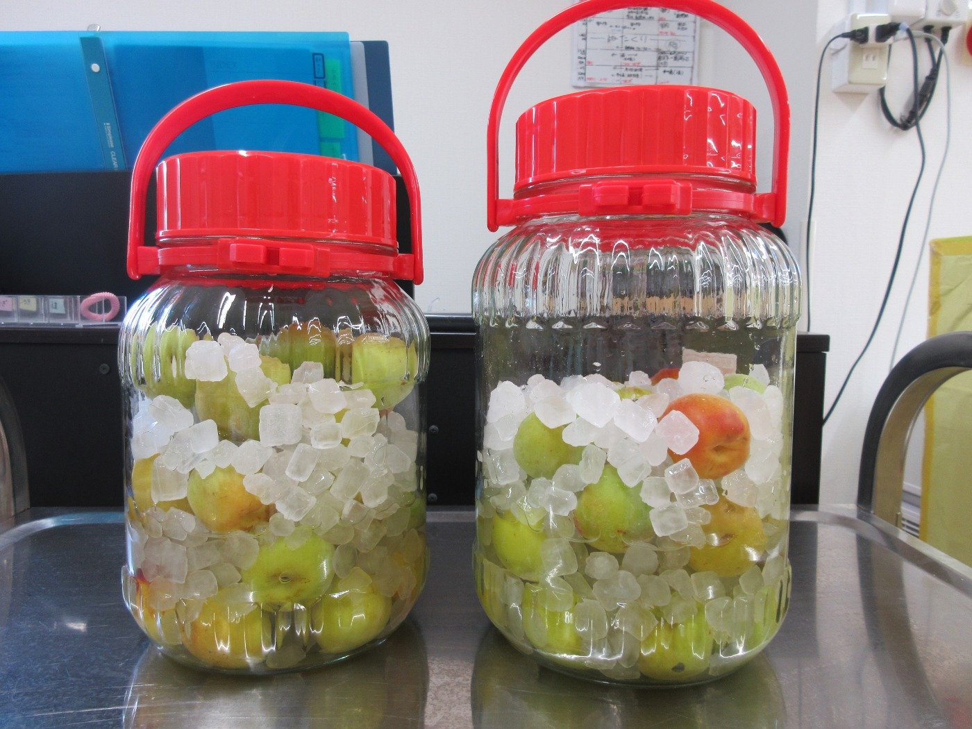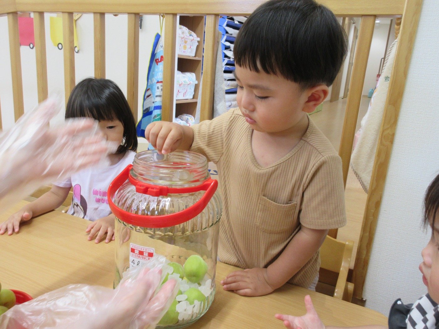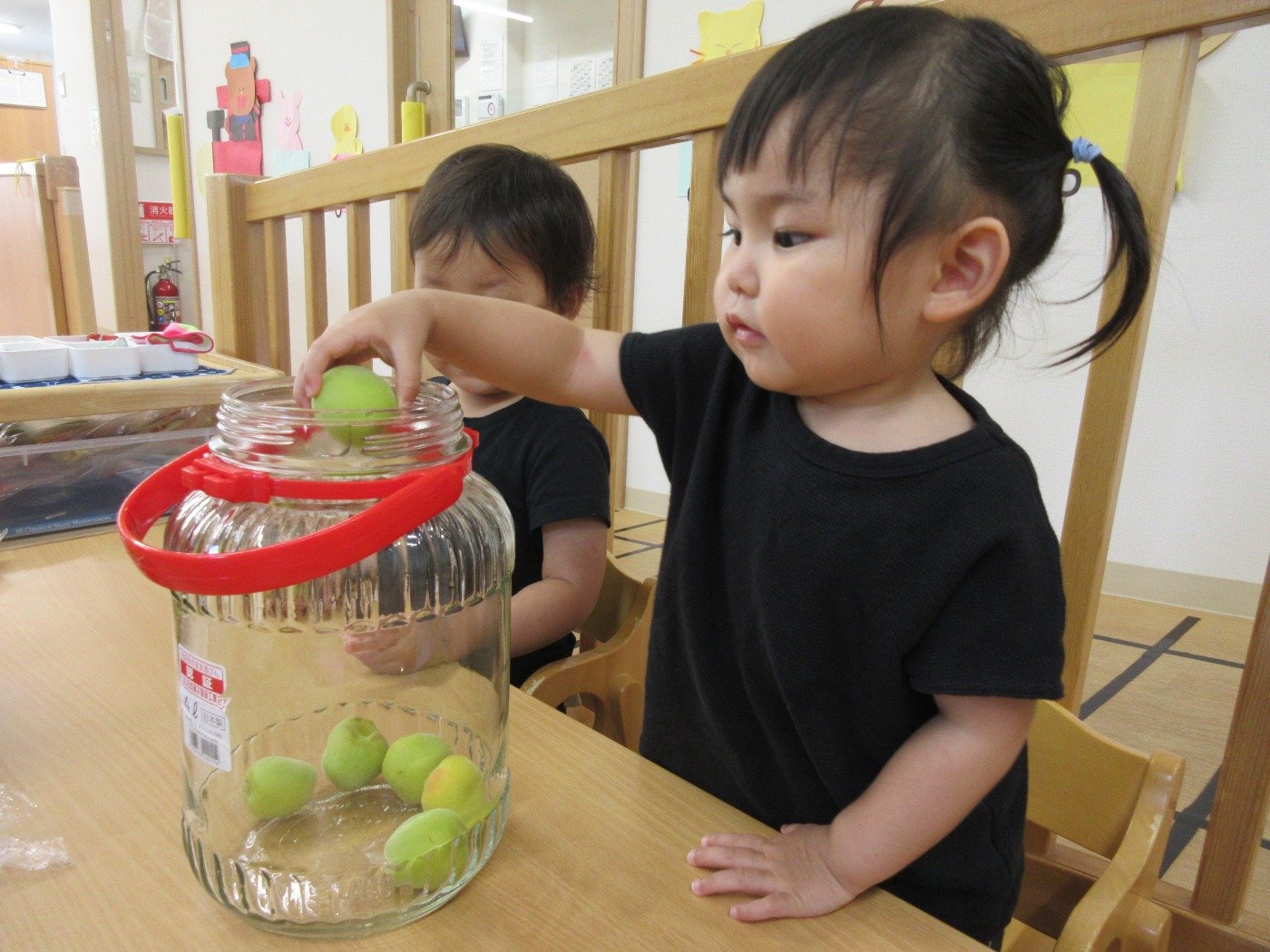 ひとつずつ梅を手に取りビンの中に入れていきました。