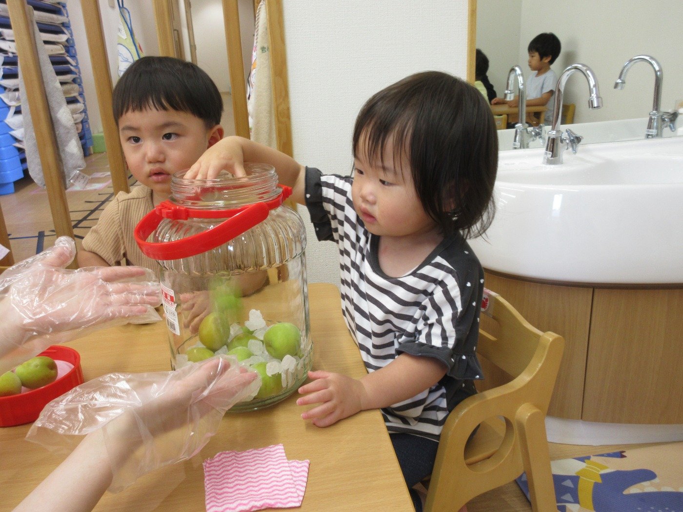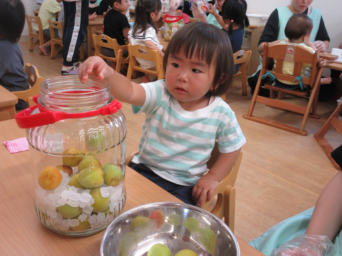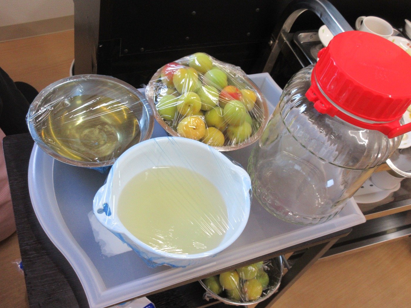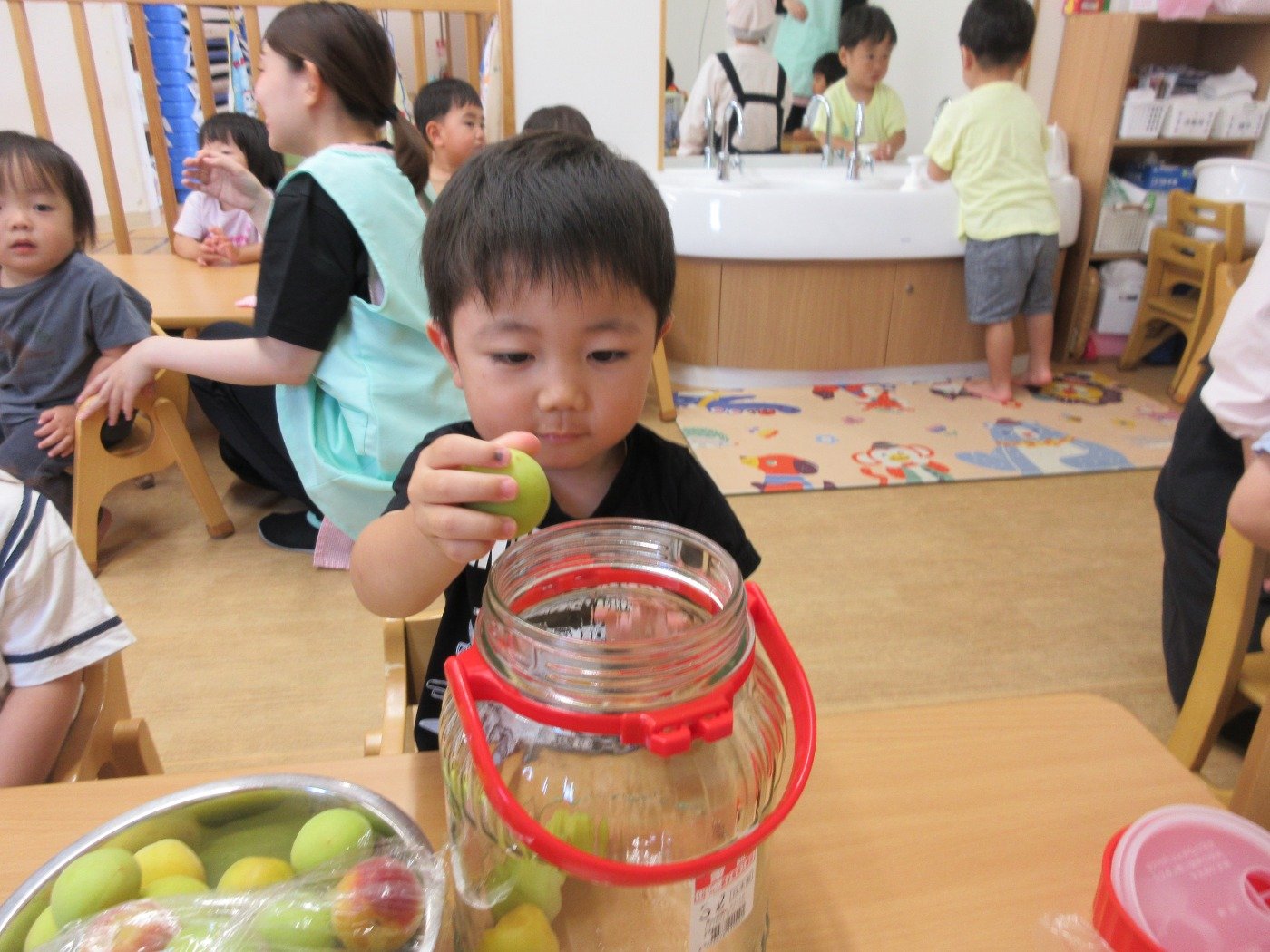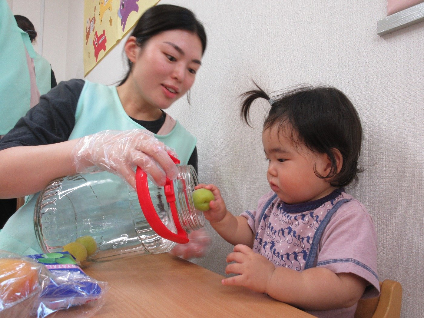 ひとつずつ梅を手に取りビンの中に入れていきました。