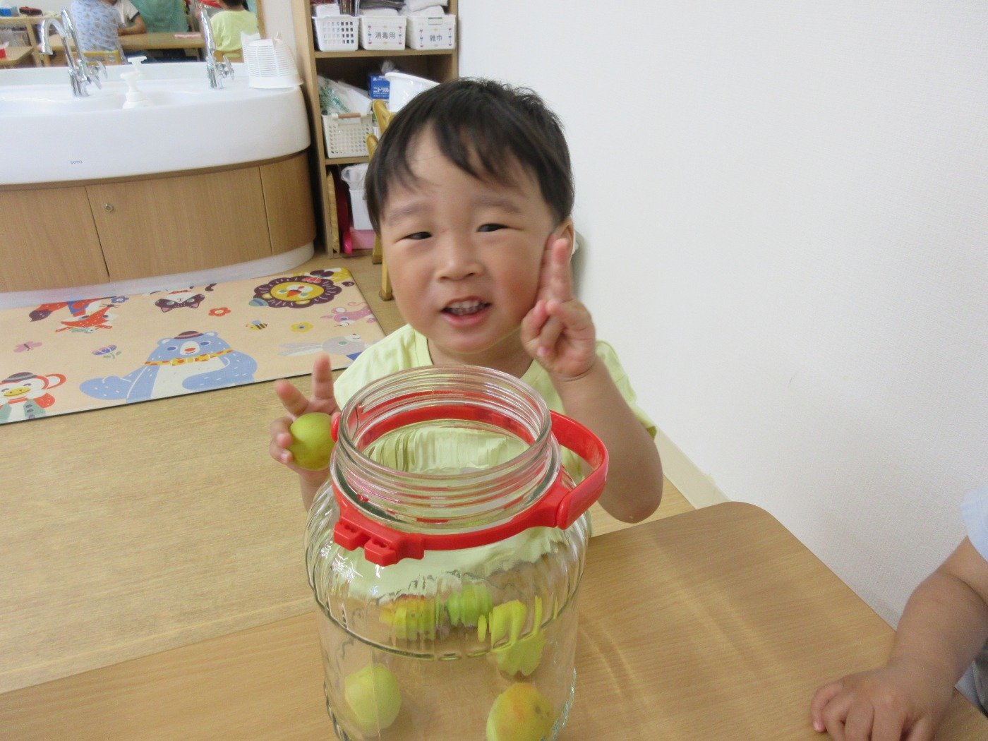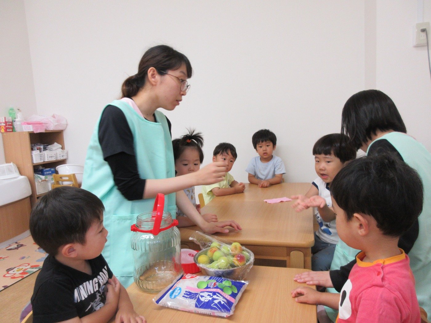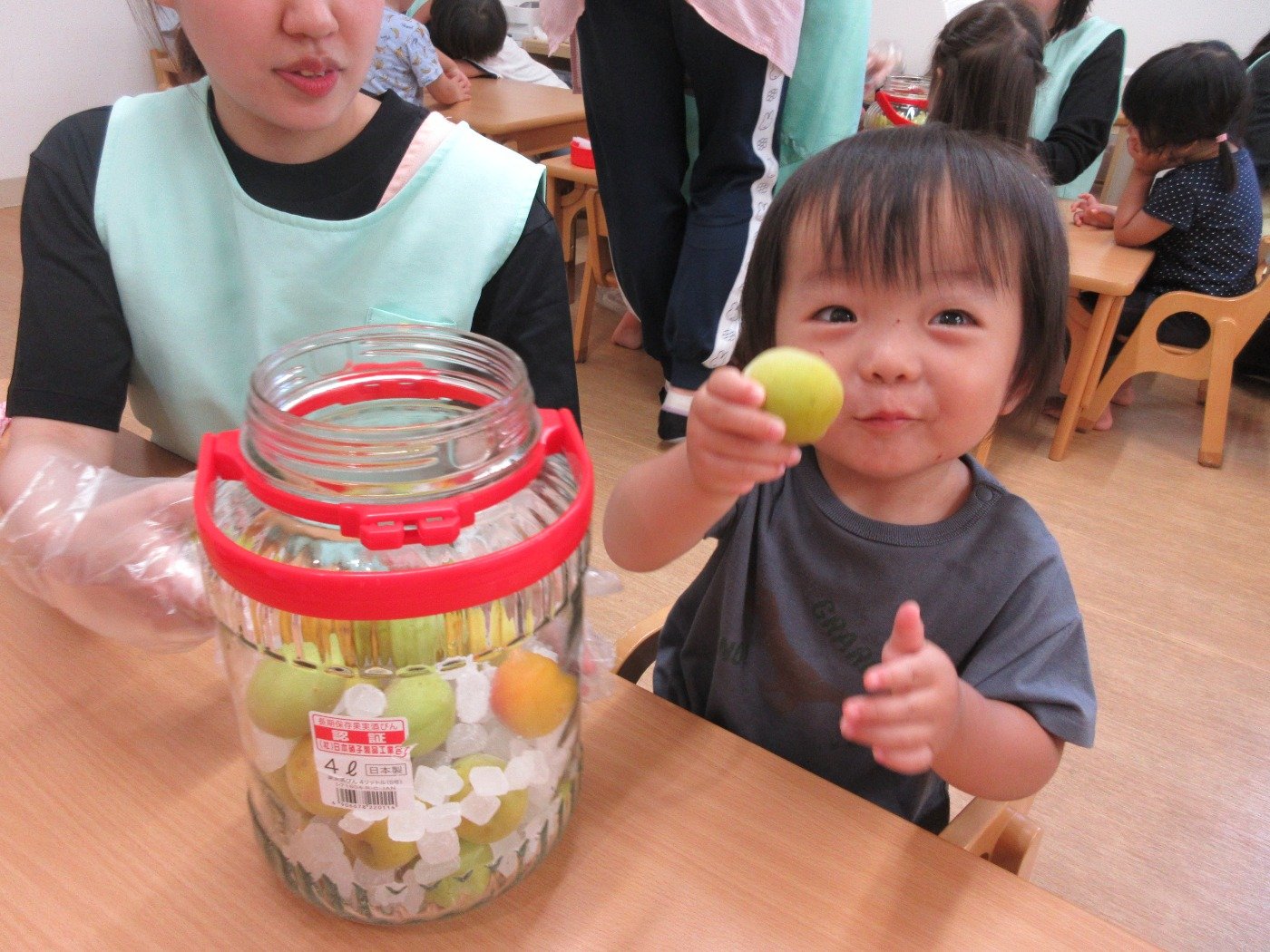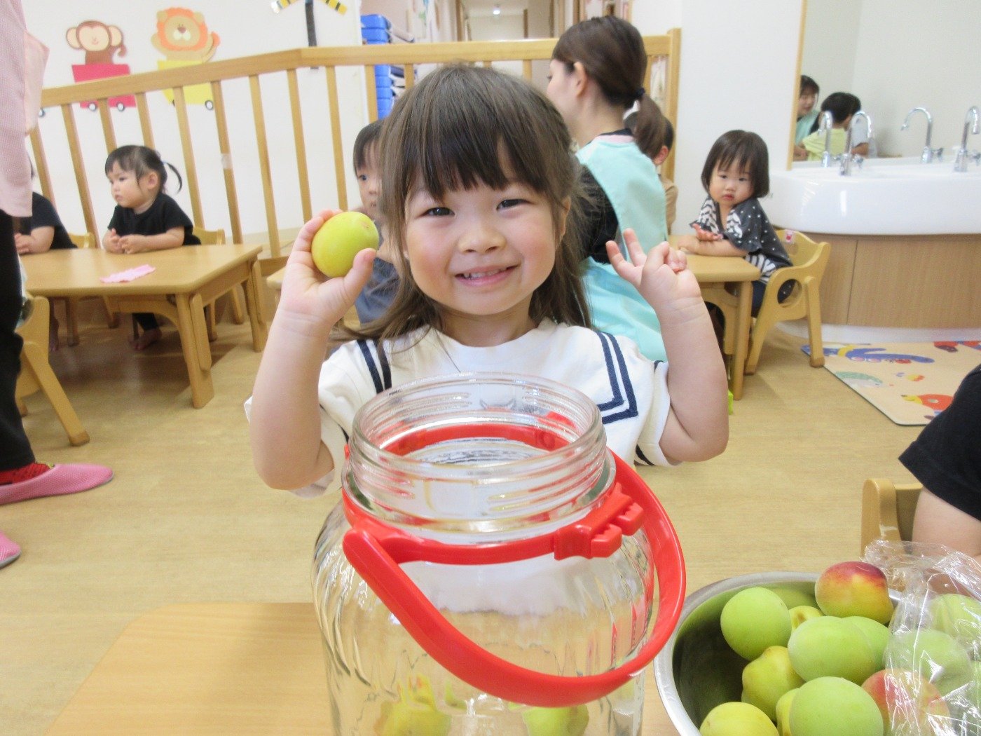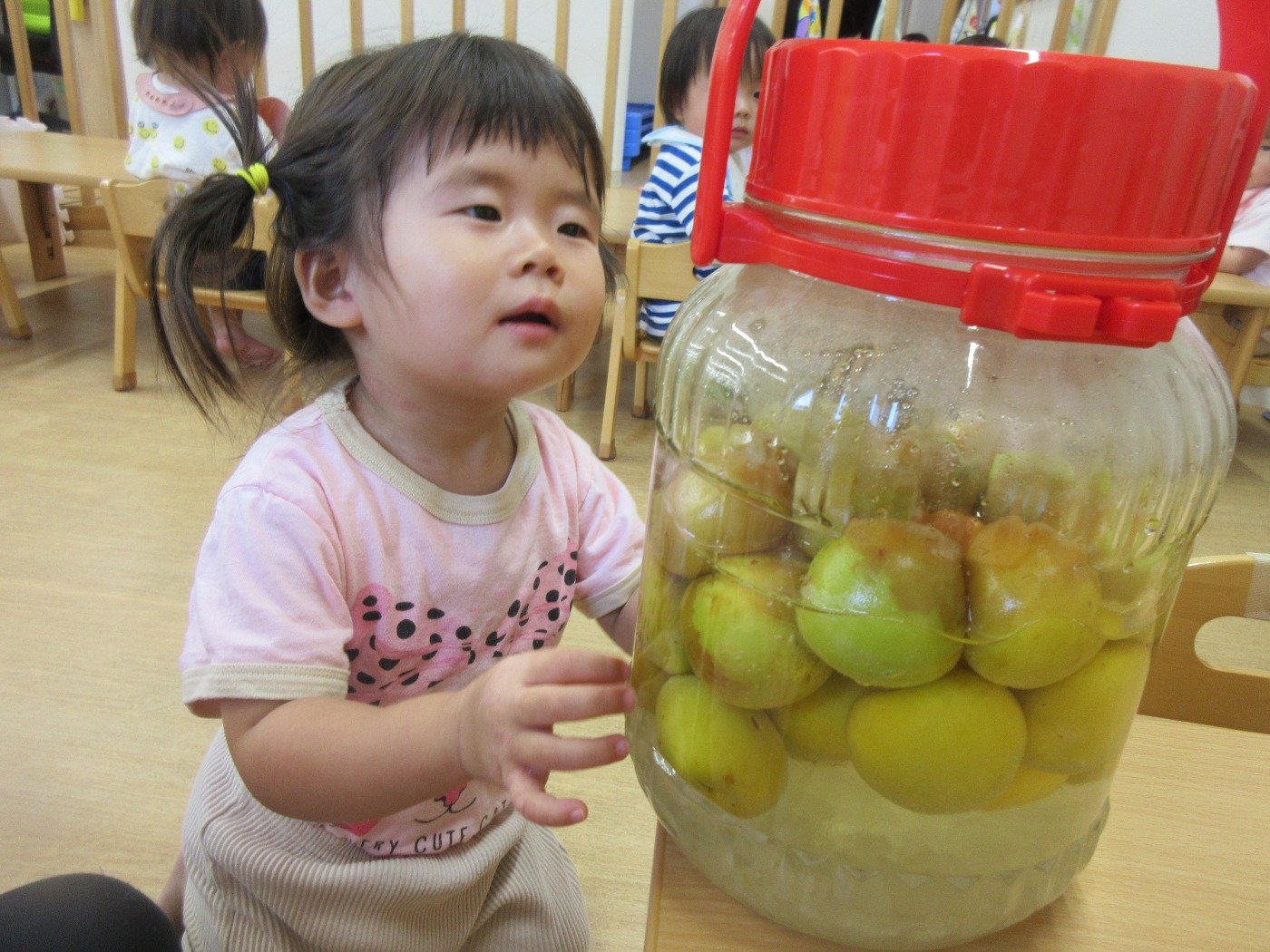 ひとつずつ梅を手に取りビンの中に入れていきました。