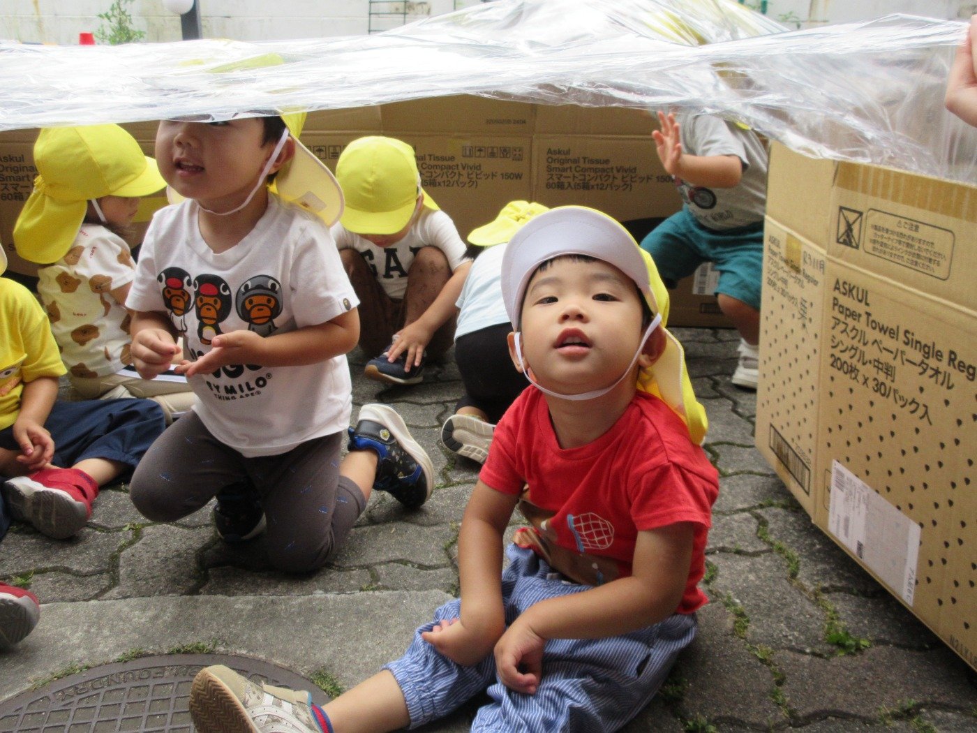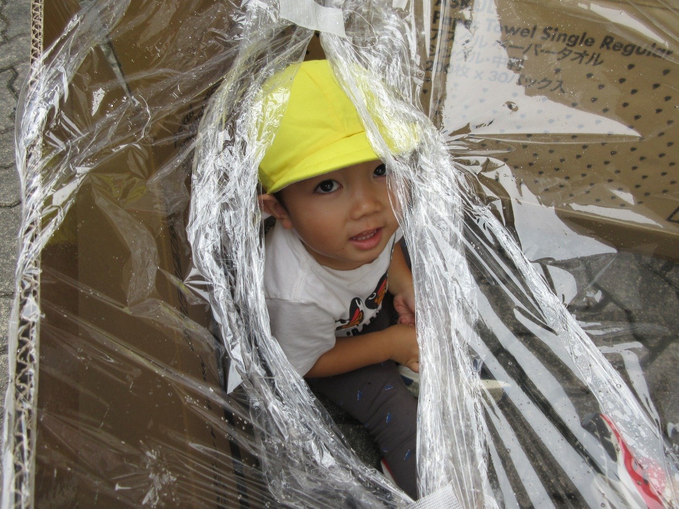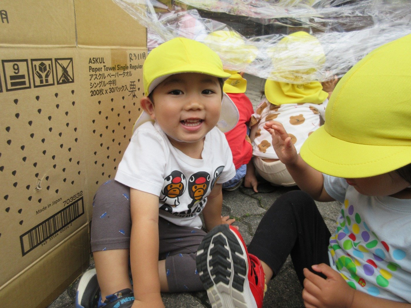 「近くで見てみようか?!」と、この前遊んだダンボールハウス