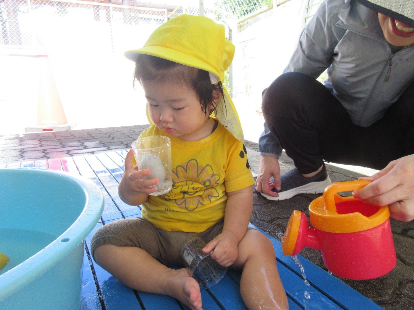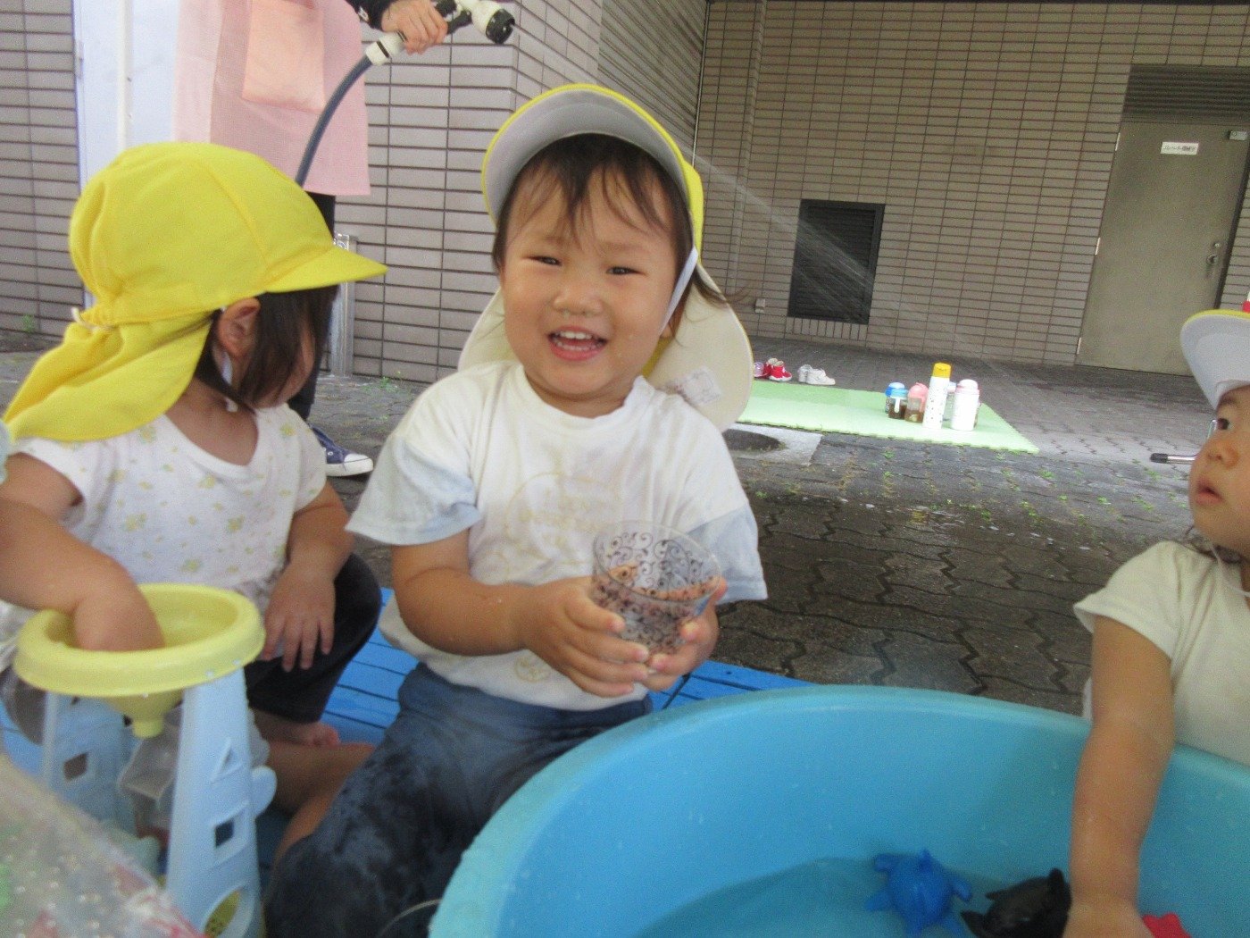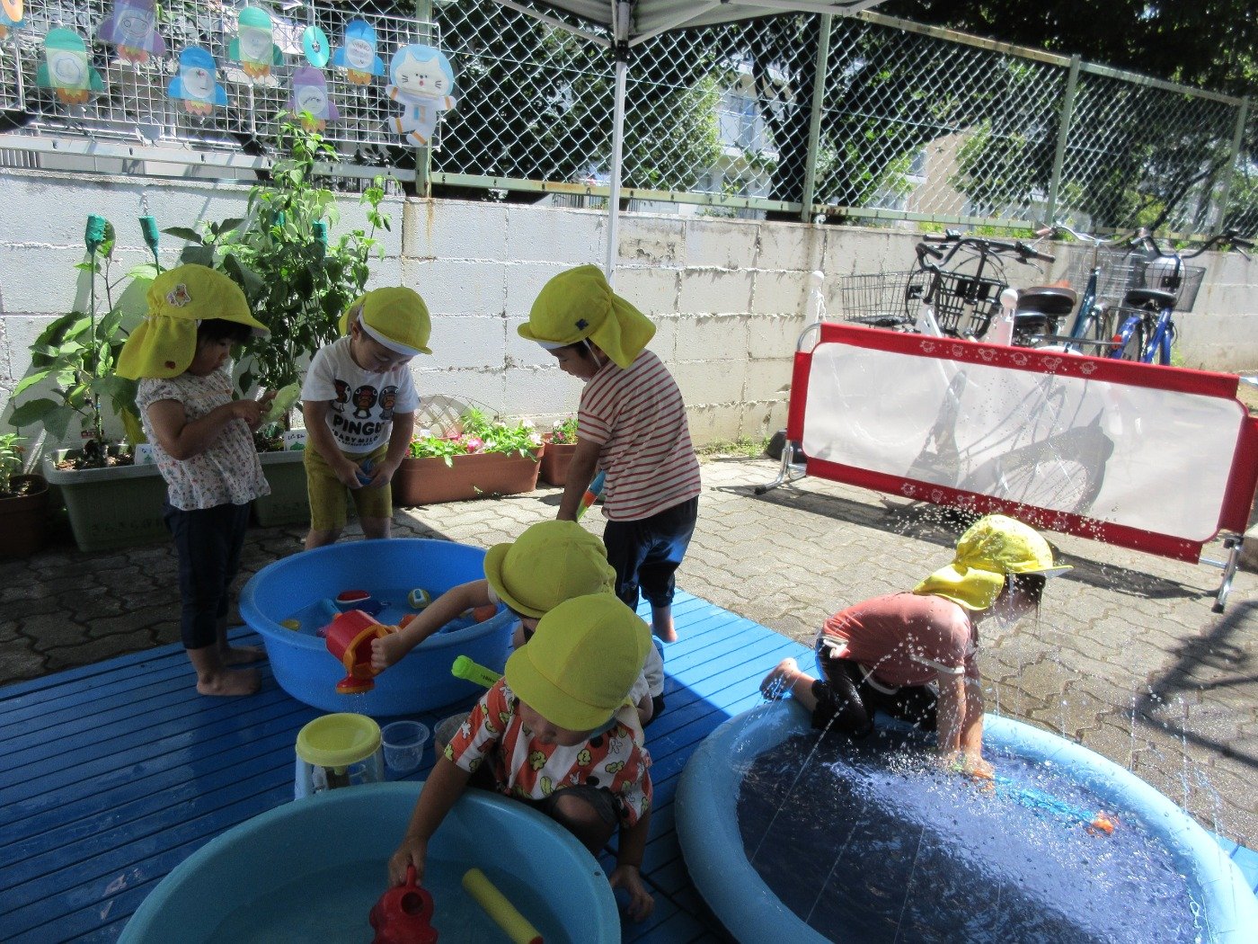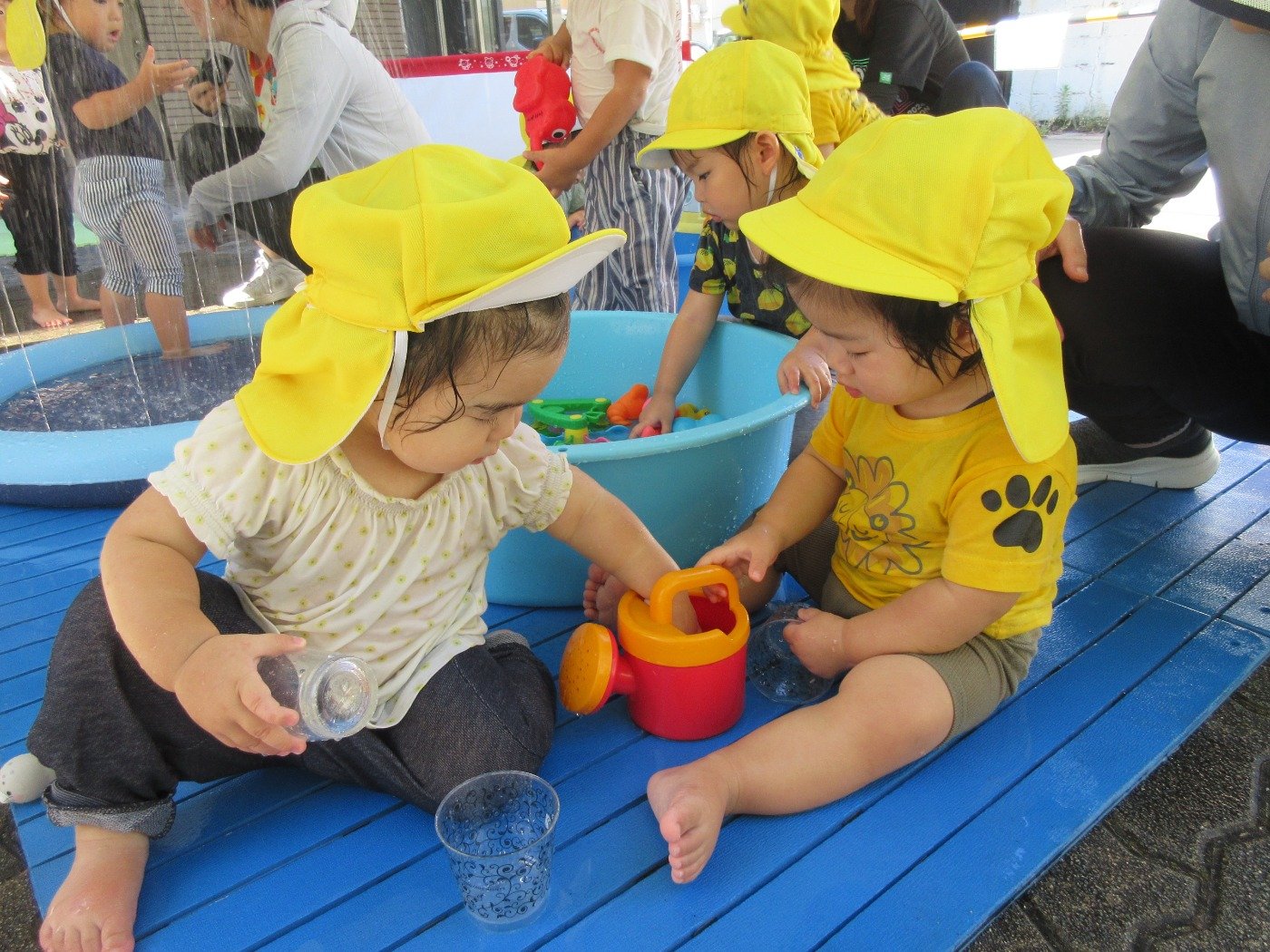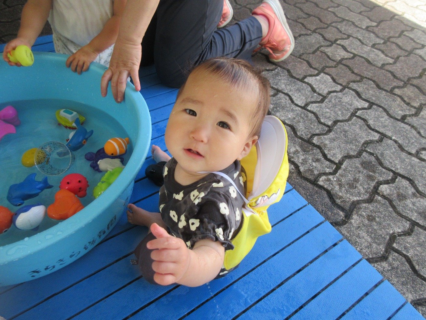 ひよこ組さんのお友だちは、初めての水遊びです。