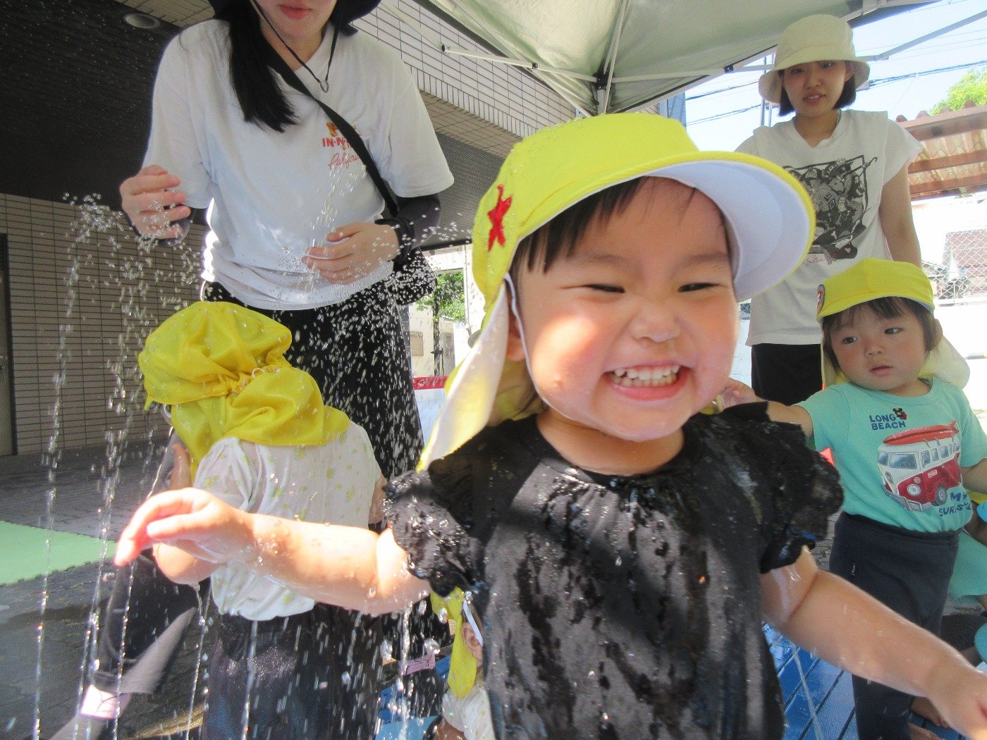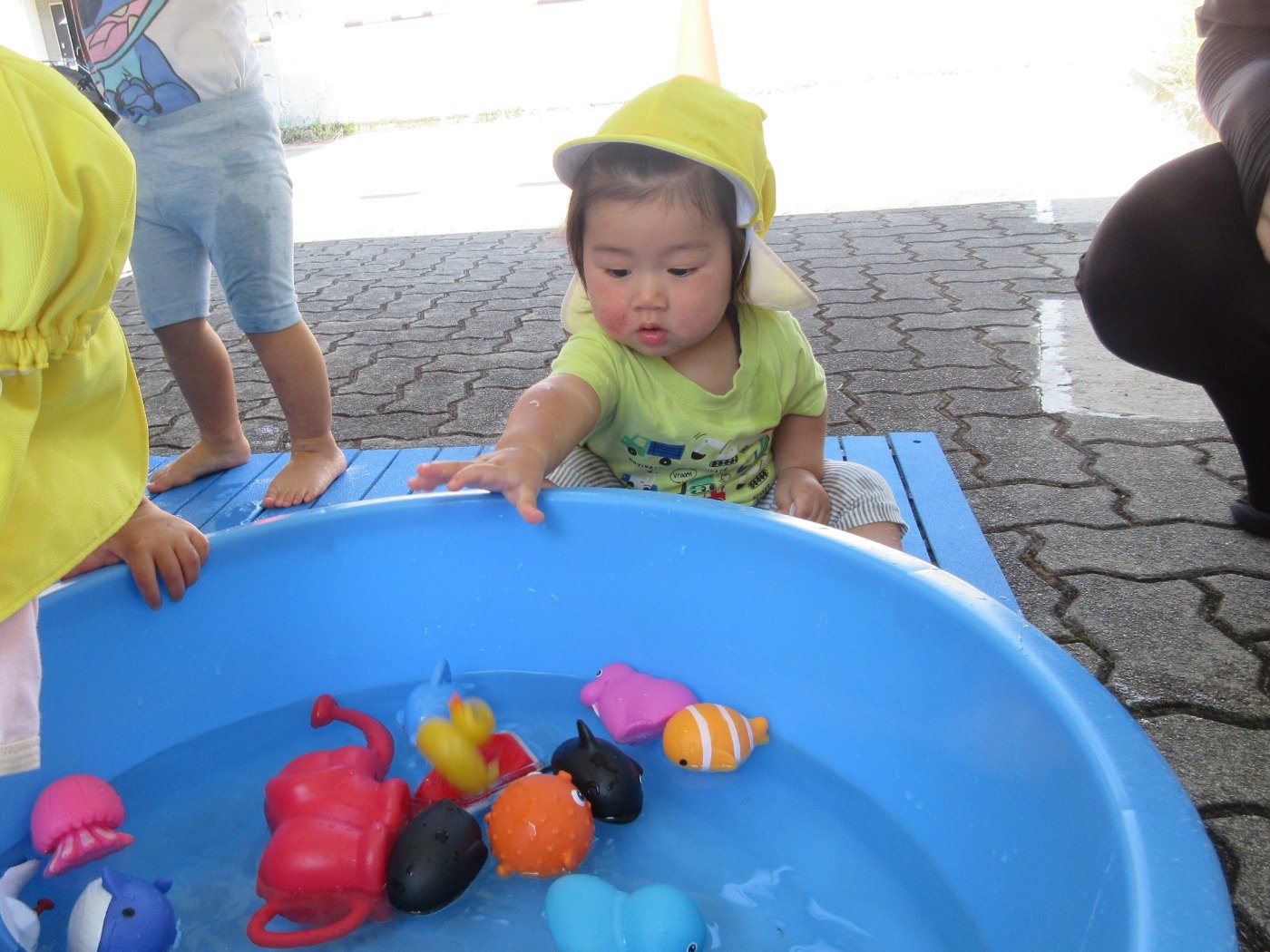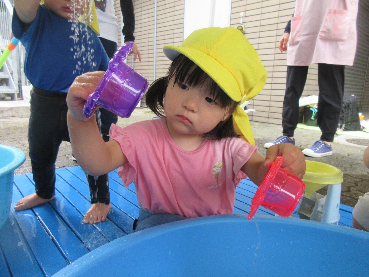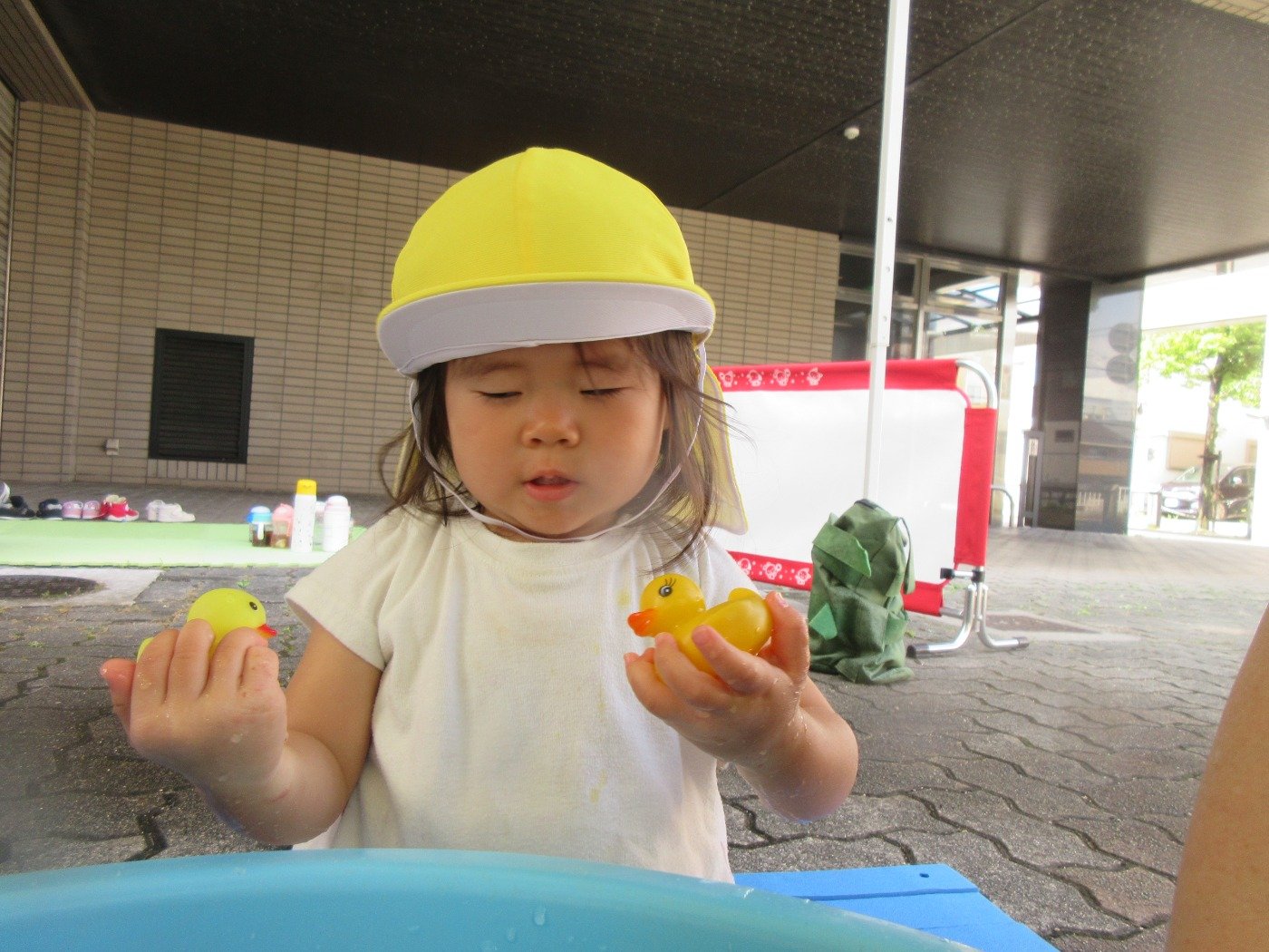 ひよこ組さんのお友だちは、初めての水遊びです。