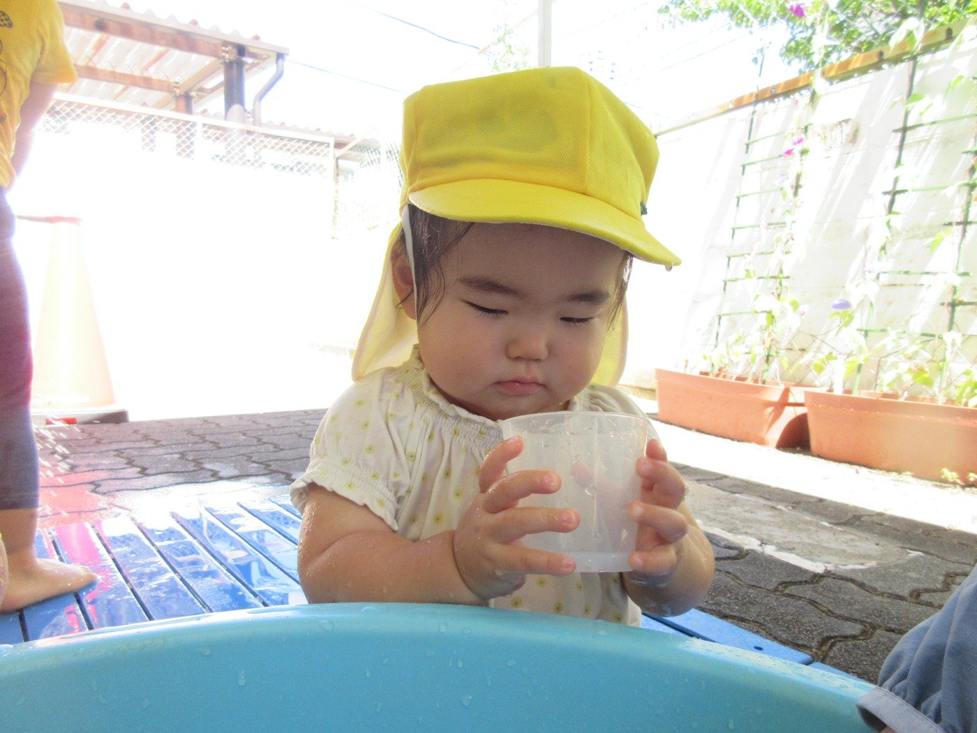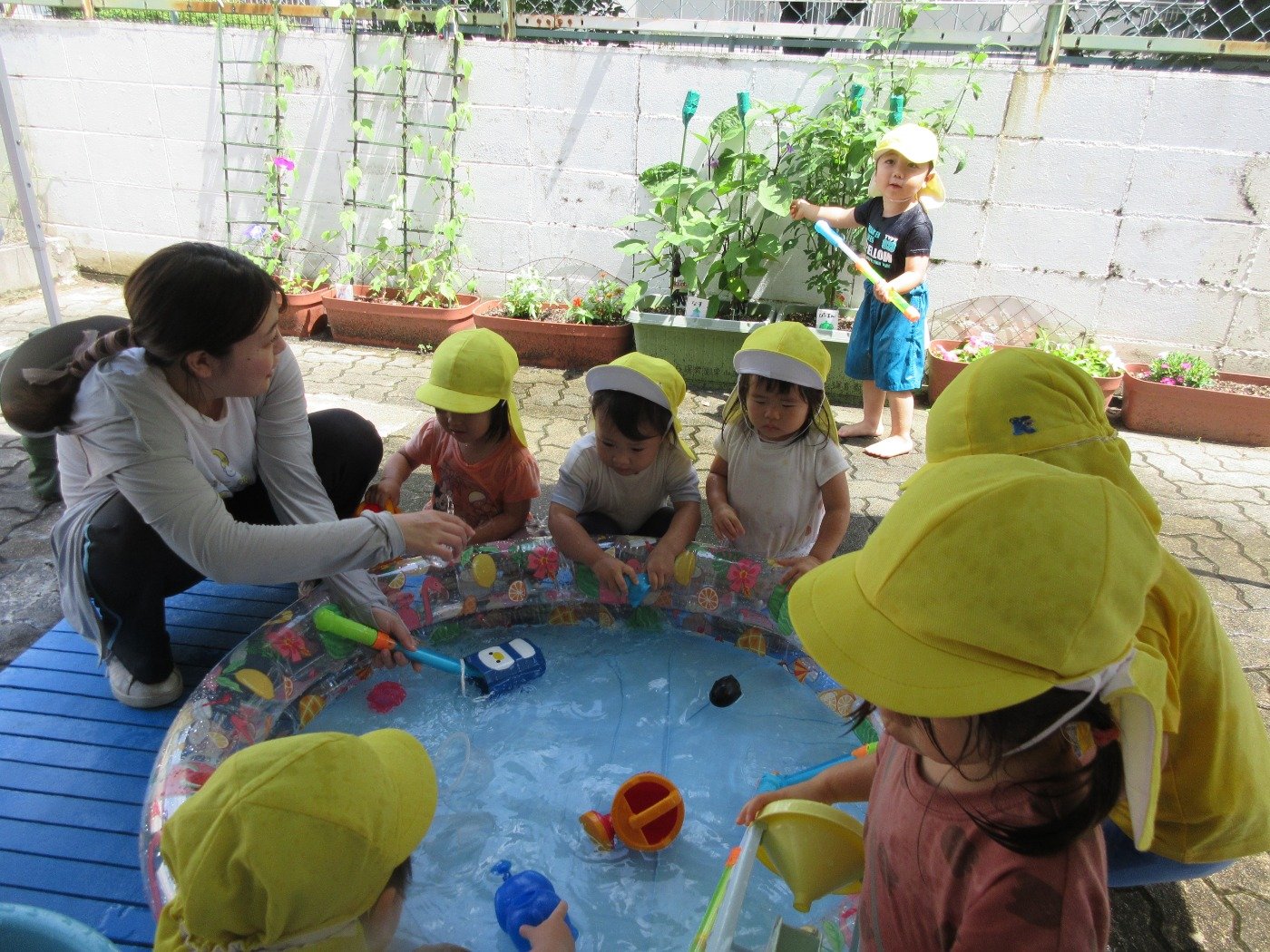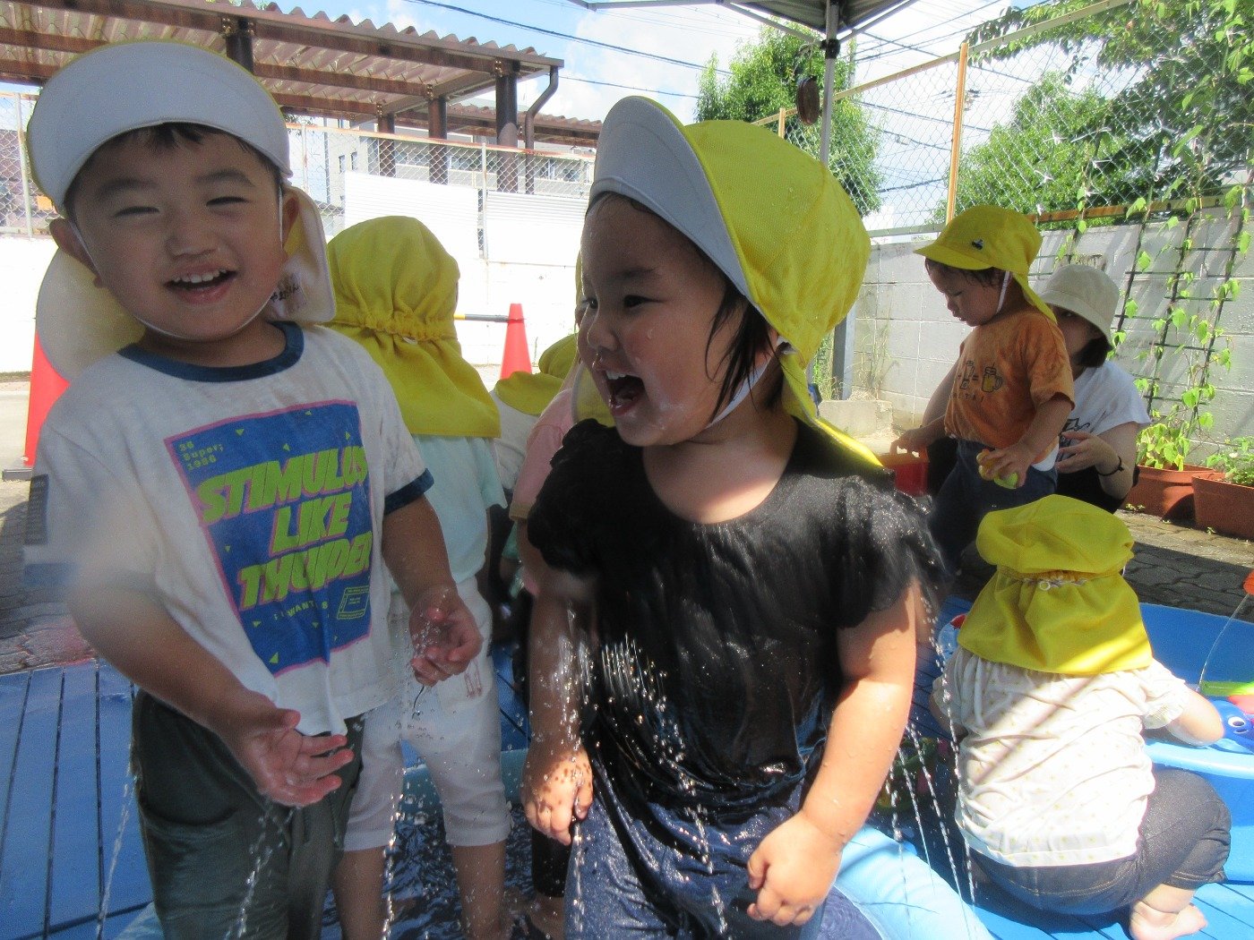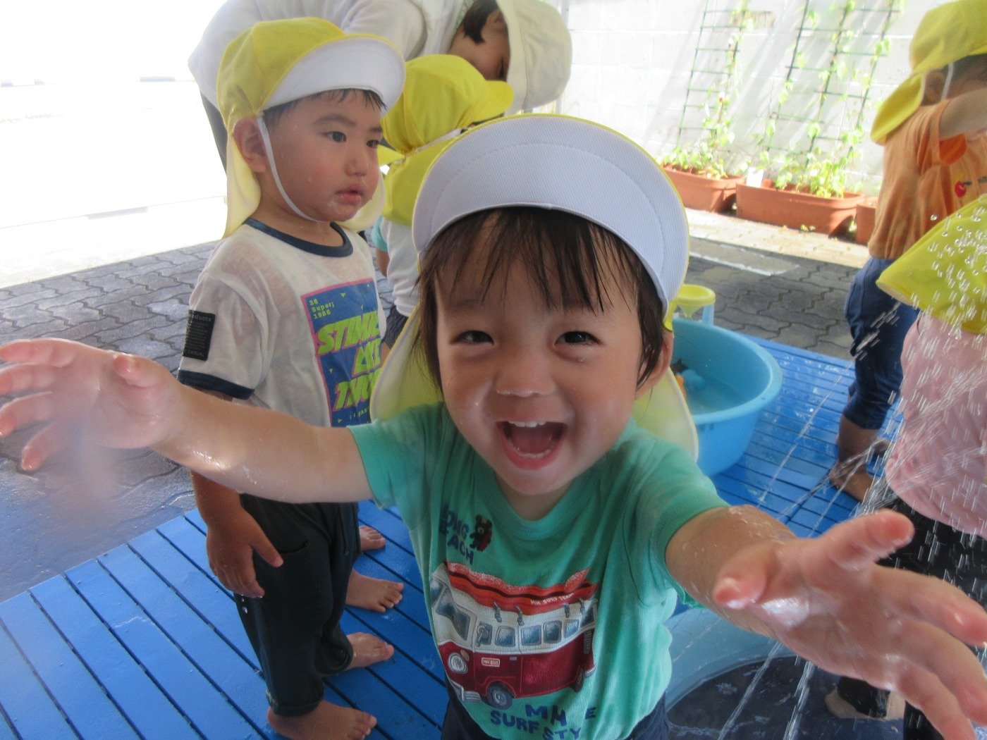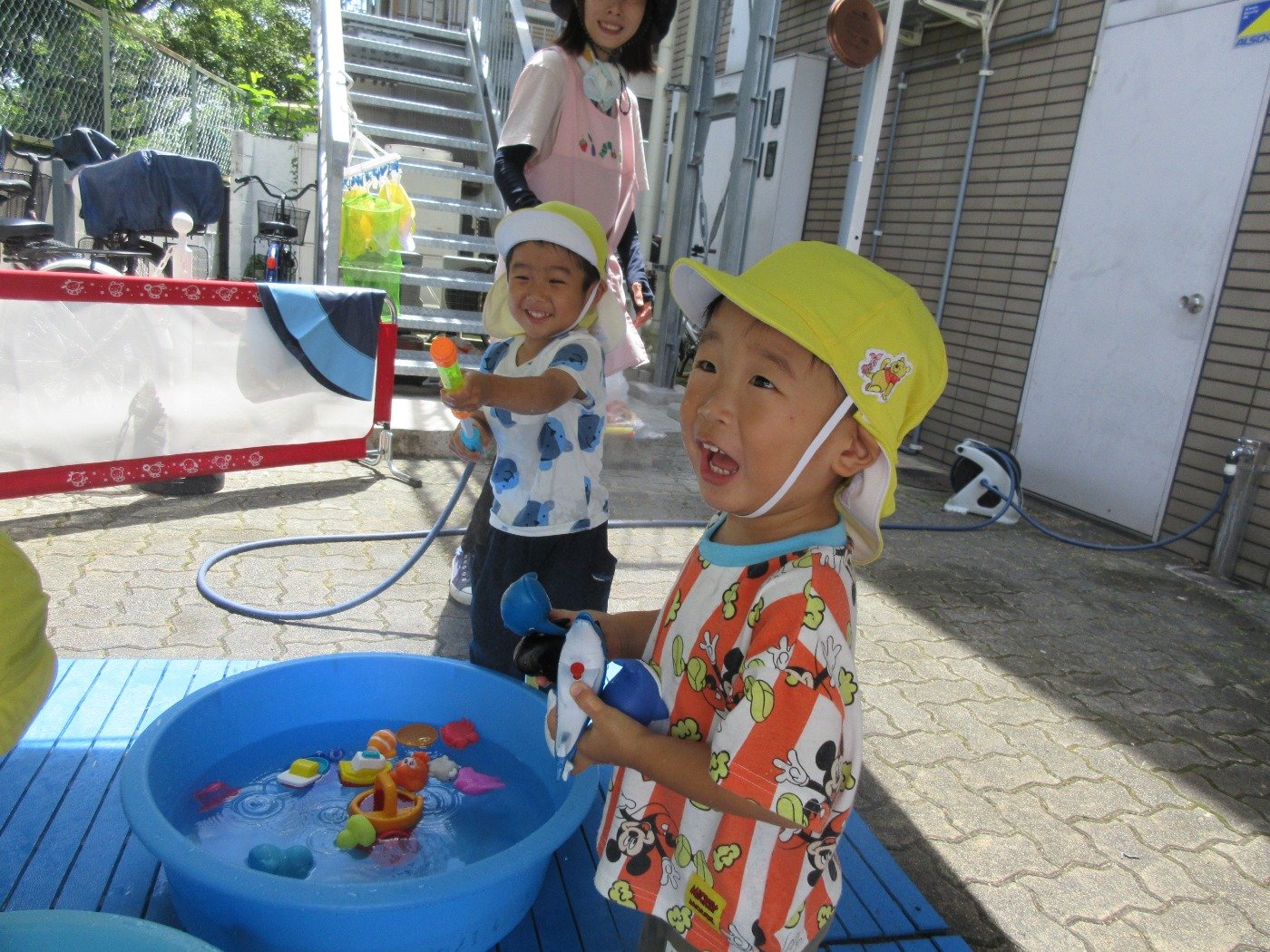 ひよこ組さんのお友だちは、初めての水遊びです。