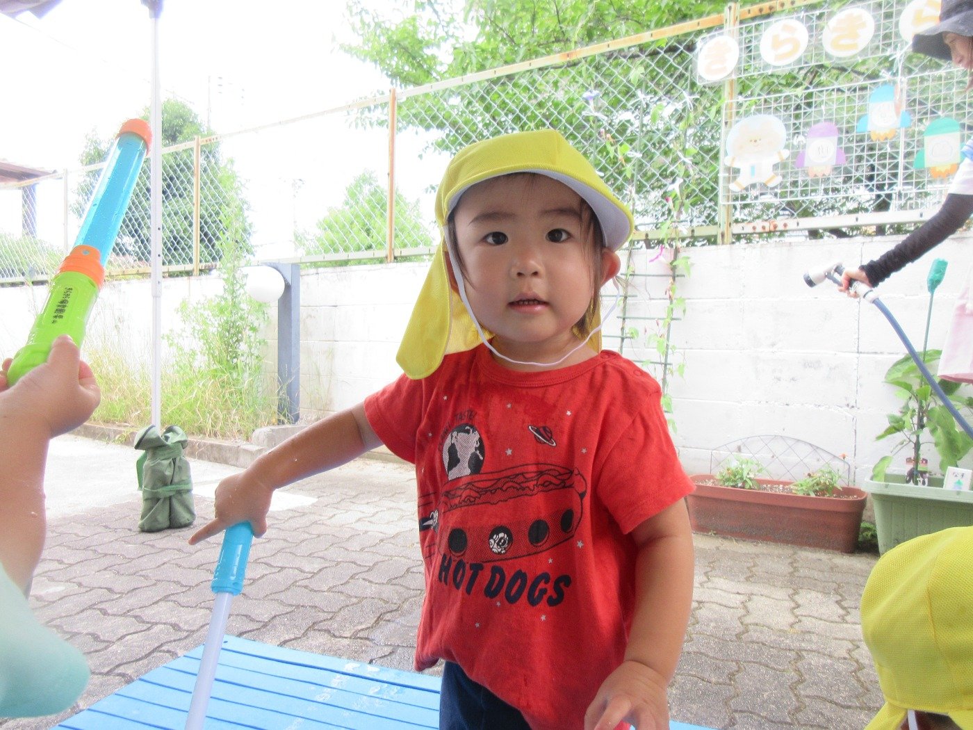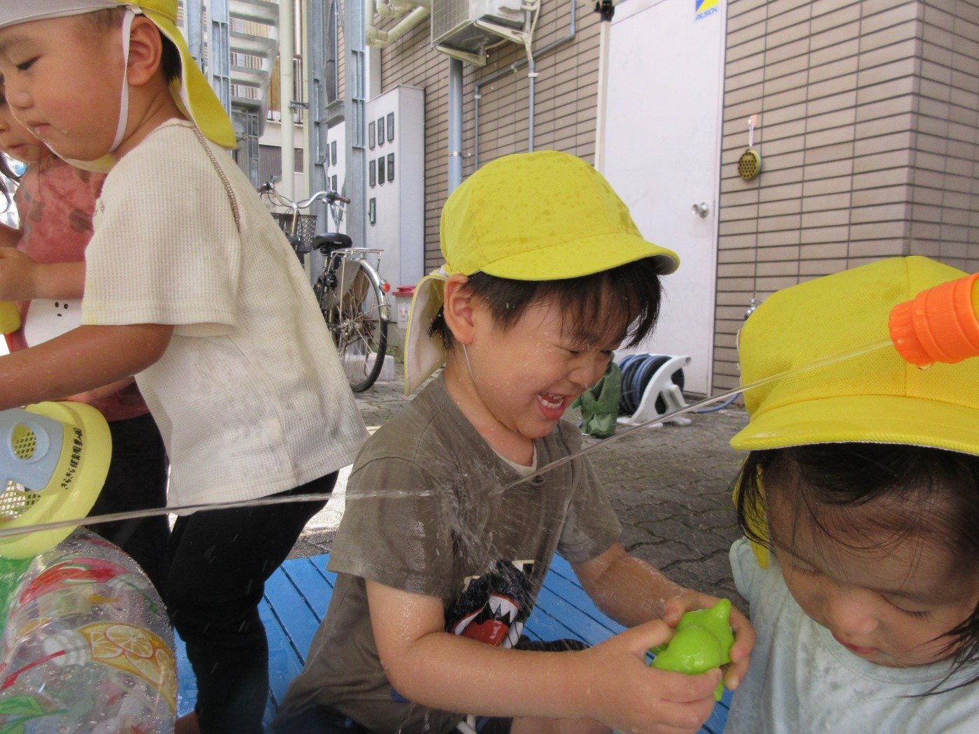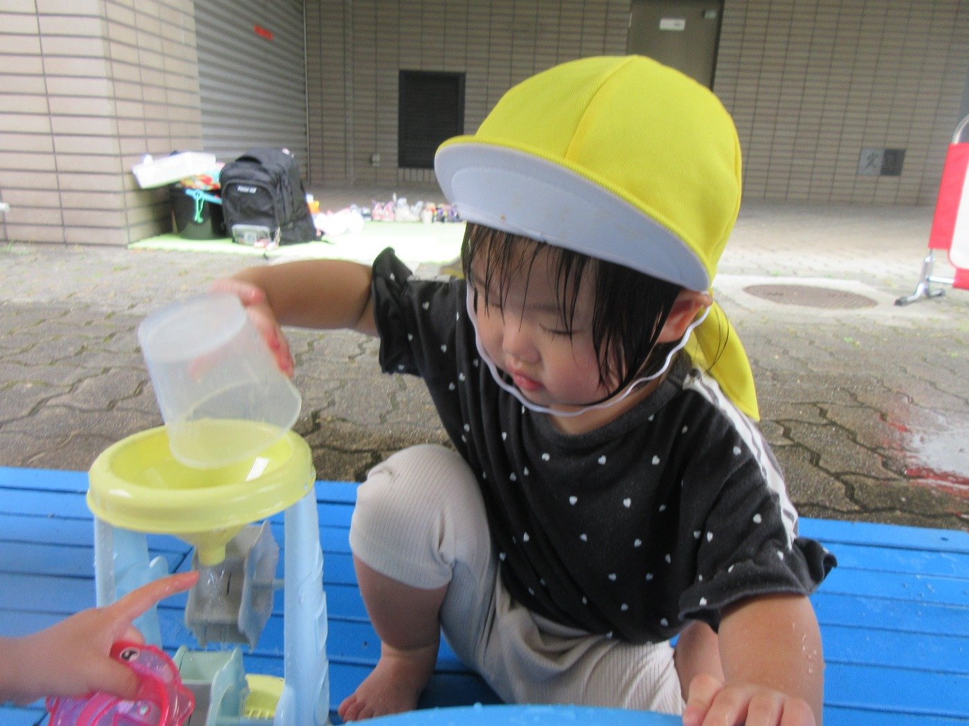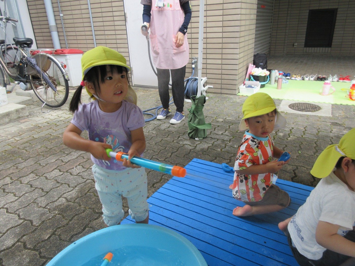 ひよこ組さんのお友だちは、初めての水遊びです。