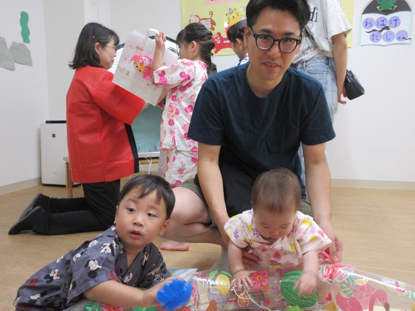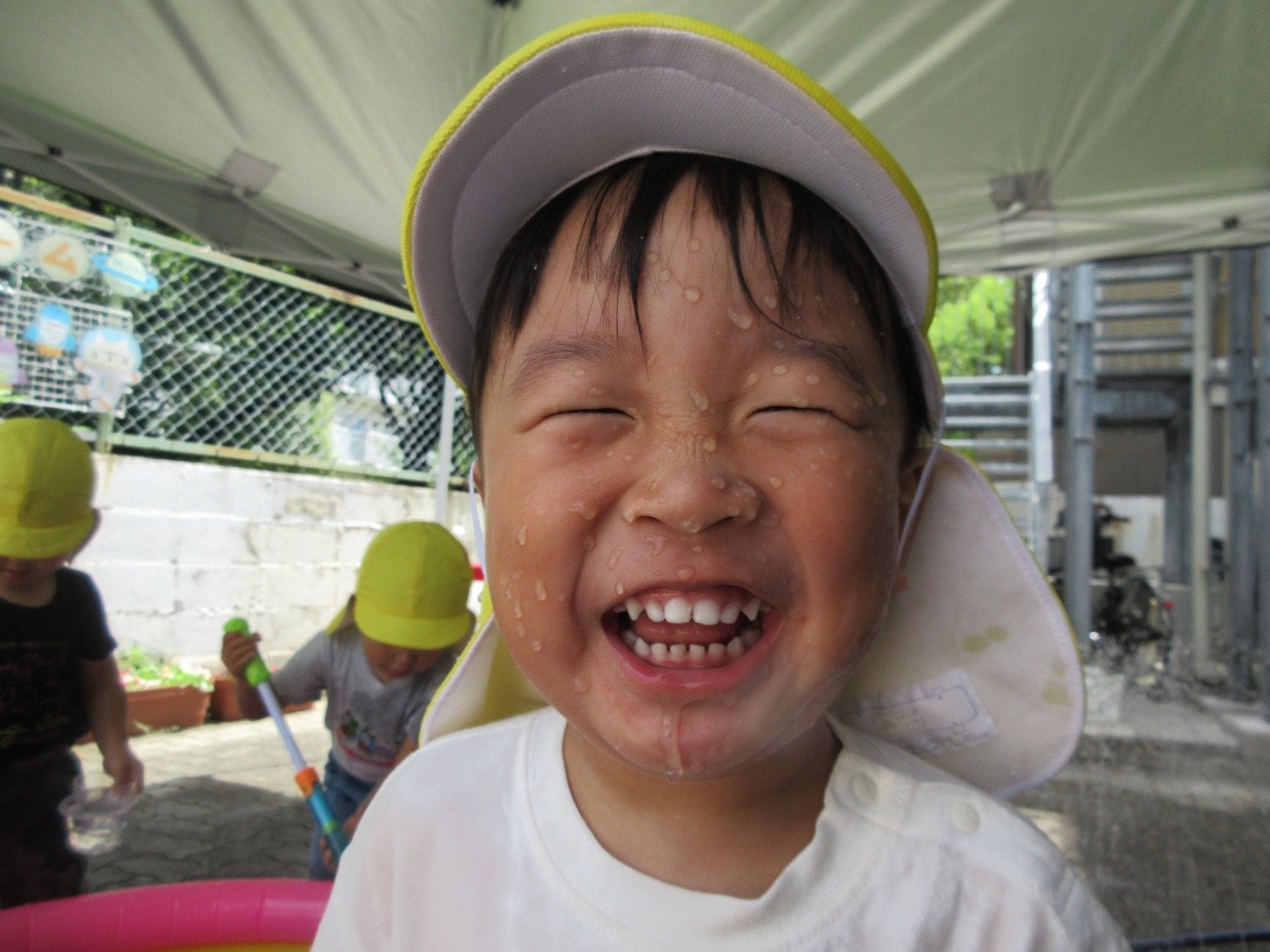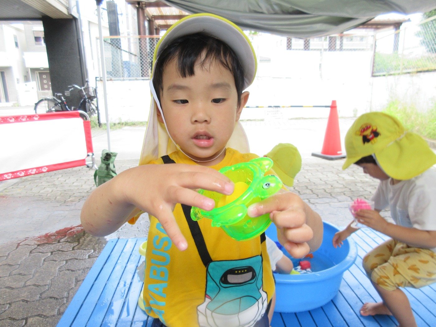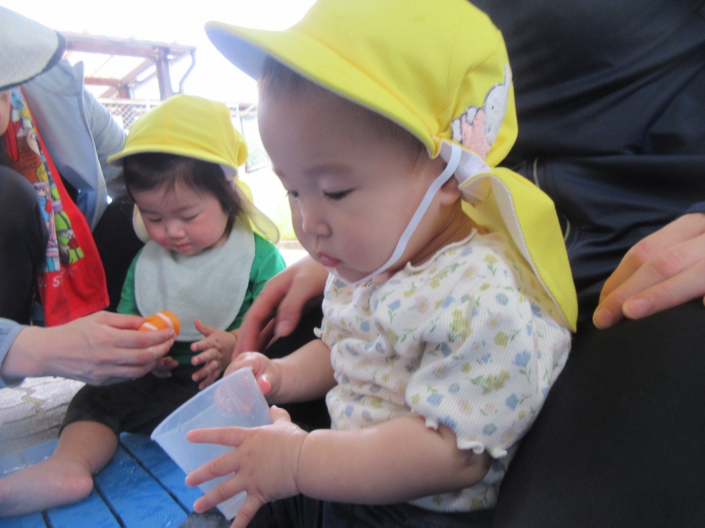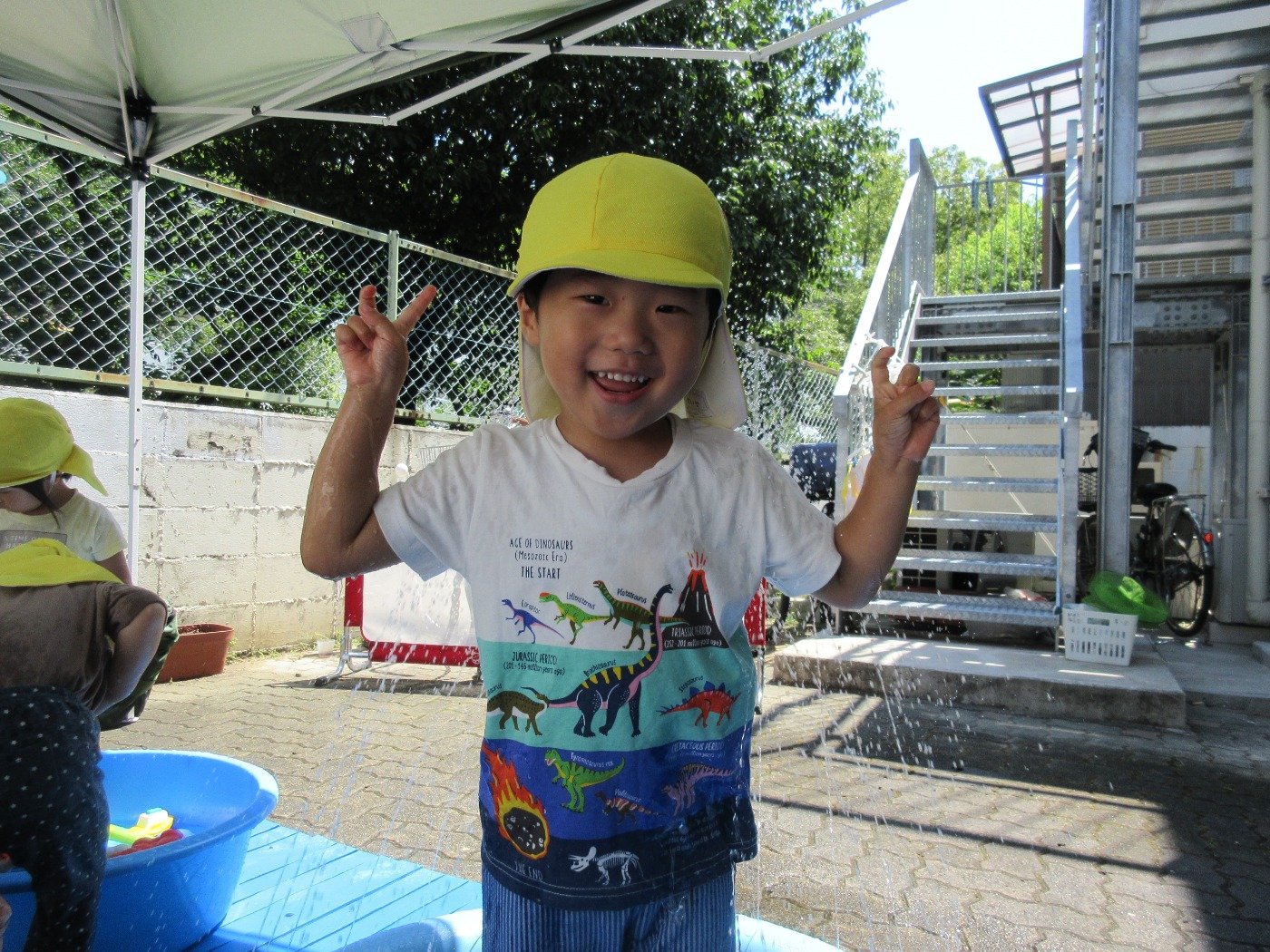 ひよこ組さんのお友だちは、初めての水遊びです。