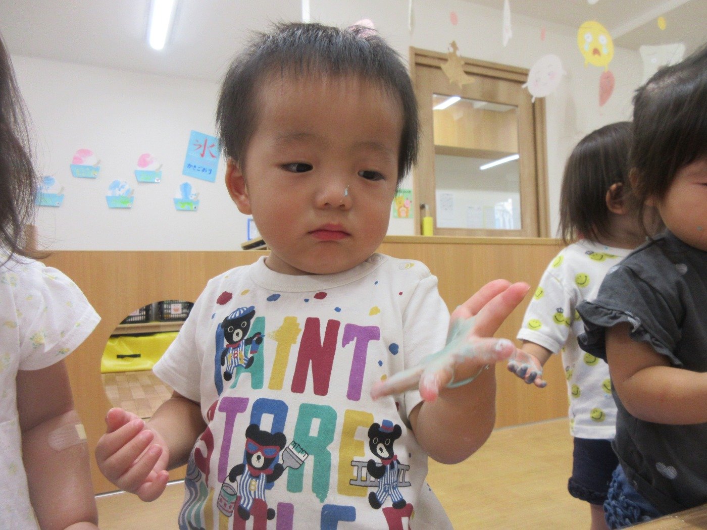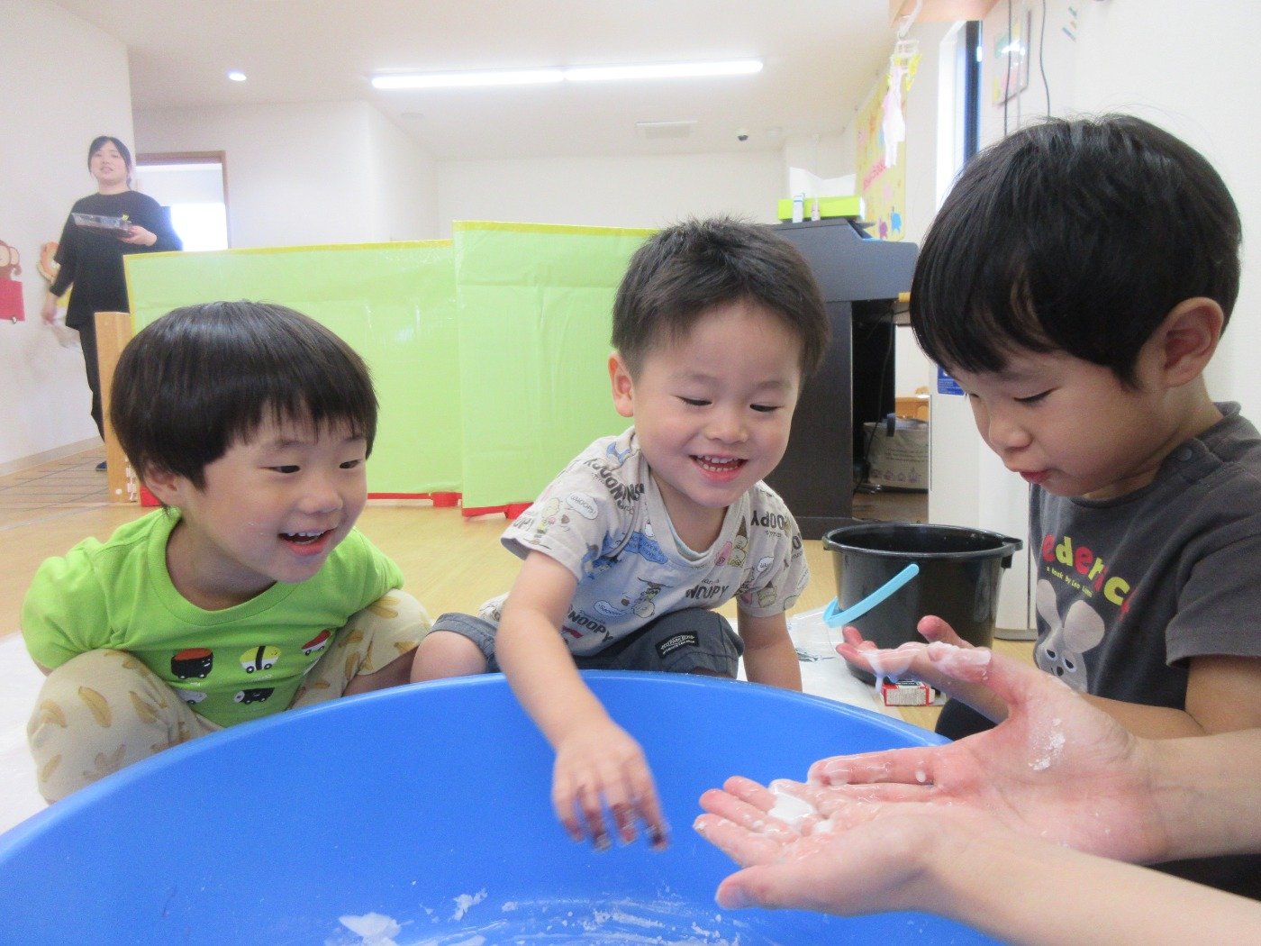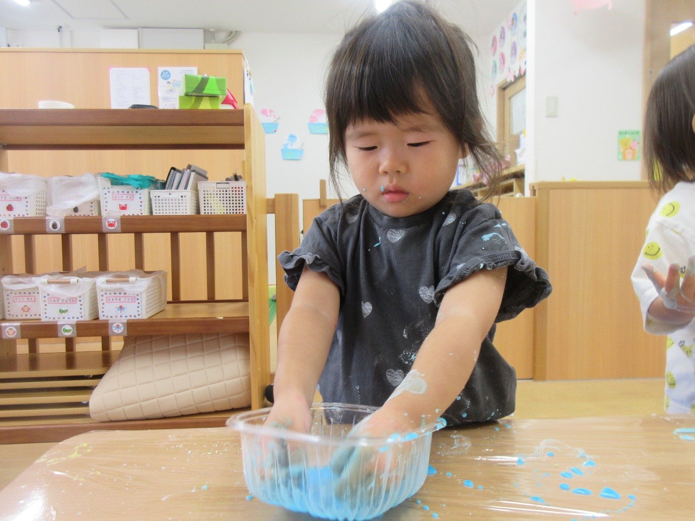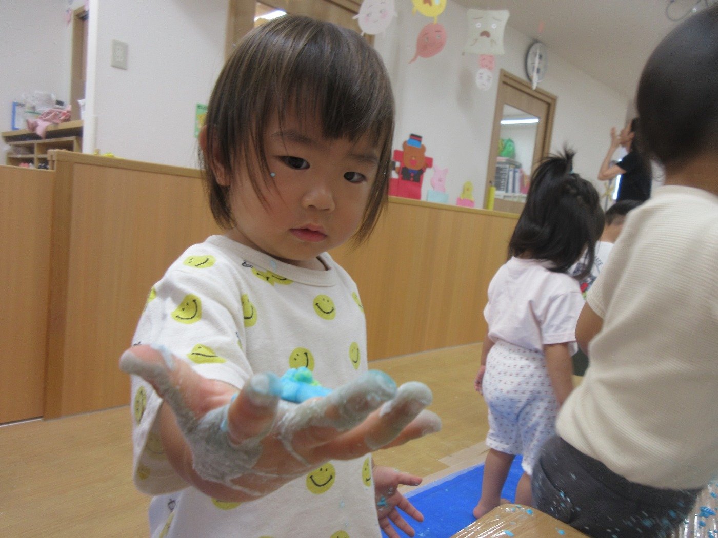 ひよこ組さんは、初めての片栗粉の感触に不思議そうな