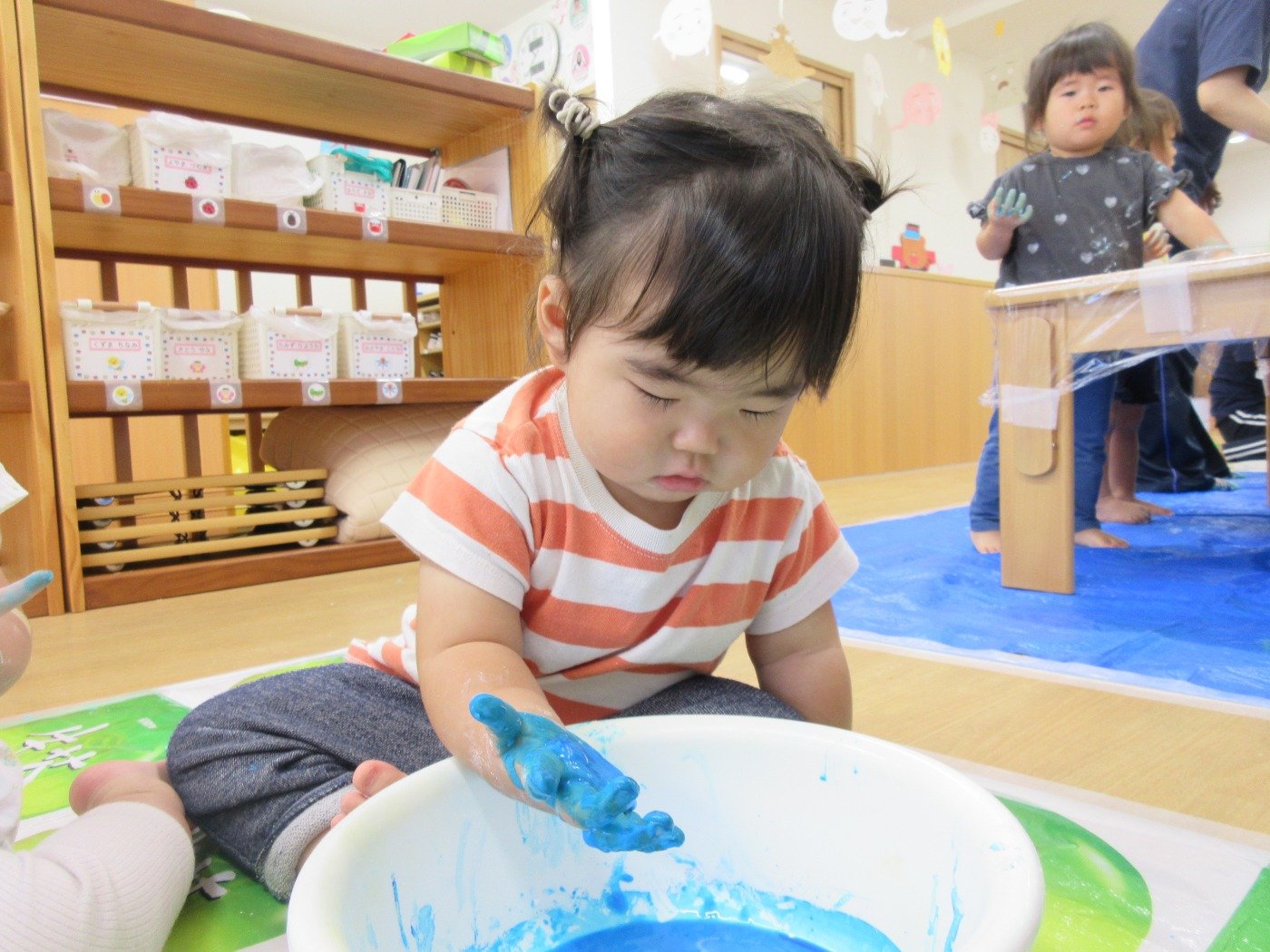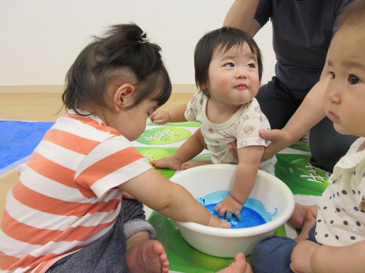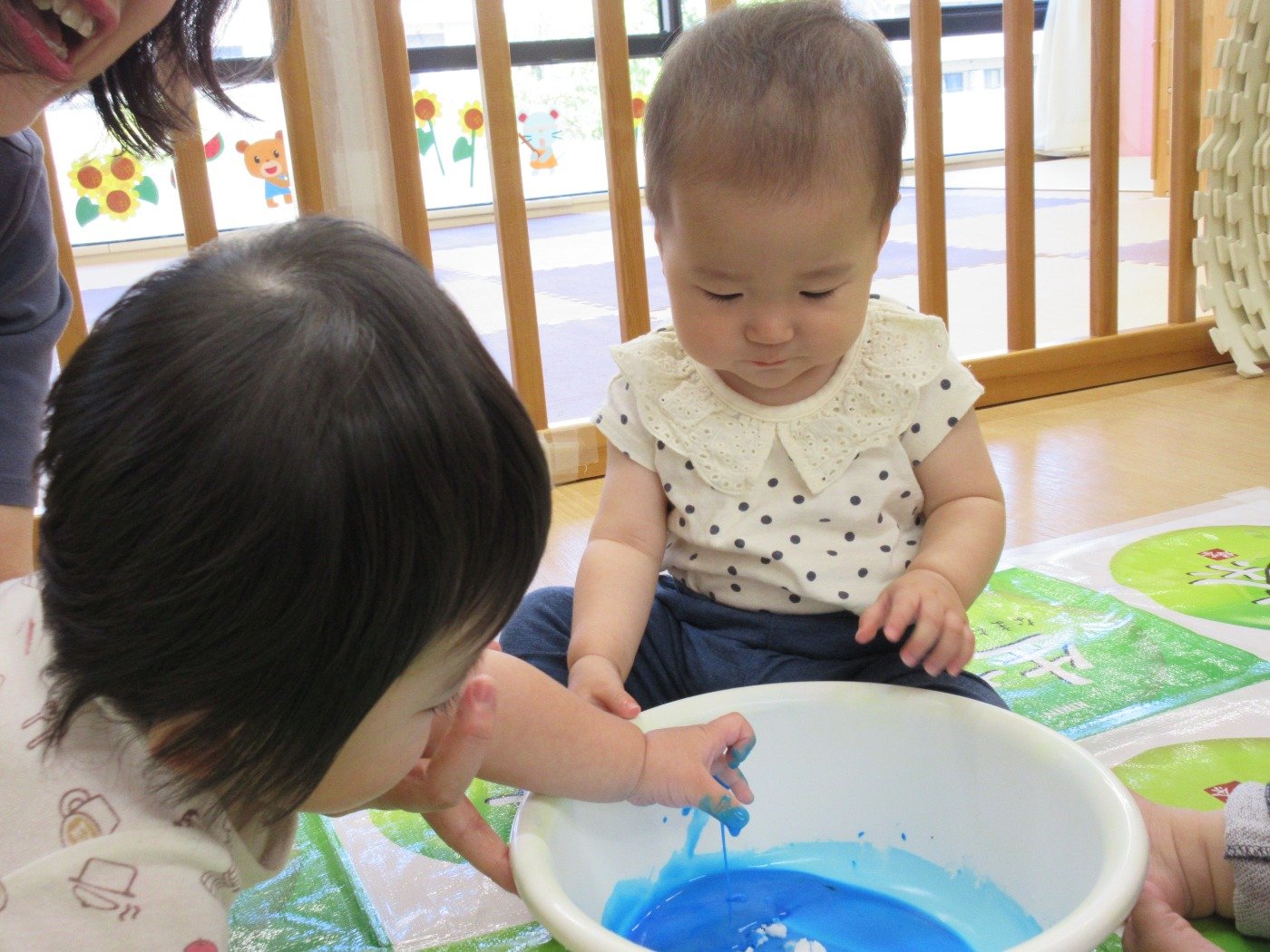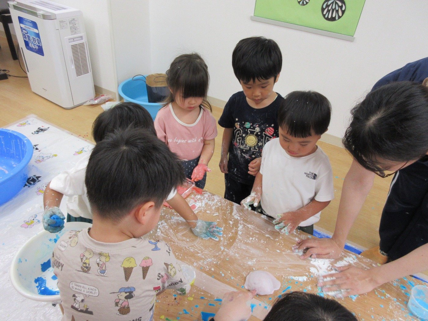 ひよこ組さんは、初めての片栗粉の感触に不思議そうな