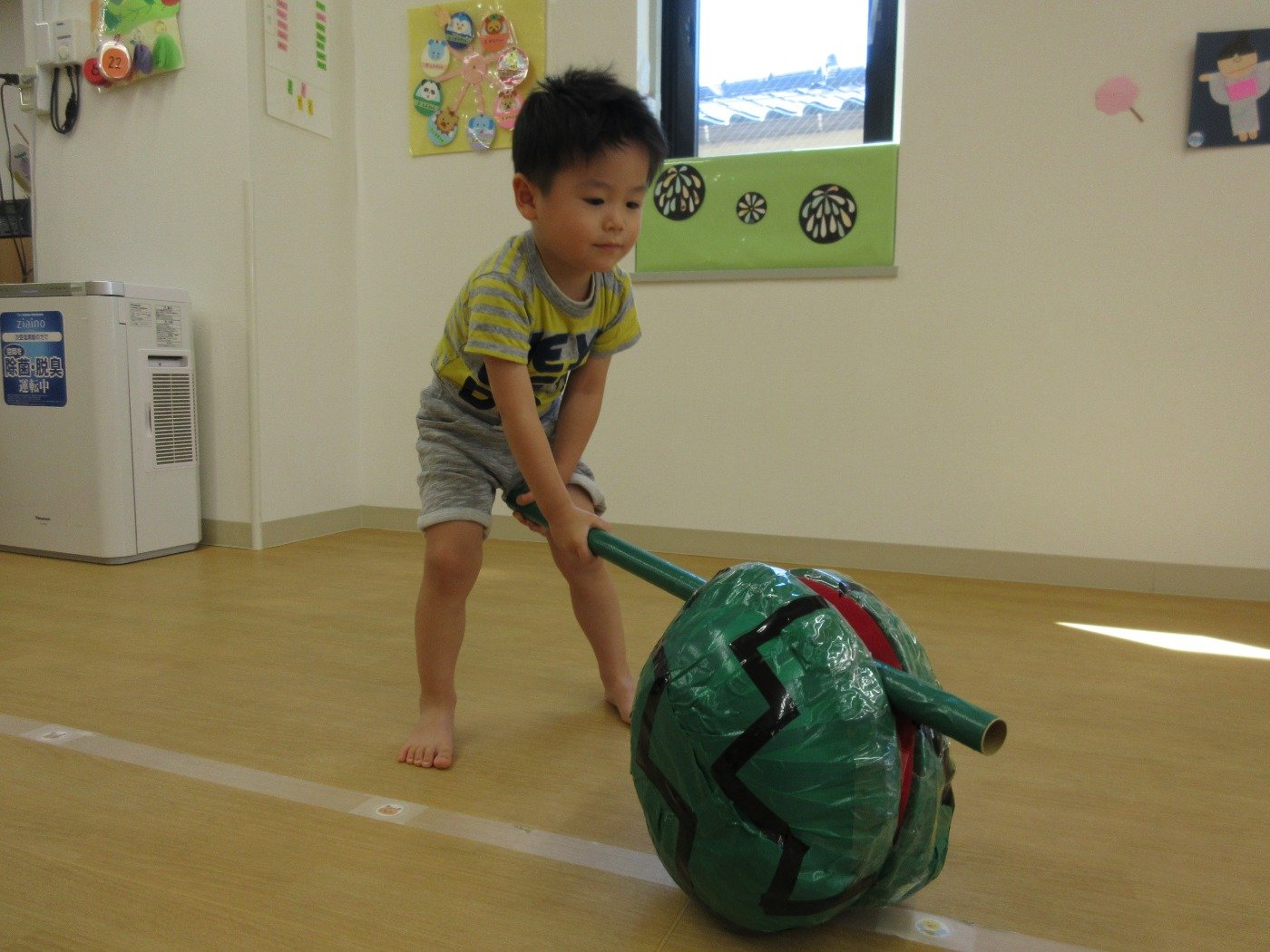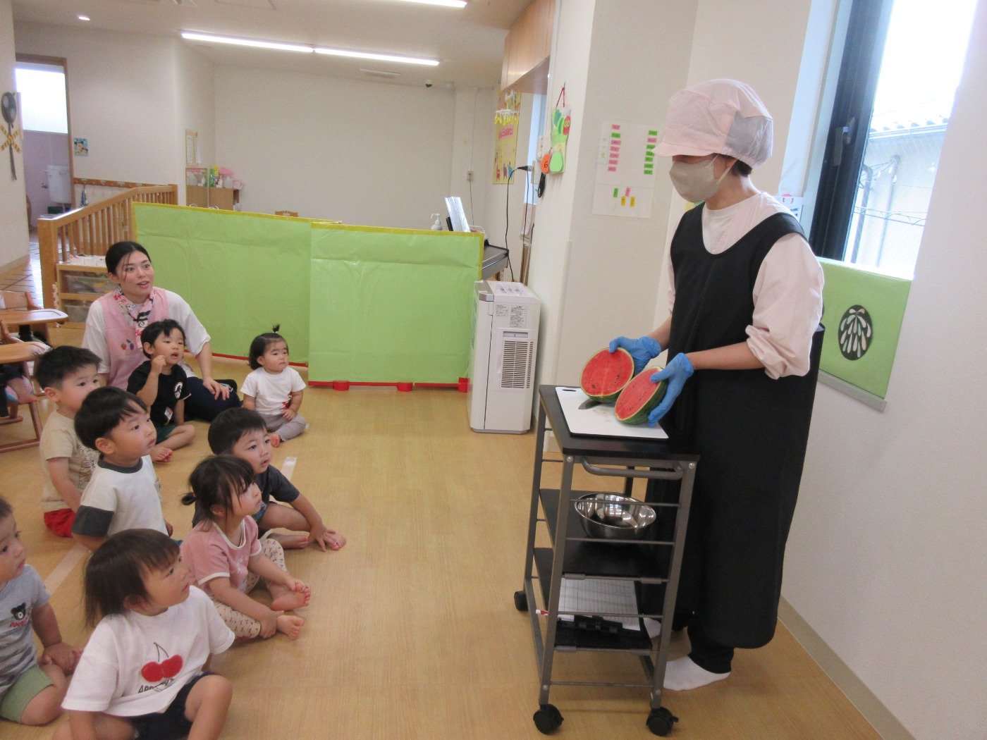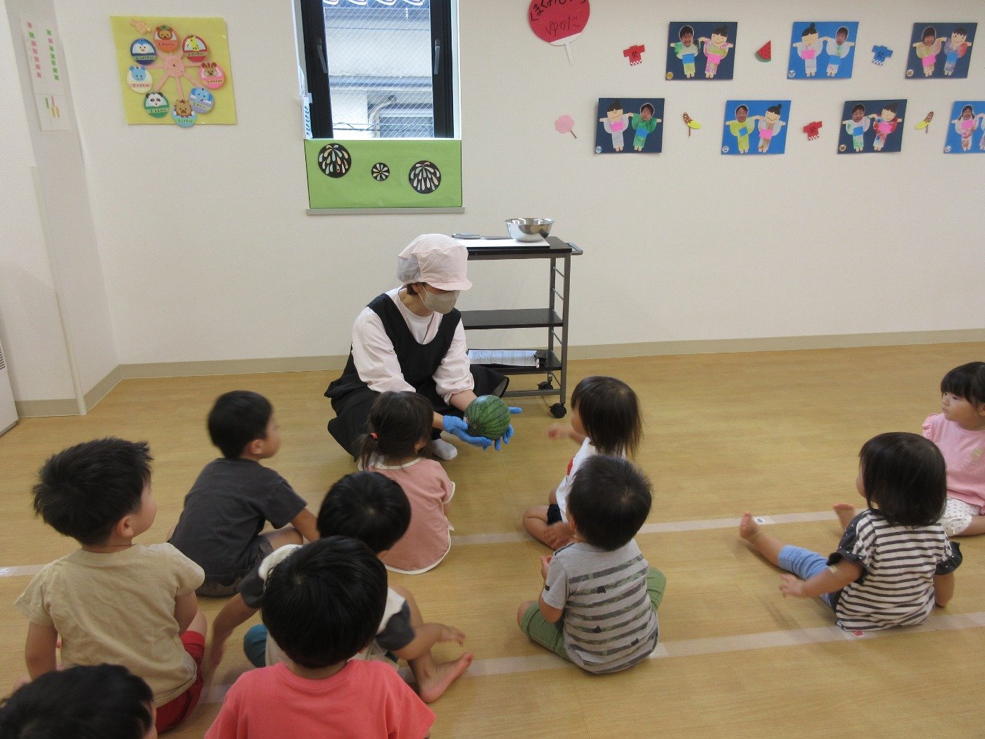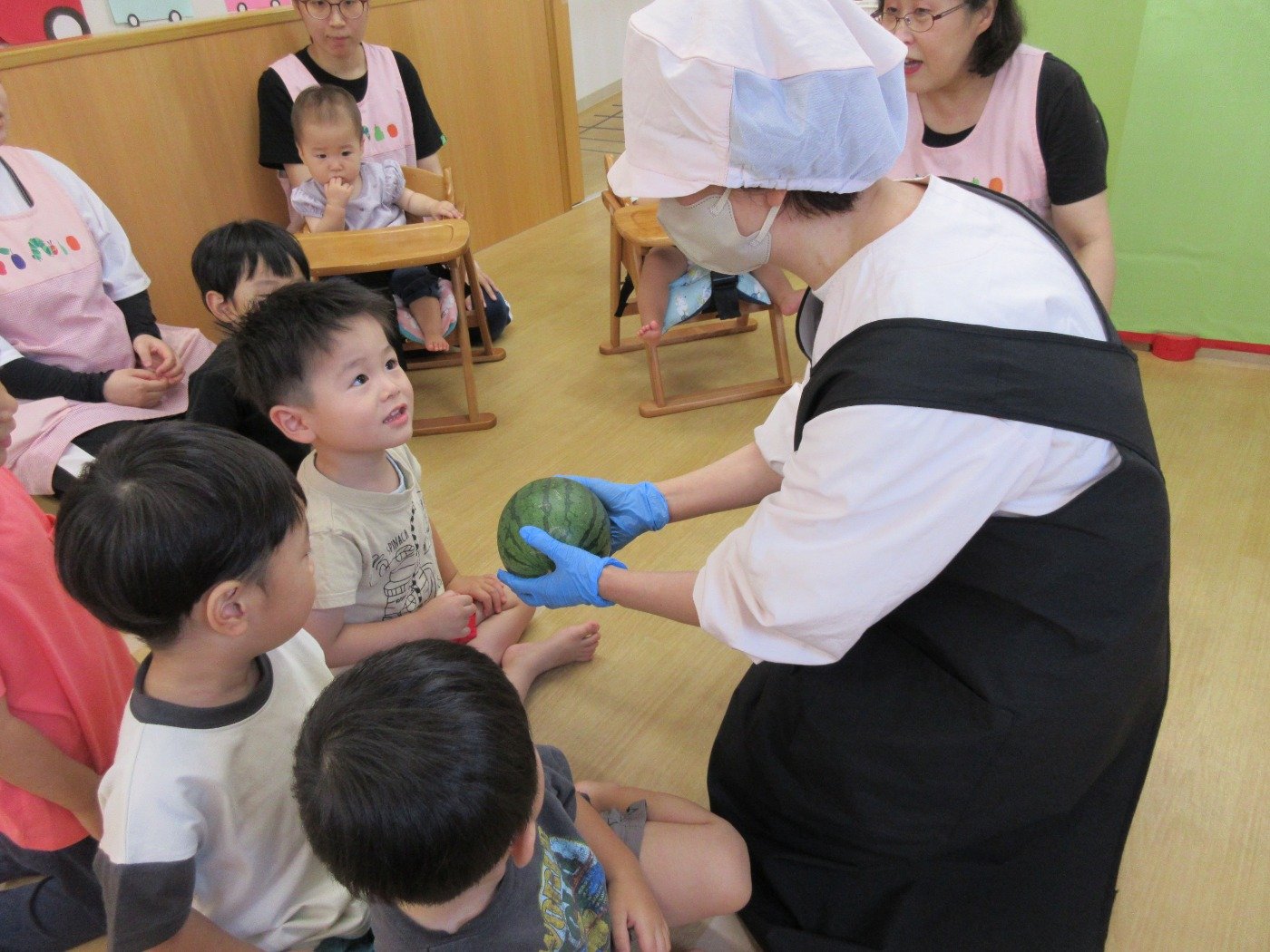 朝の会で、スイカが丸ごと登場しました。