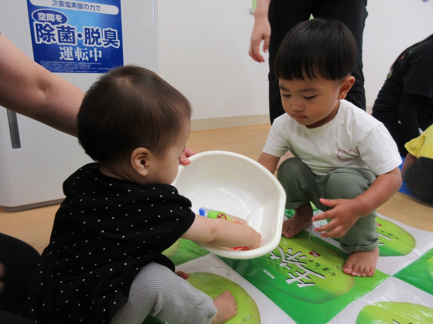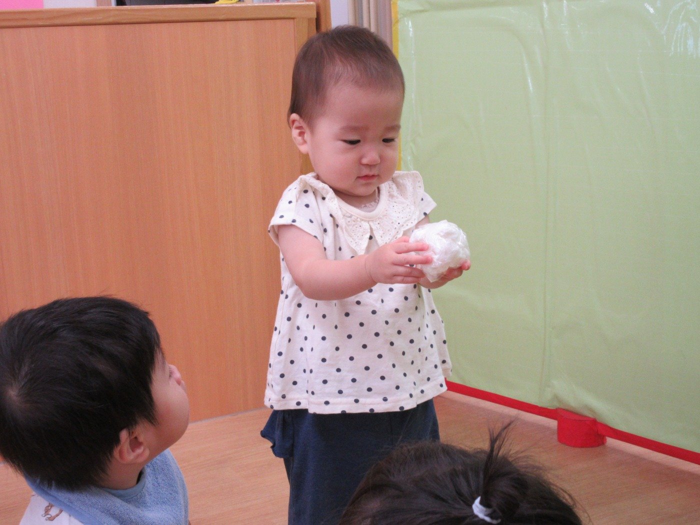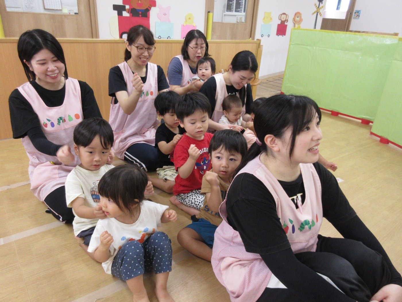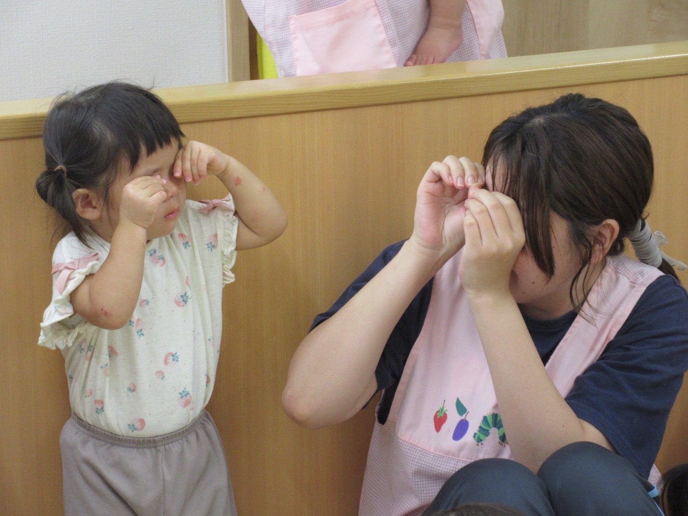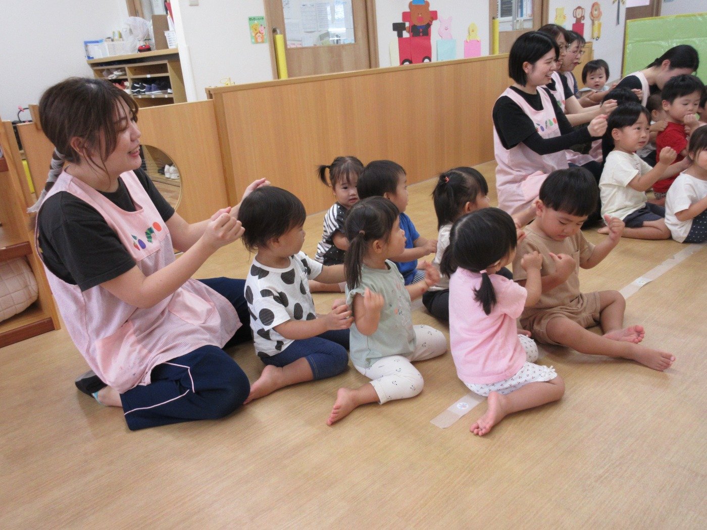 お部屋で「おせんたく」のふれあい遊びを楽しんでいるくま組さん。
